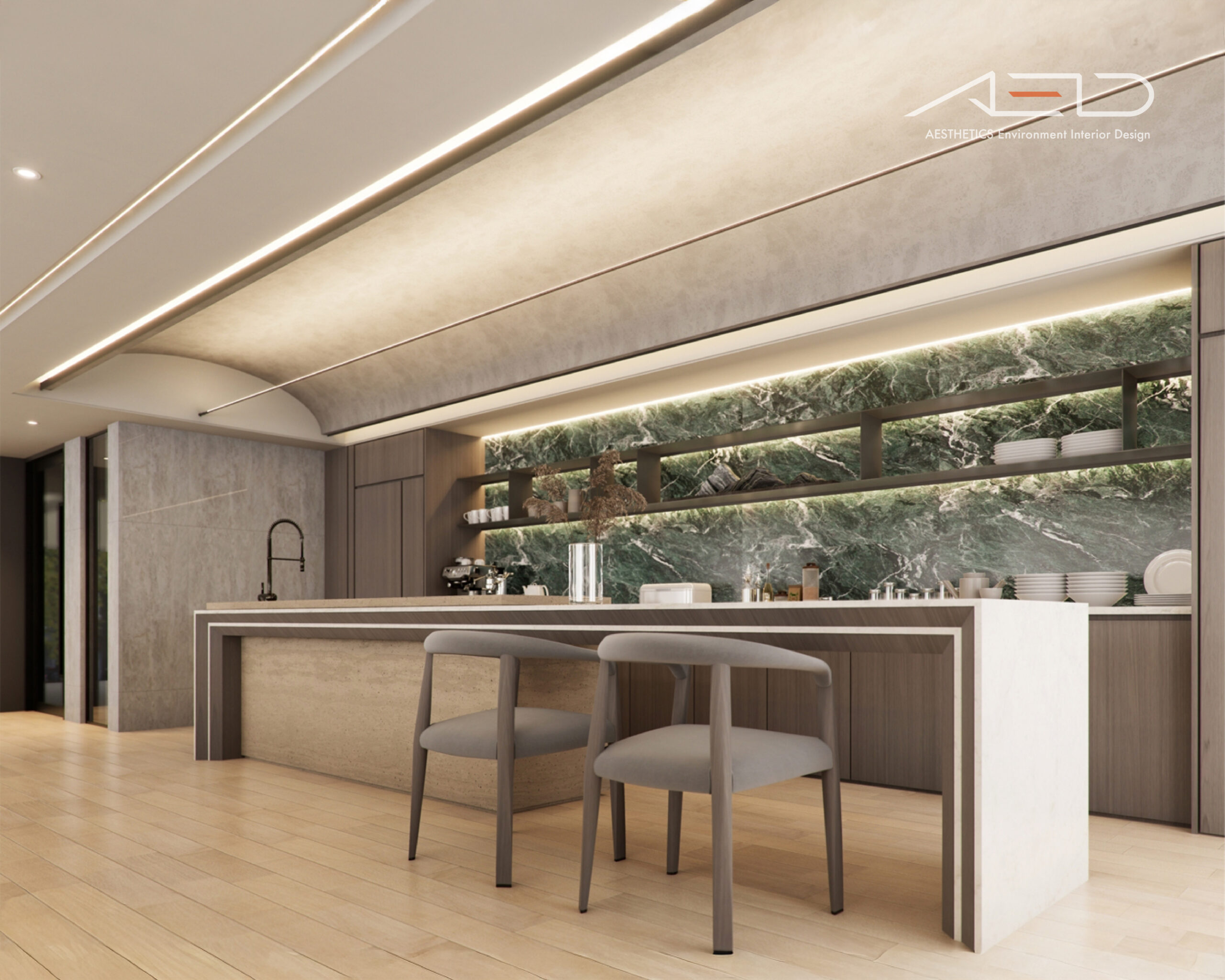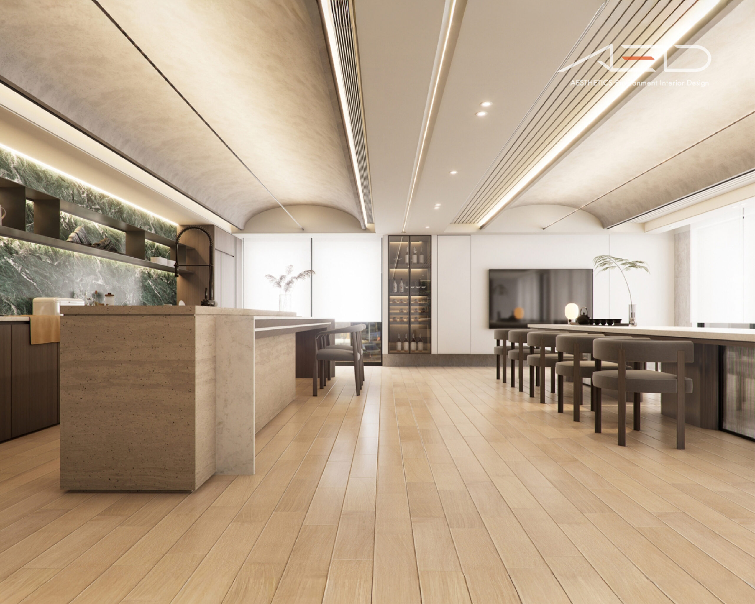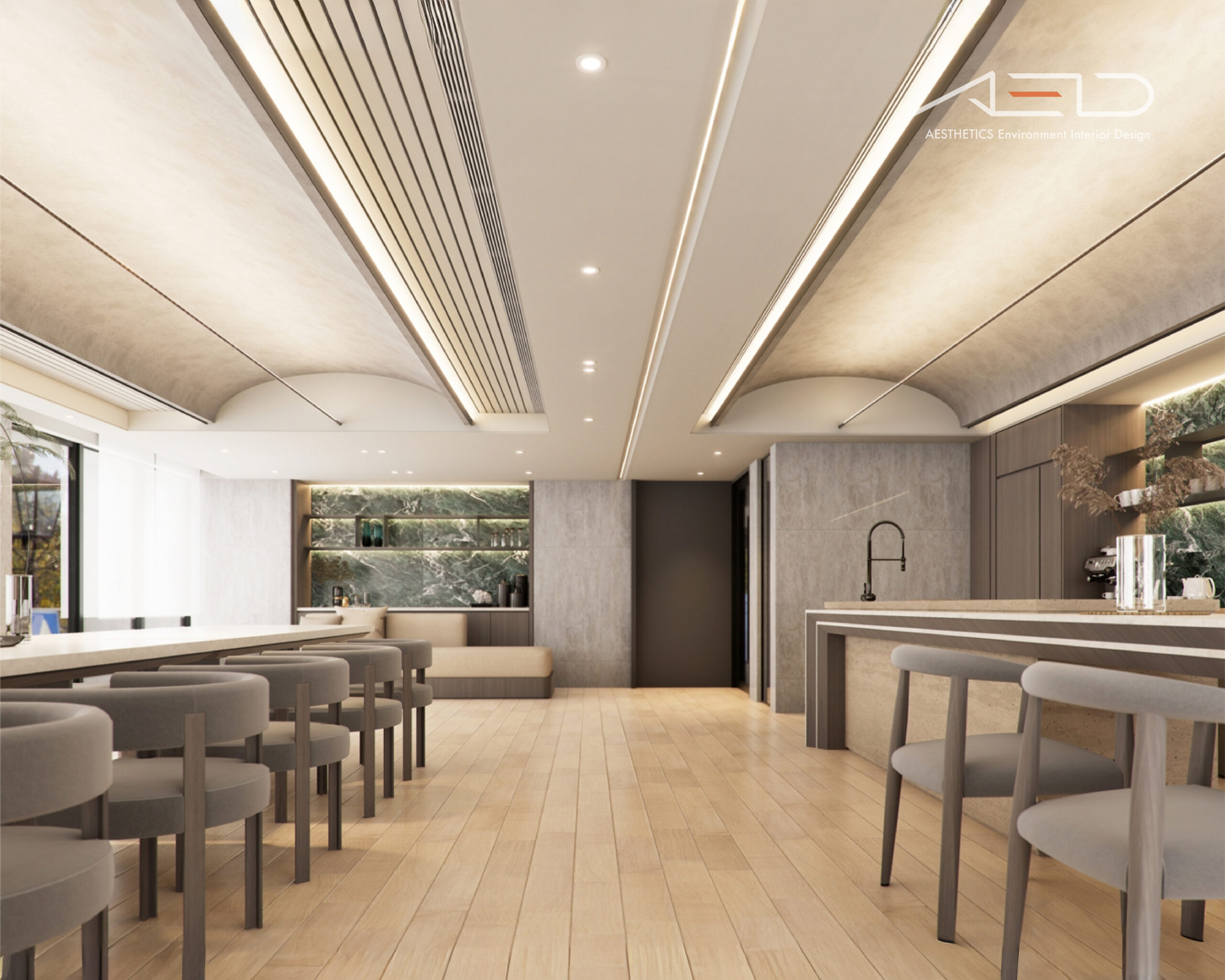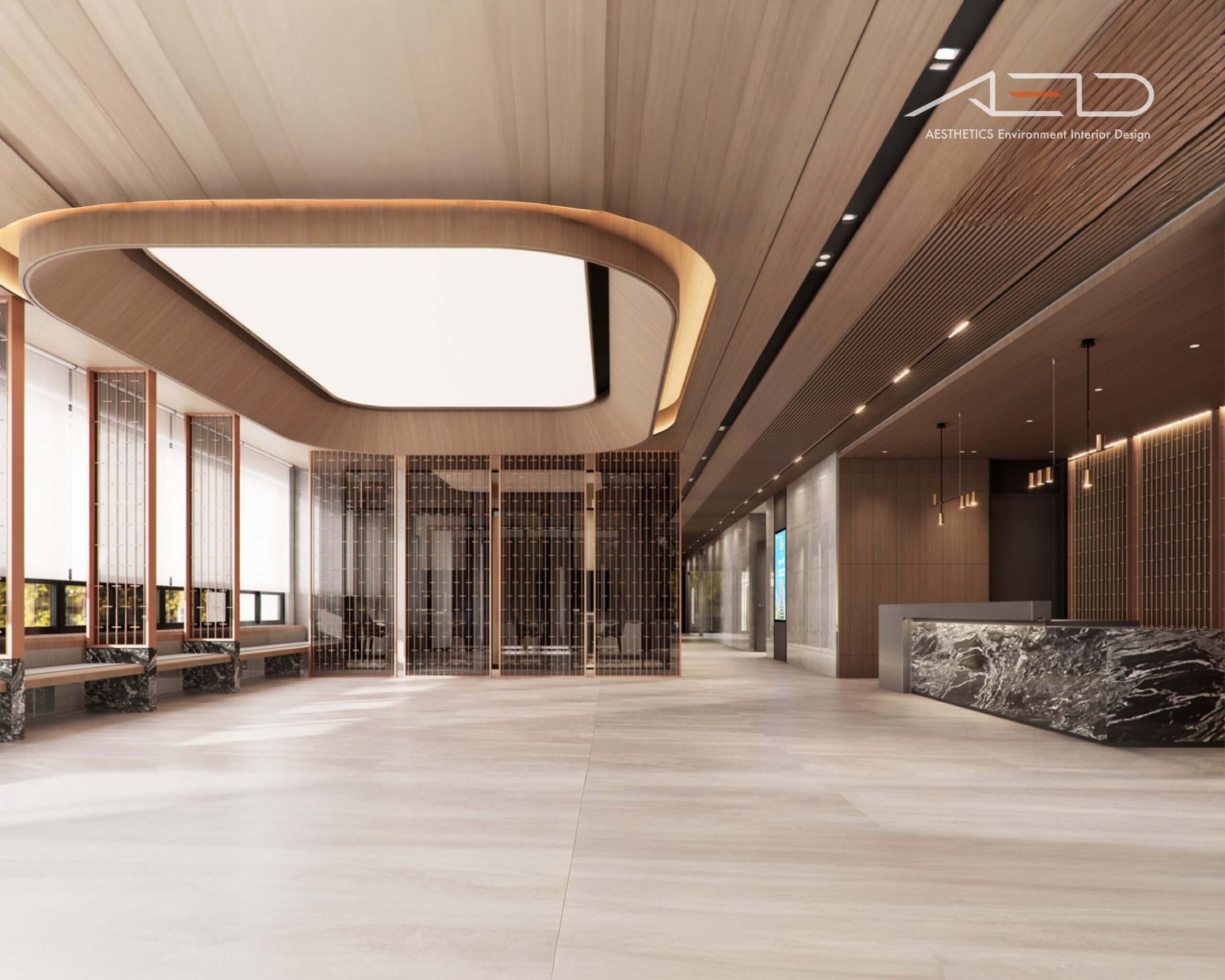 木紋作為主要材質語言,承載著人文的溫度與歲月的痕跡。溫潤的觸感與細膩的紋理,使空間在視覺與感受上皆顯得親近而安定,讓公共場域不再只是通道,而是一處可以停留的所在。