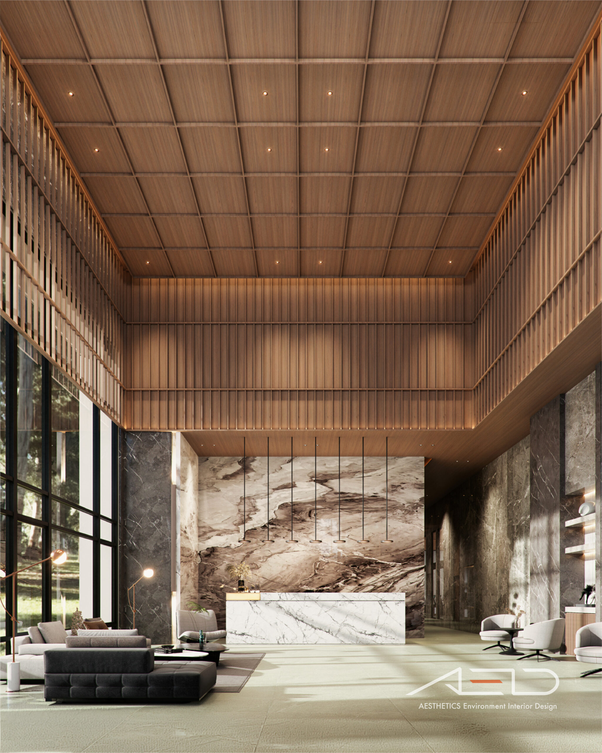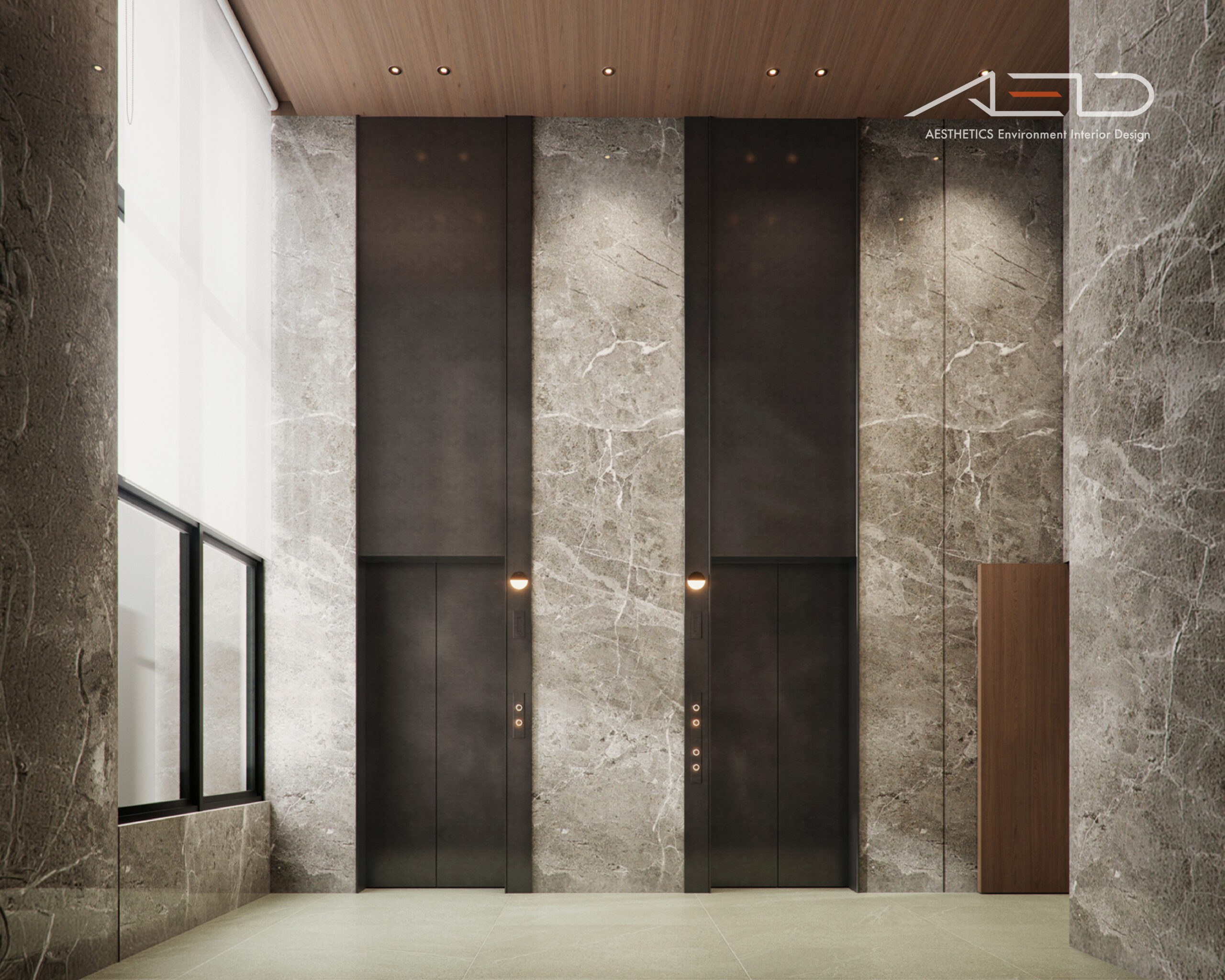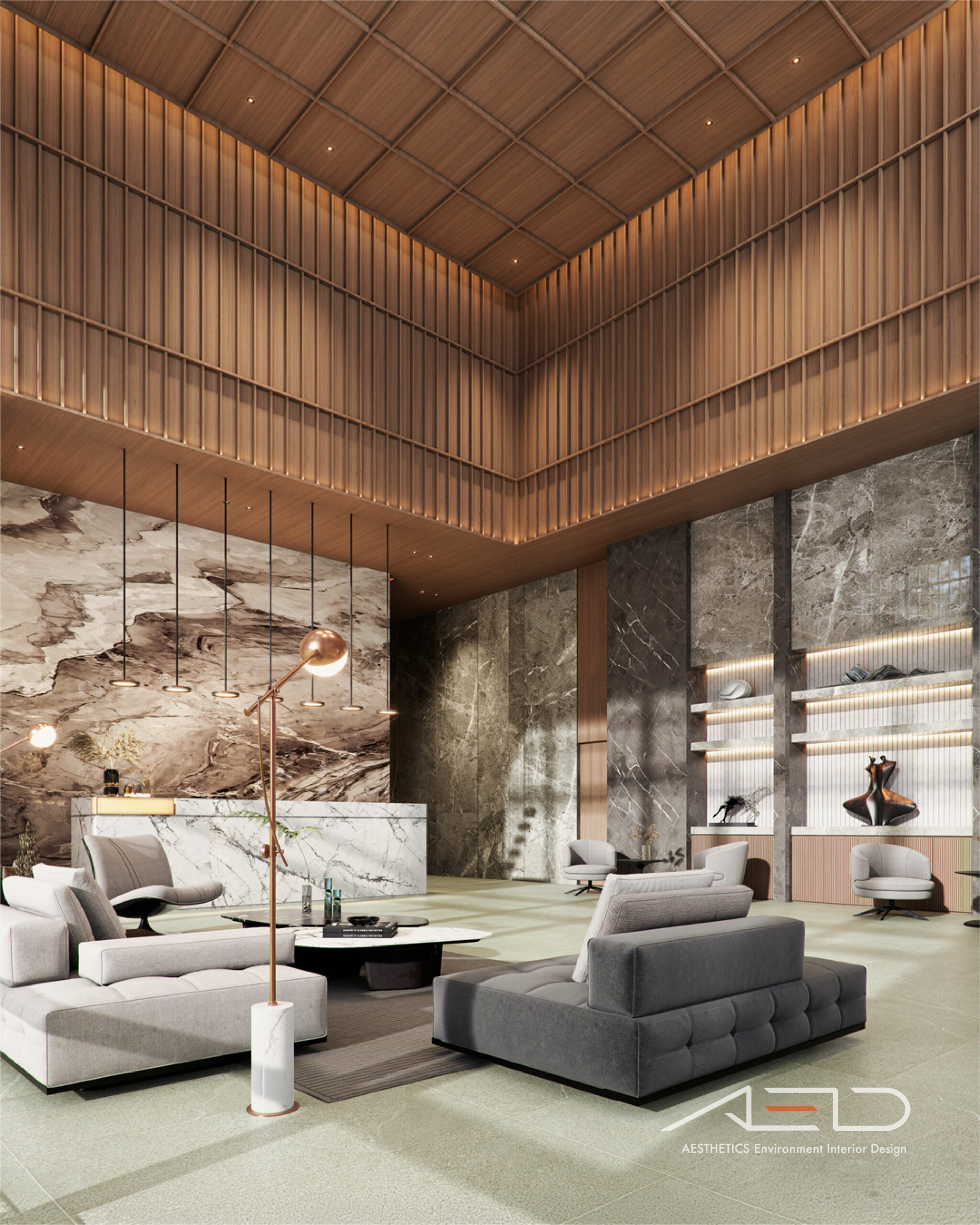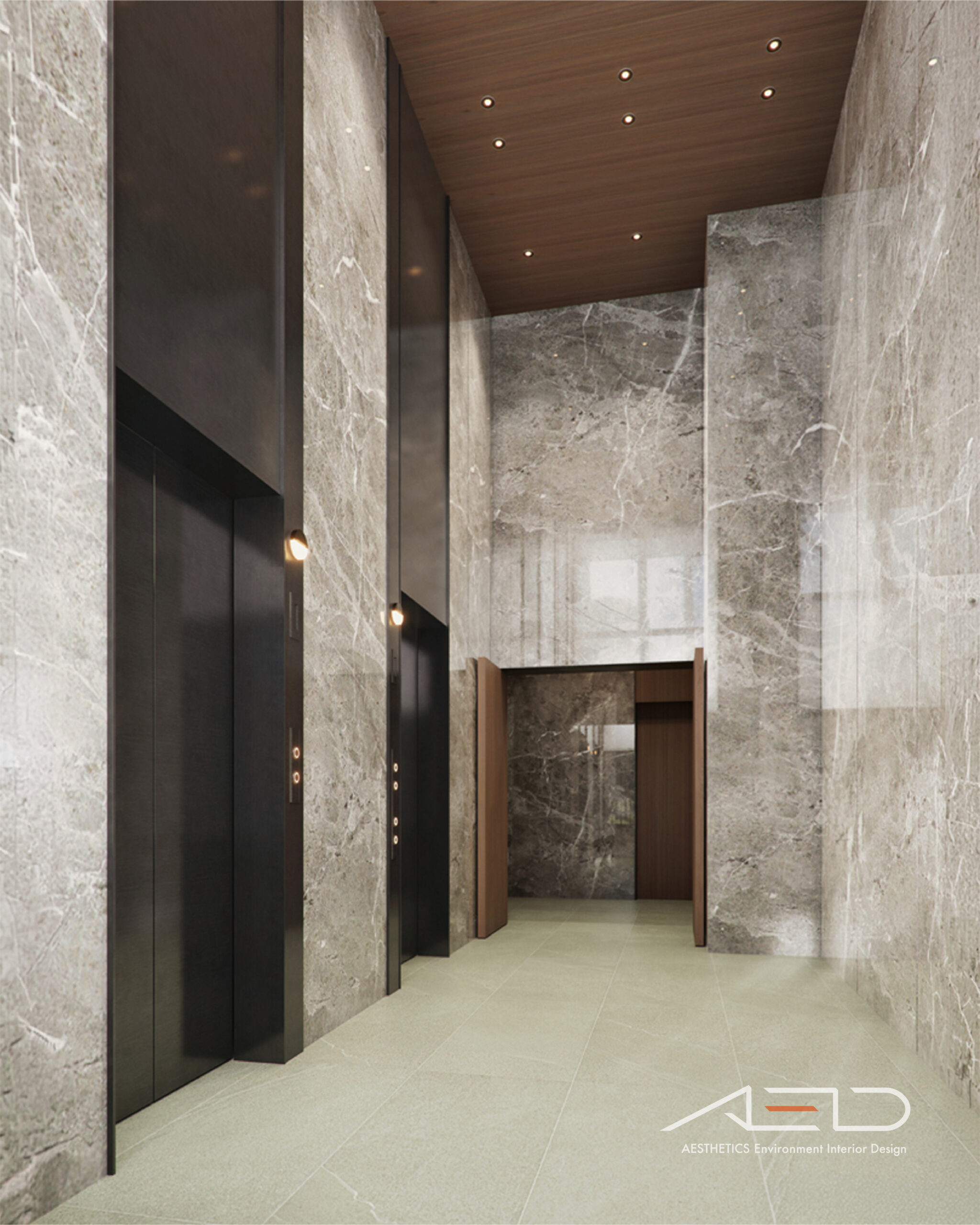 公設空間以挑高尺度展開,透過垂直量體拉開城市與日常之間的距離。大理石鋪陳出沉穩且內斂的基底,木皮天花板則以溫潤紋理回應人的尺度,使空間在宏觀氣勢中保有細膩溫度。光影順著高度流動,層層堆疊出安定而從容的公共場域,成為城市節奏中的一處靜謐停留。
