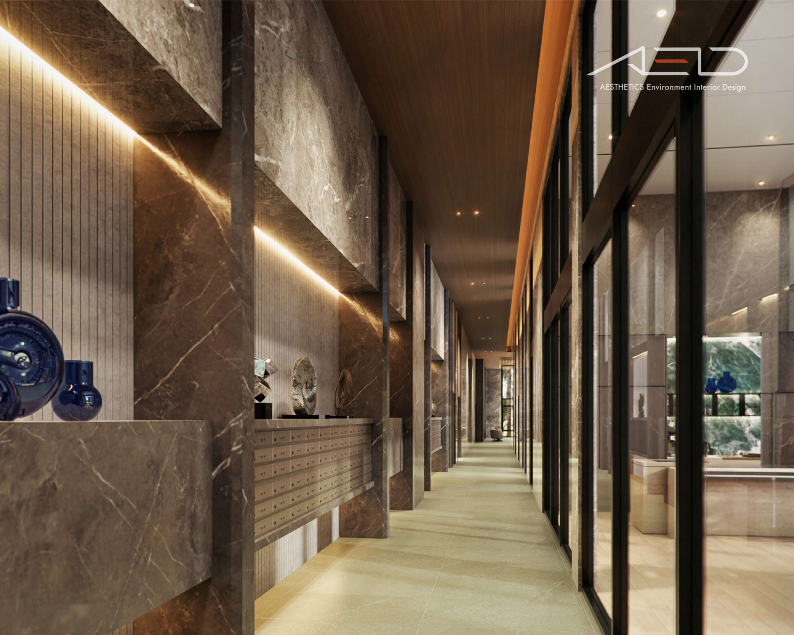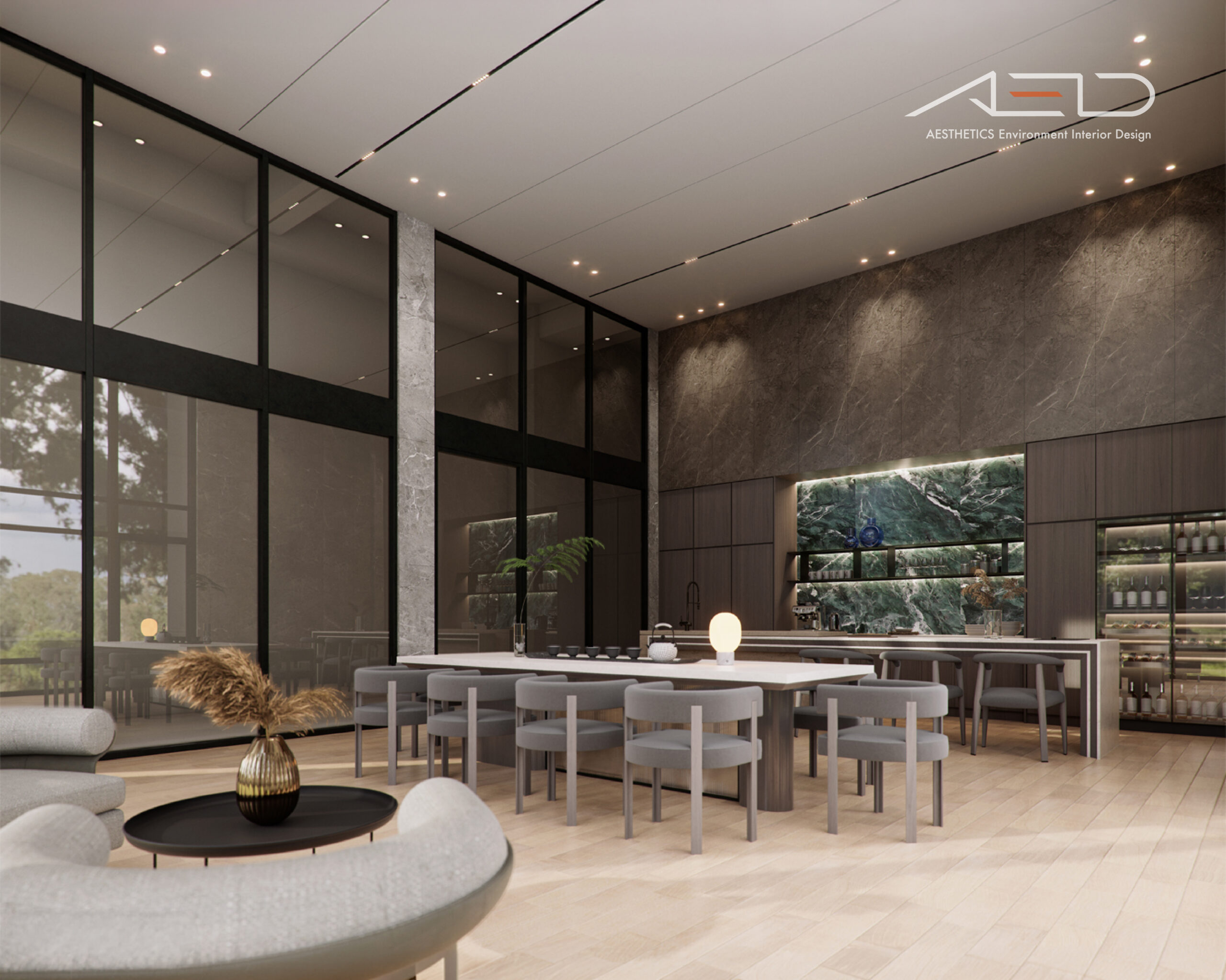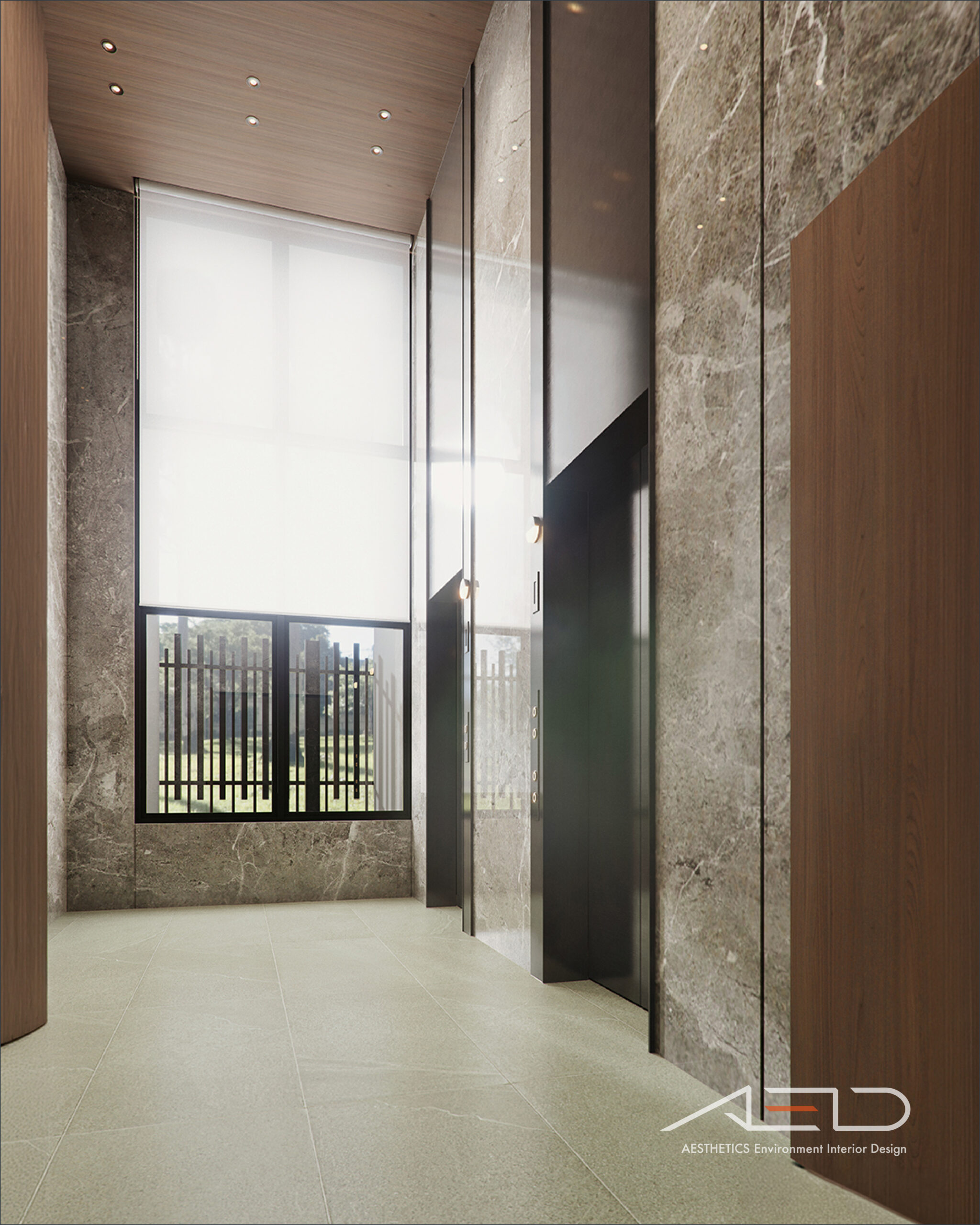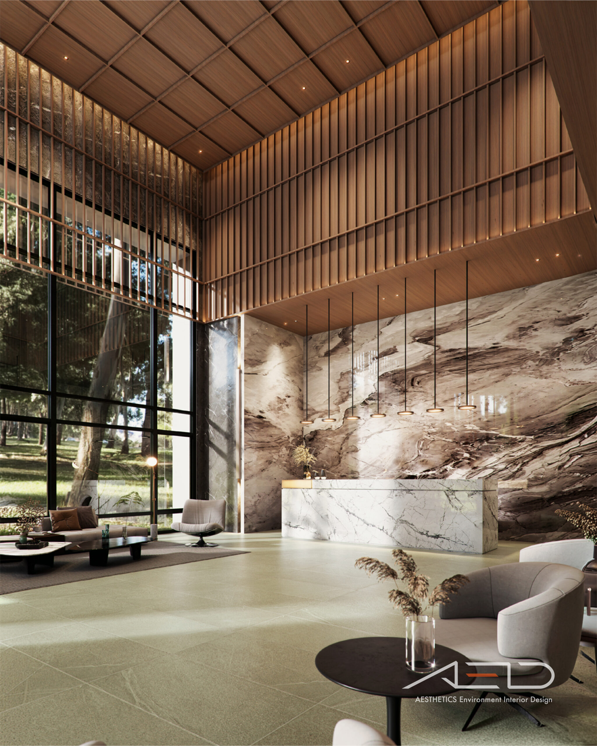 公設空間以挑高尺度展開,透過垂直量體拉開城市與日常之間的距離。大理石鋪陳出沉穩且內斂的基底,木皮天花板則以溫潤紋理回應人的尺度,使空間在宏觀氣勢中保有細膩溫度。光影順著高度流動,層層堆疊出安定而從容的公共場域,成為城市節奏中的一處靜謐停留。