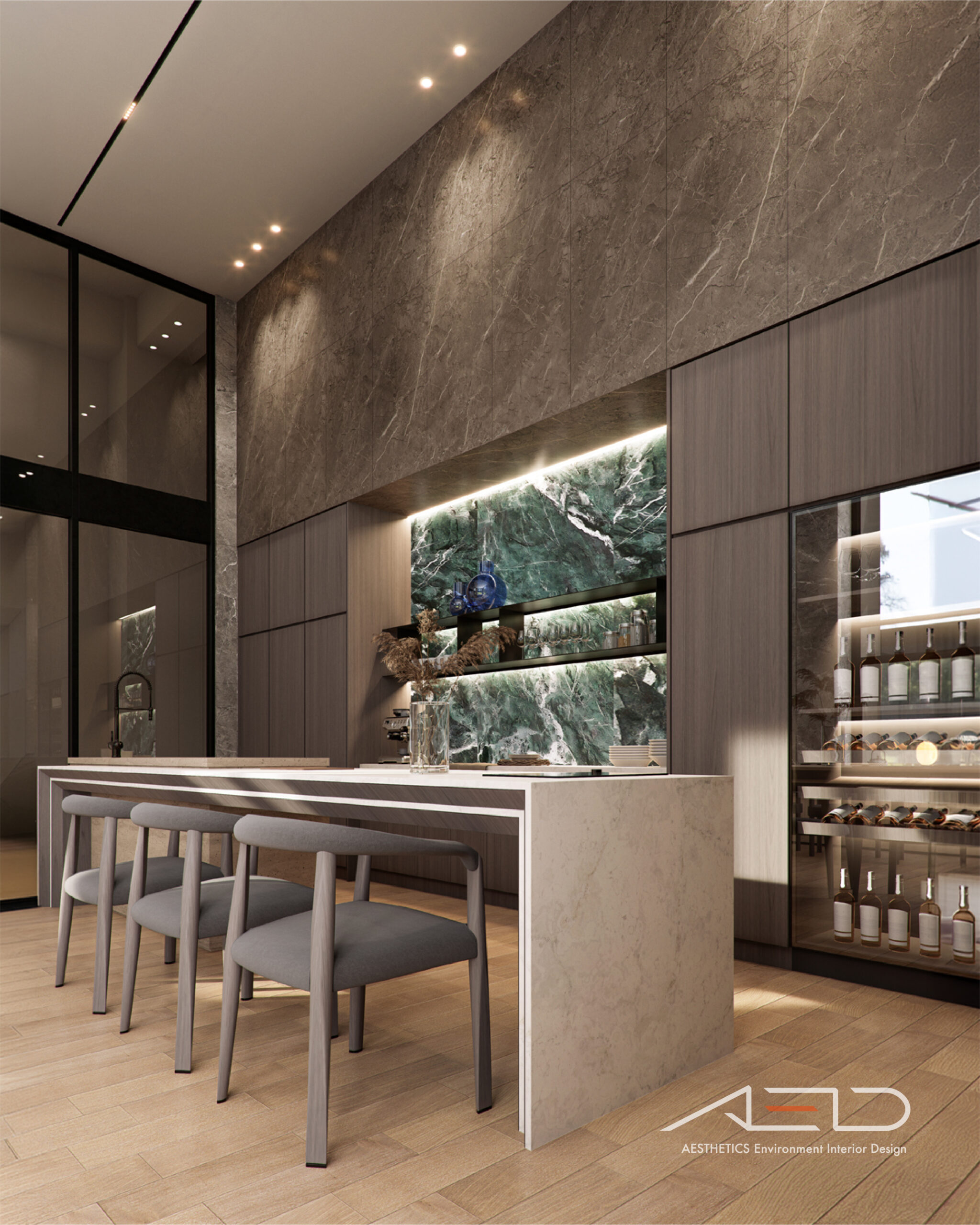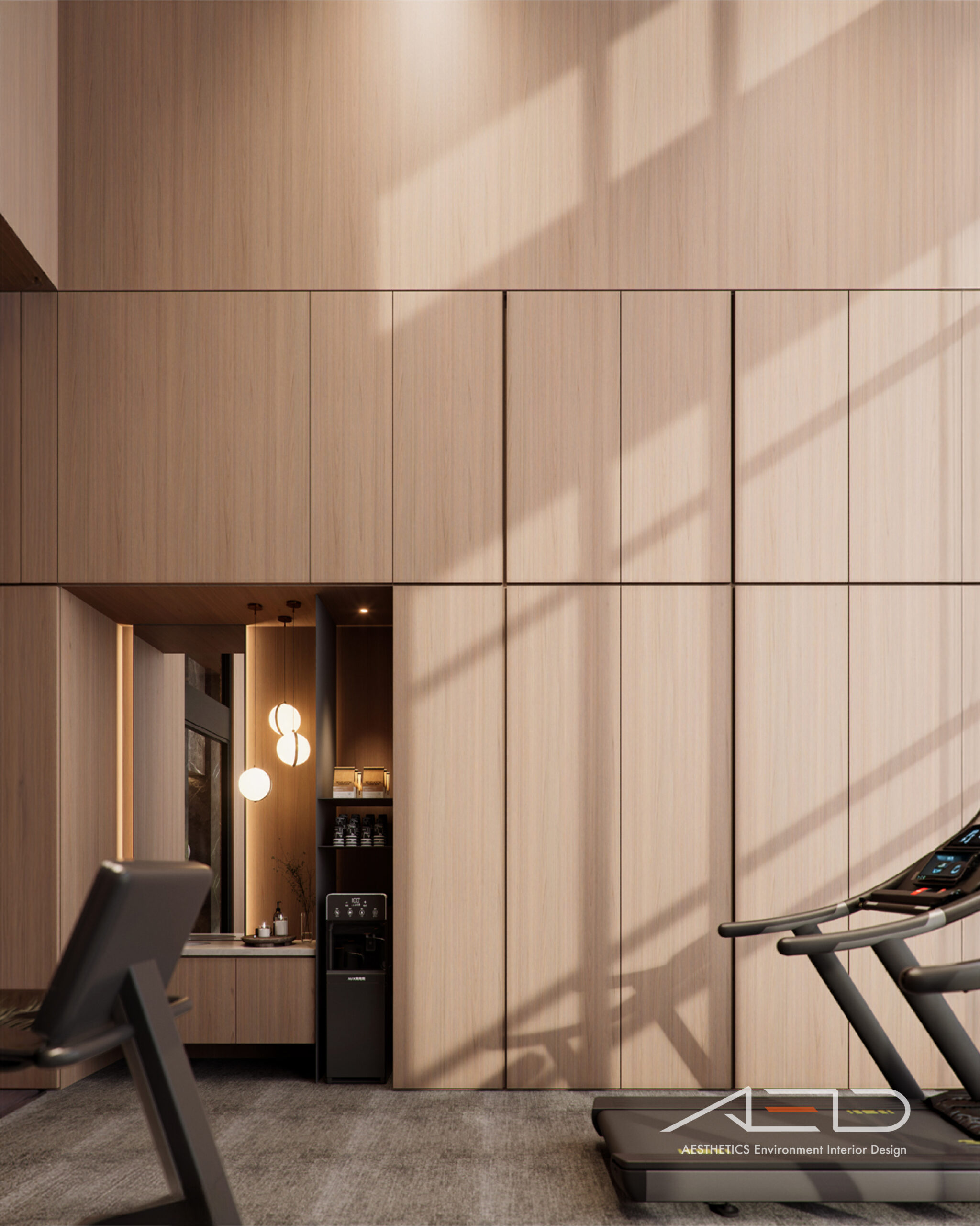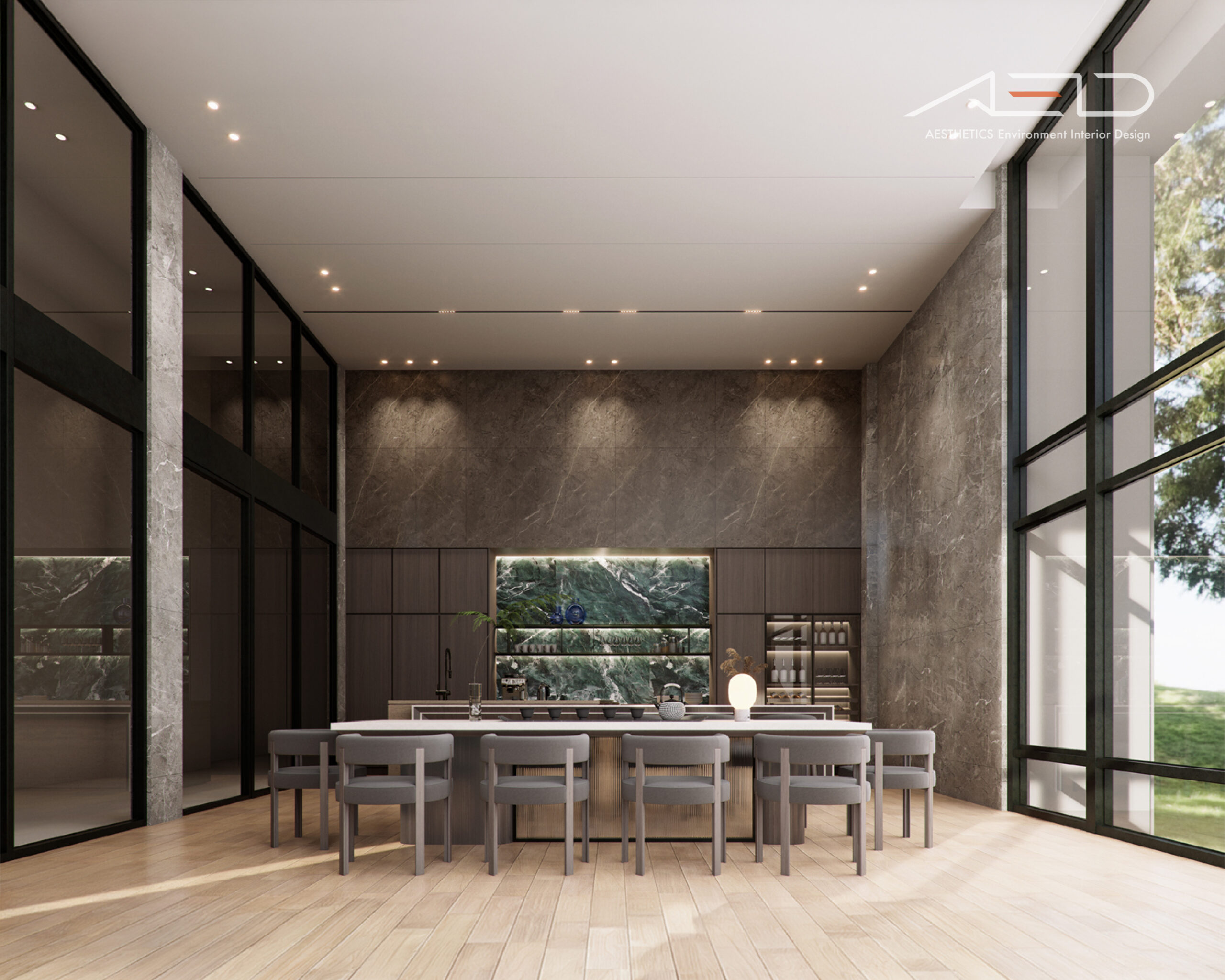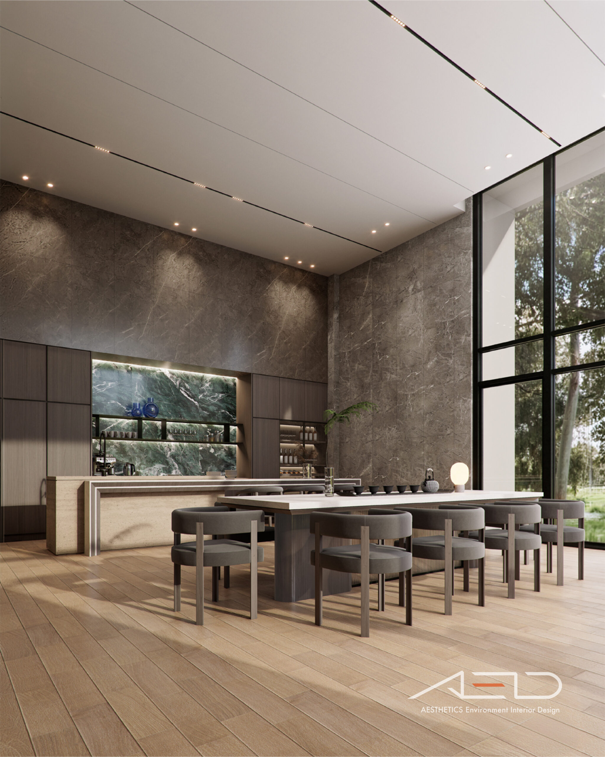 公設空間以挑高尺度展開,透過垂直量體拉開城市與日常之間的距離。大理石鋪陳出沉穩且內斂的基底,木皮天花板則以溫潤紋理回應人的尺度,使空間在宏觀氣勢中保有細膩溫度。光影順著高度流動,層層堆疊出安定而從容的公共場域,成為城市節奏中的一處靜謐停留。