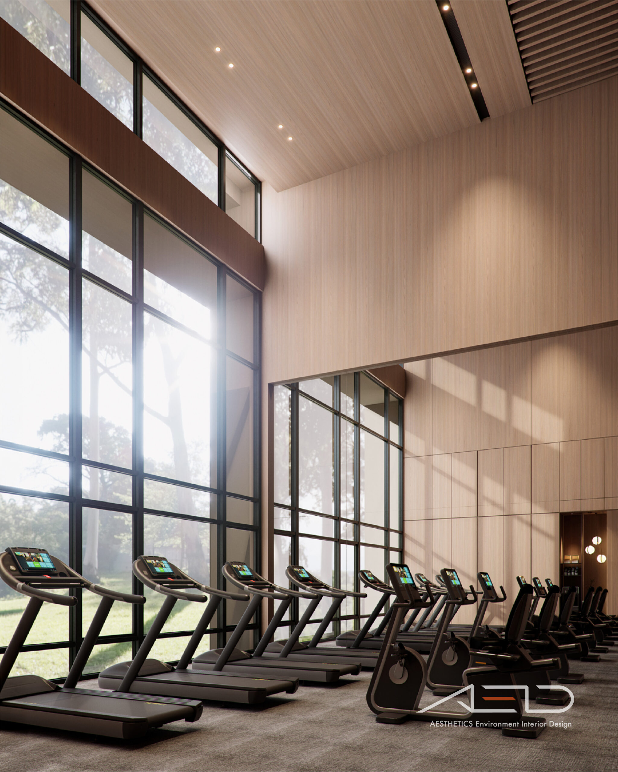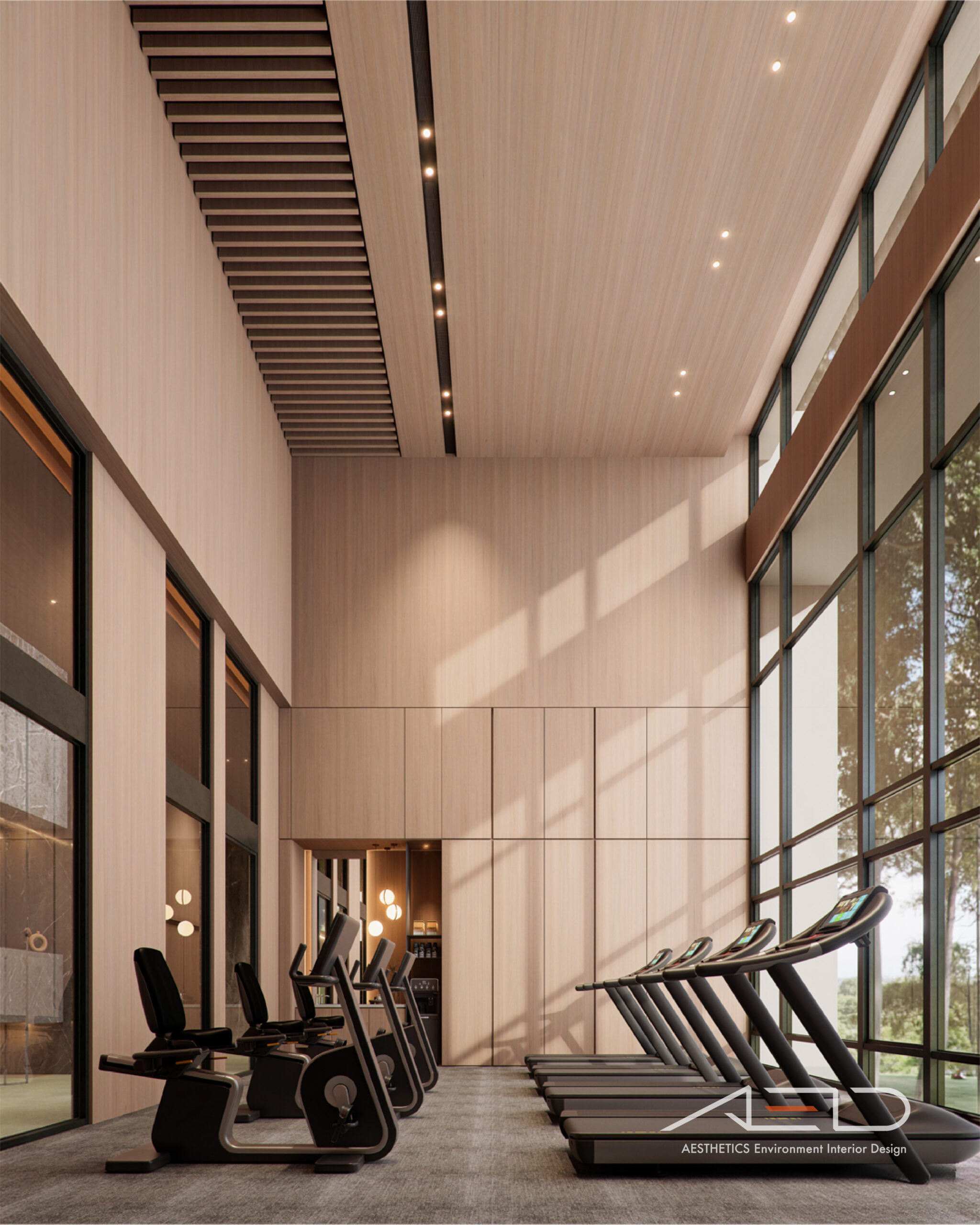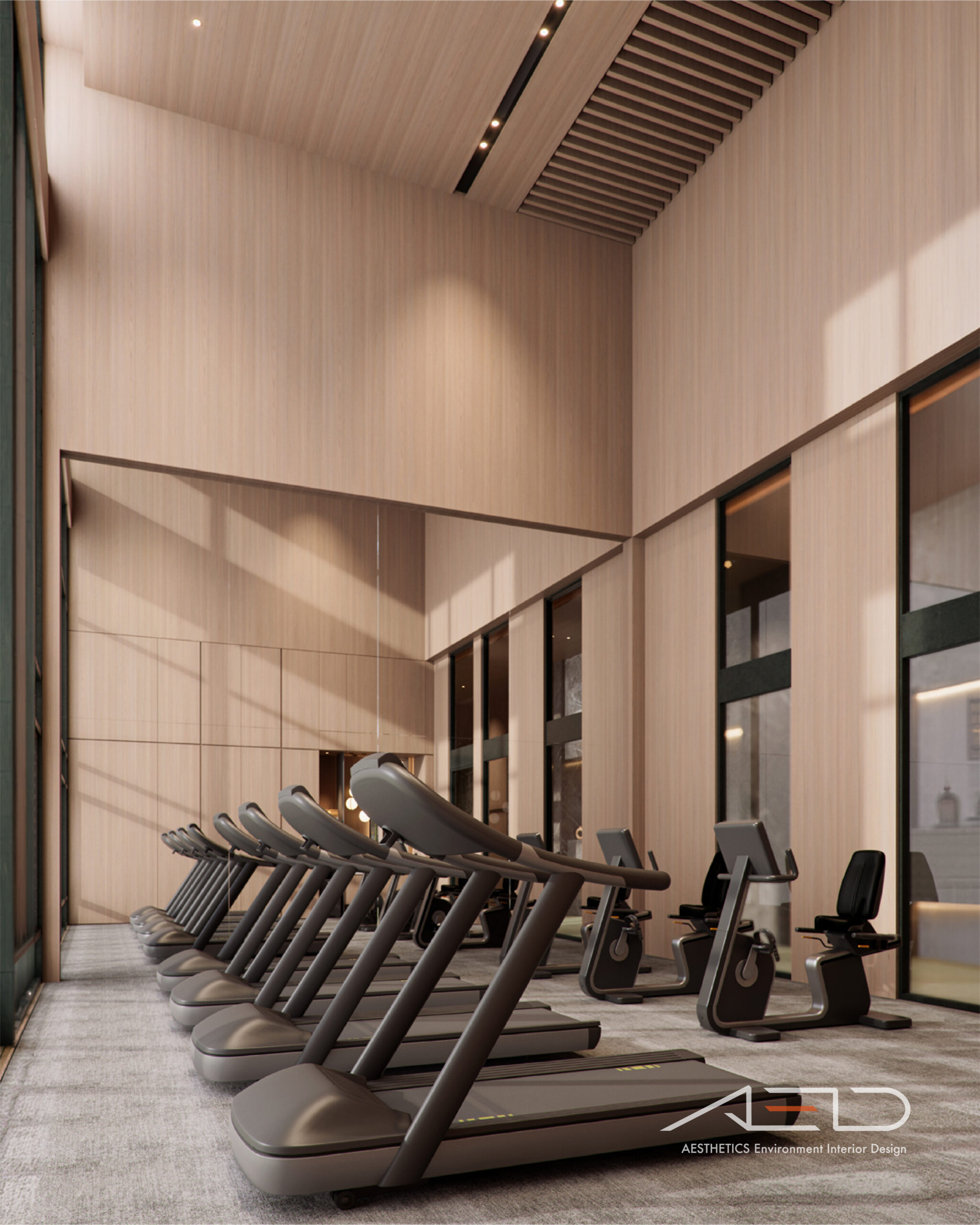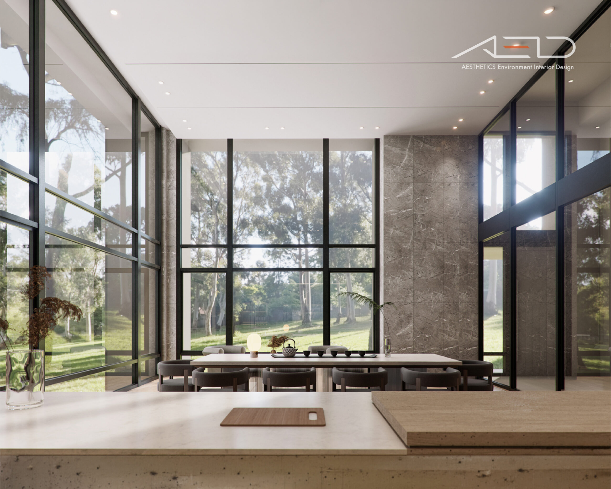 公設空間以挑高尺度展開,透過垂直量體拉開城市與日常之間的距離。大理石鋪陳出沉穩且內斂的基底,木皮天花板則以溫潤紋理回應人的尺度,使空間在宏觀氣勢中保有細膩溫度。光影順著高度流動,層層堆疊出安定而從容的公共場域,成為城市節奏中的一處靜謐停留。