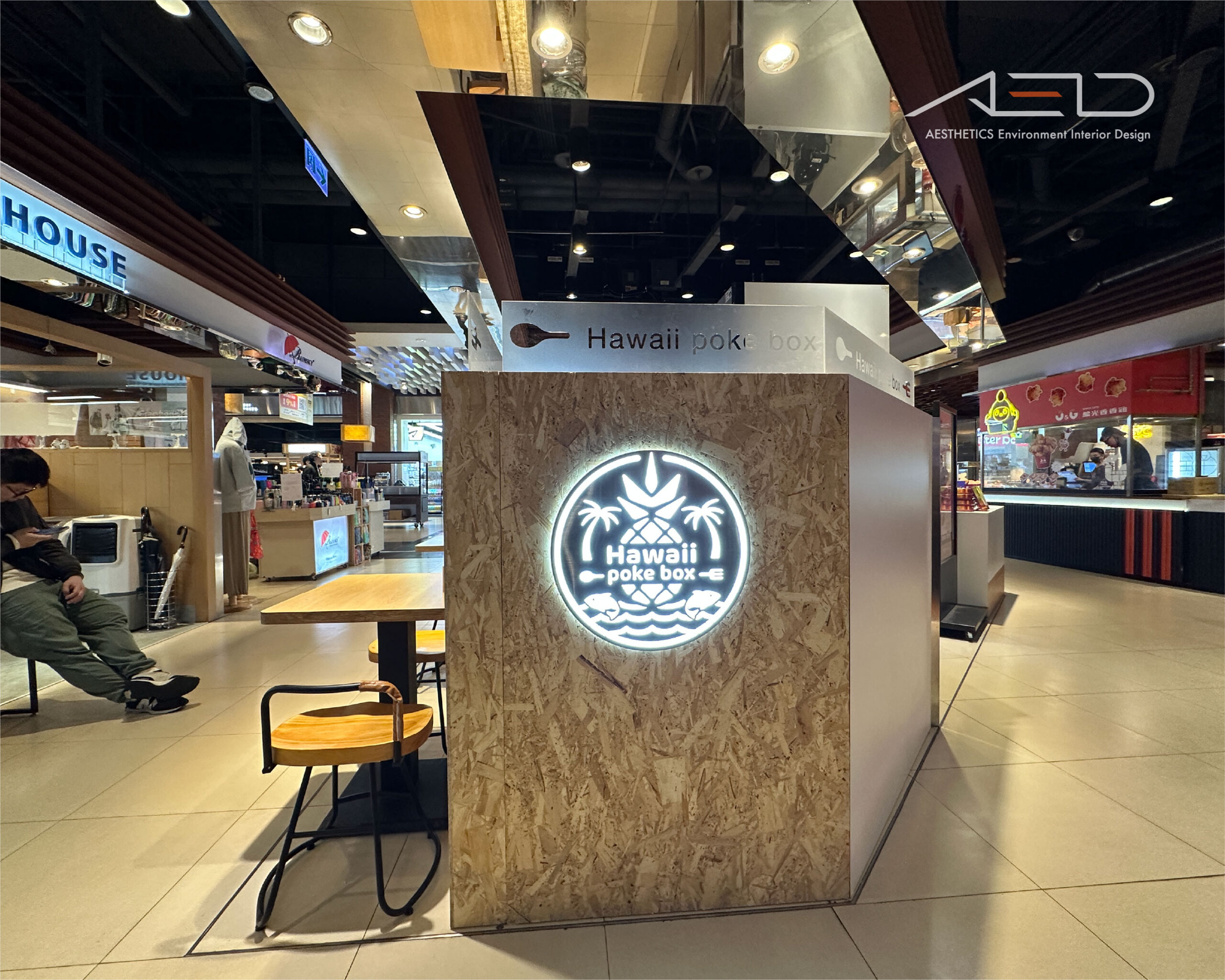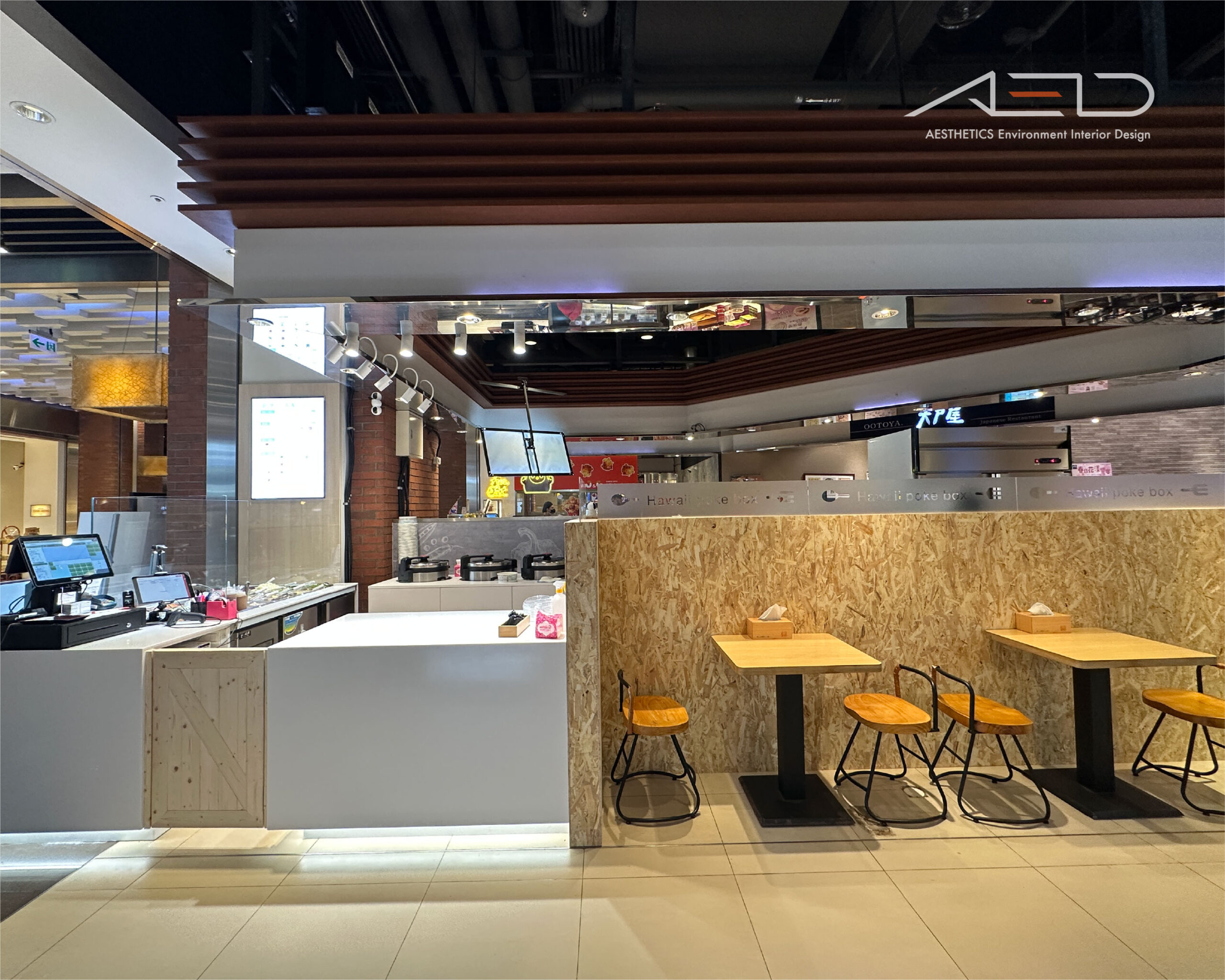 座位區以 OSB 板隔牆與木質桌椅界定用餐空間,金屬腳架座椅與溫潤木質桌面營造自然且輕鬆的用餐氛圍;整體透過簡潔材質語彙、木質元素與整合照明系統,塑造具有街區感與品牌識別度的輕食餐飲空間。