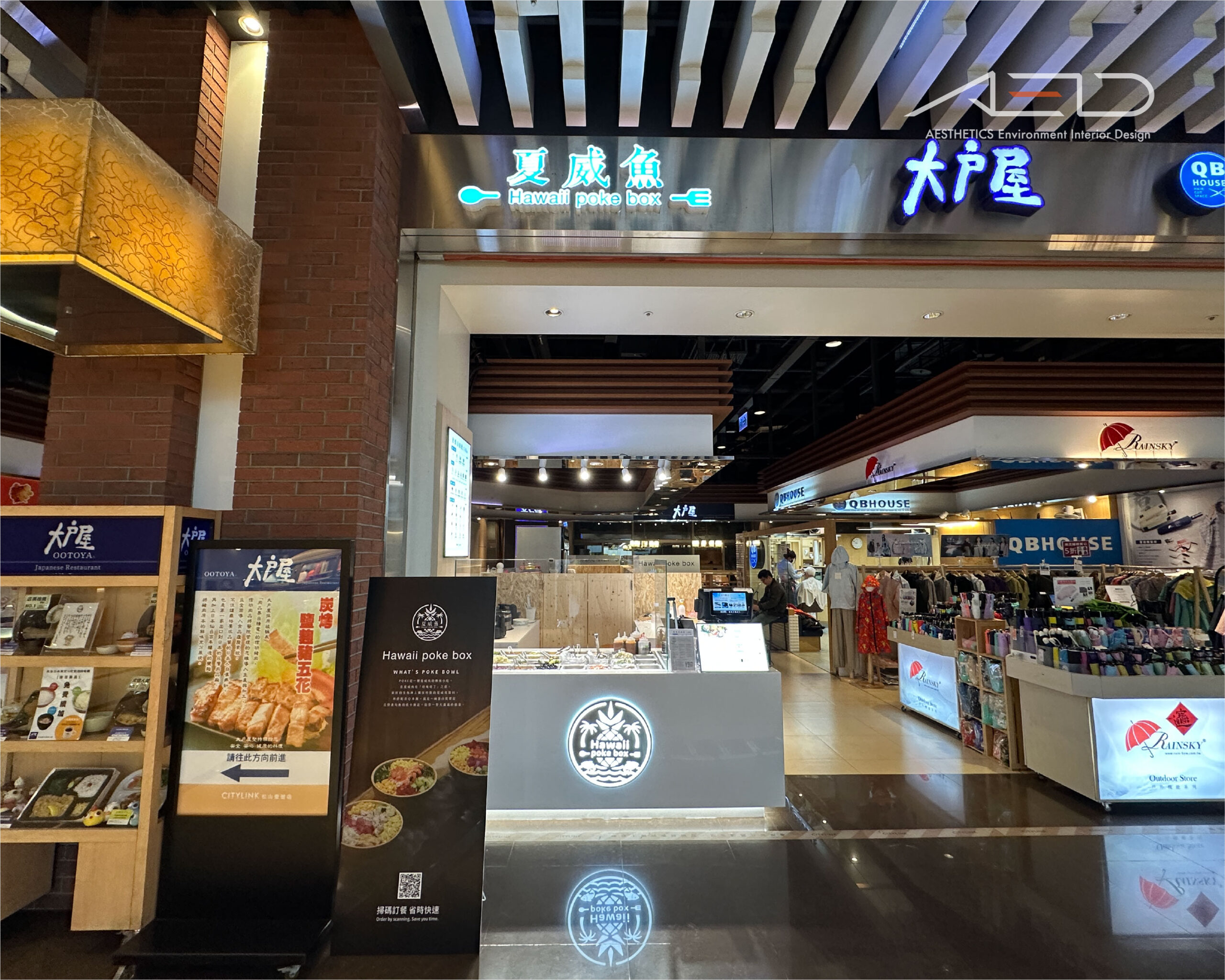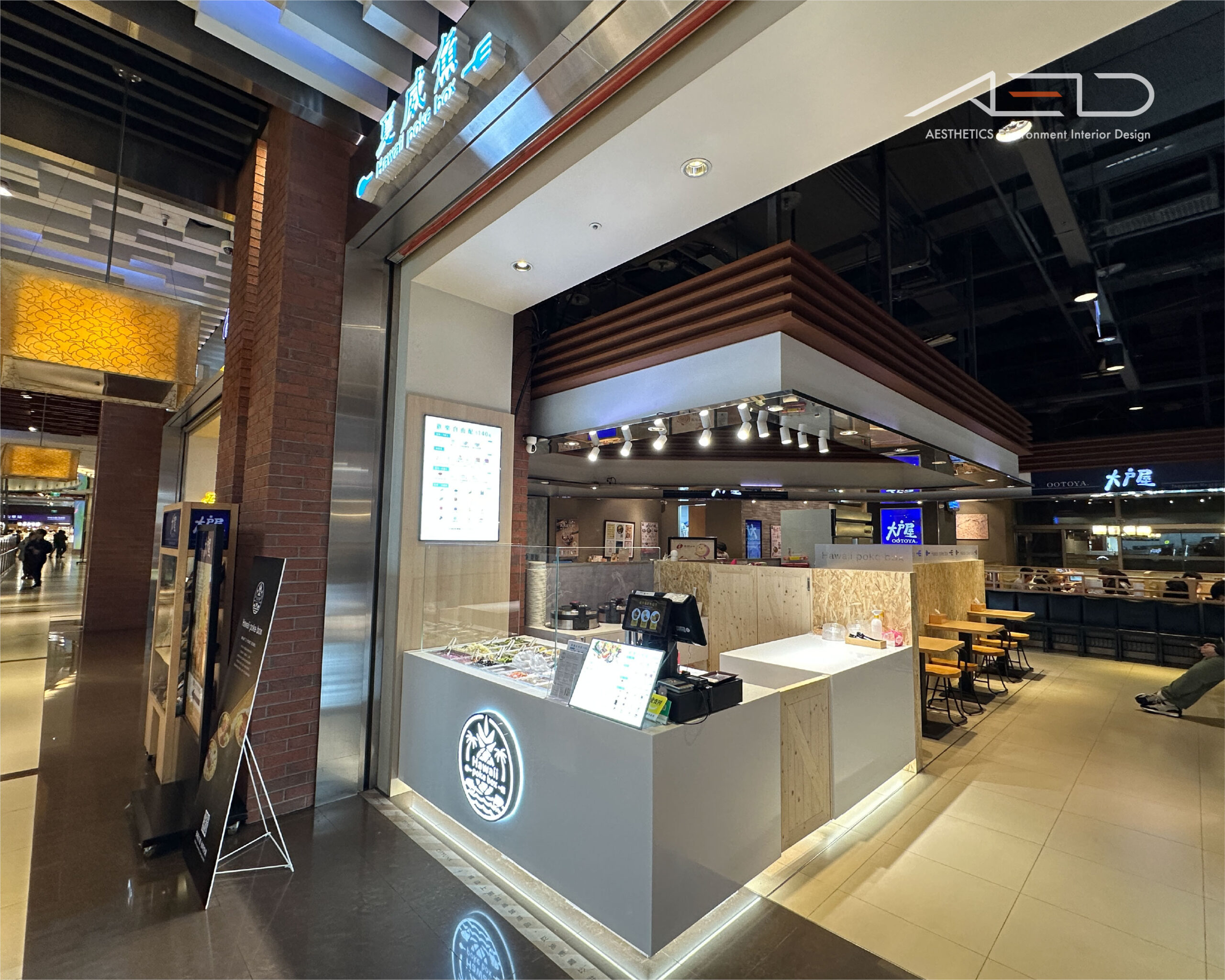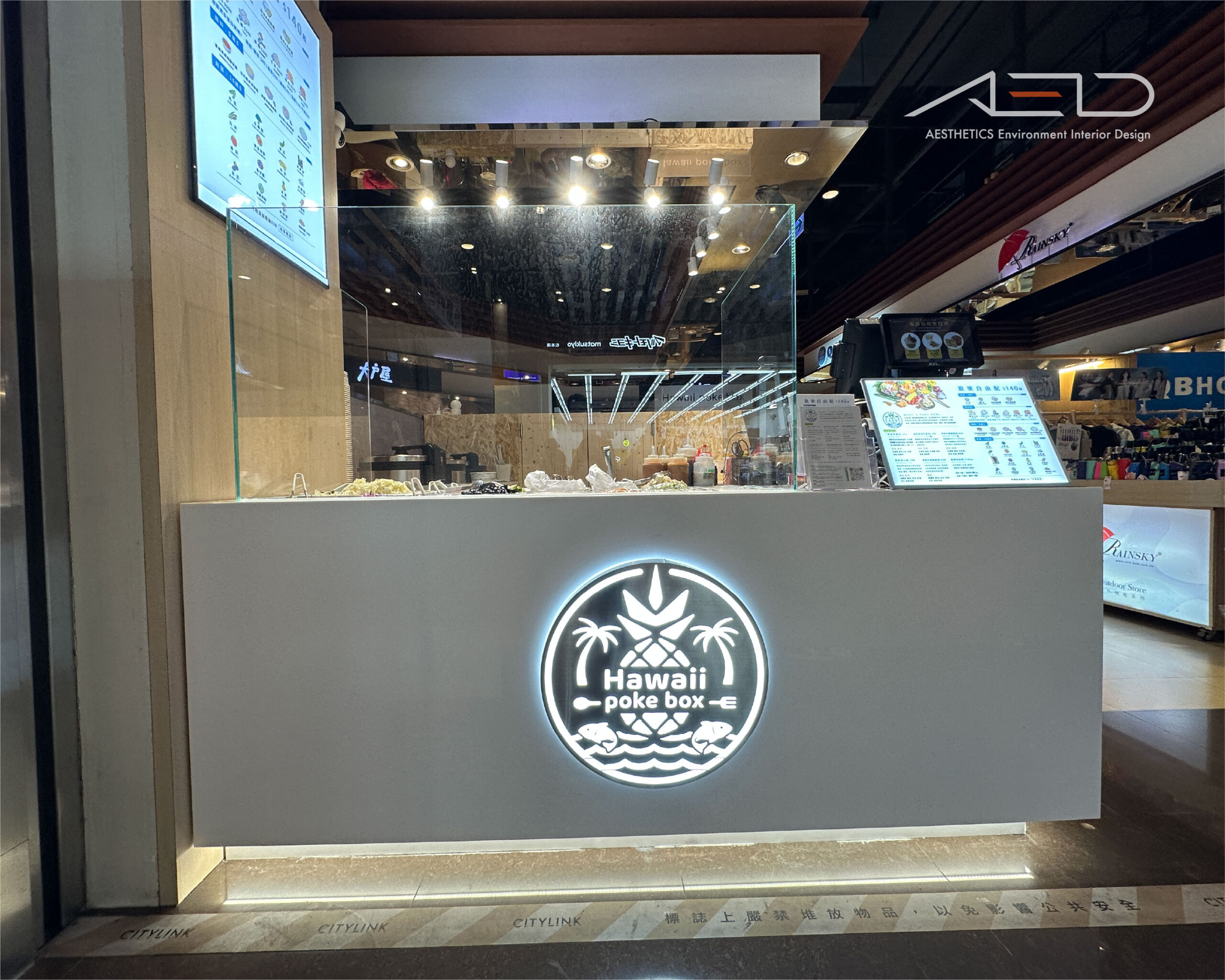 LED 發光品牌招牌結合簡潔白色櫃體,形成清晰且具有辨識度的品牌入口;玻璃食材展示櫃將新鮮配料直接呈現在顧客視線之中,使品牌形象與餐飲製作過程在公共場域中自然展開。