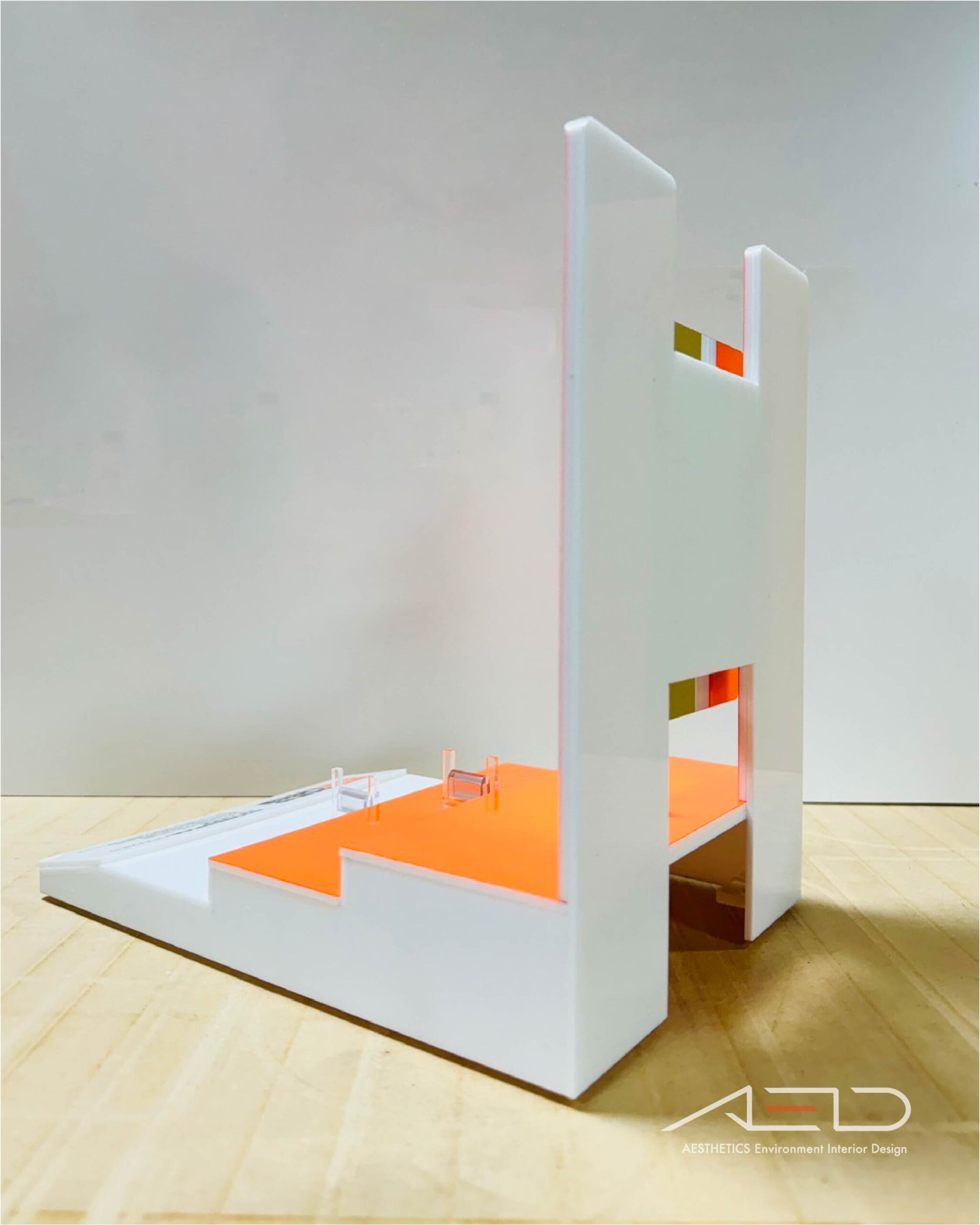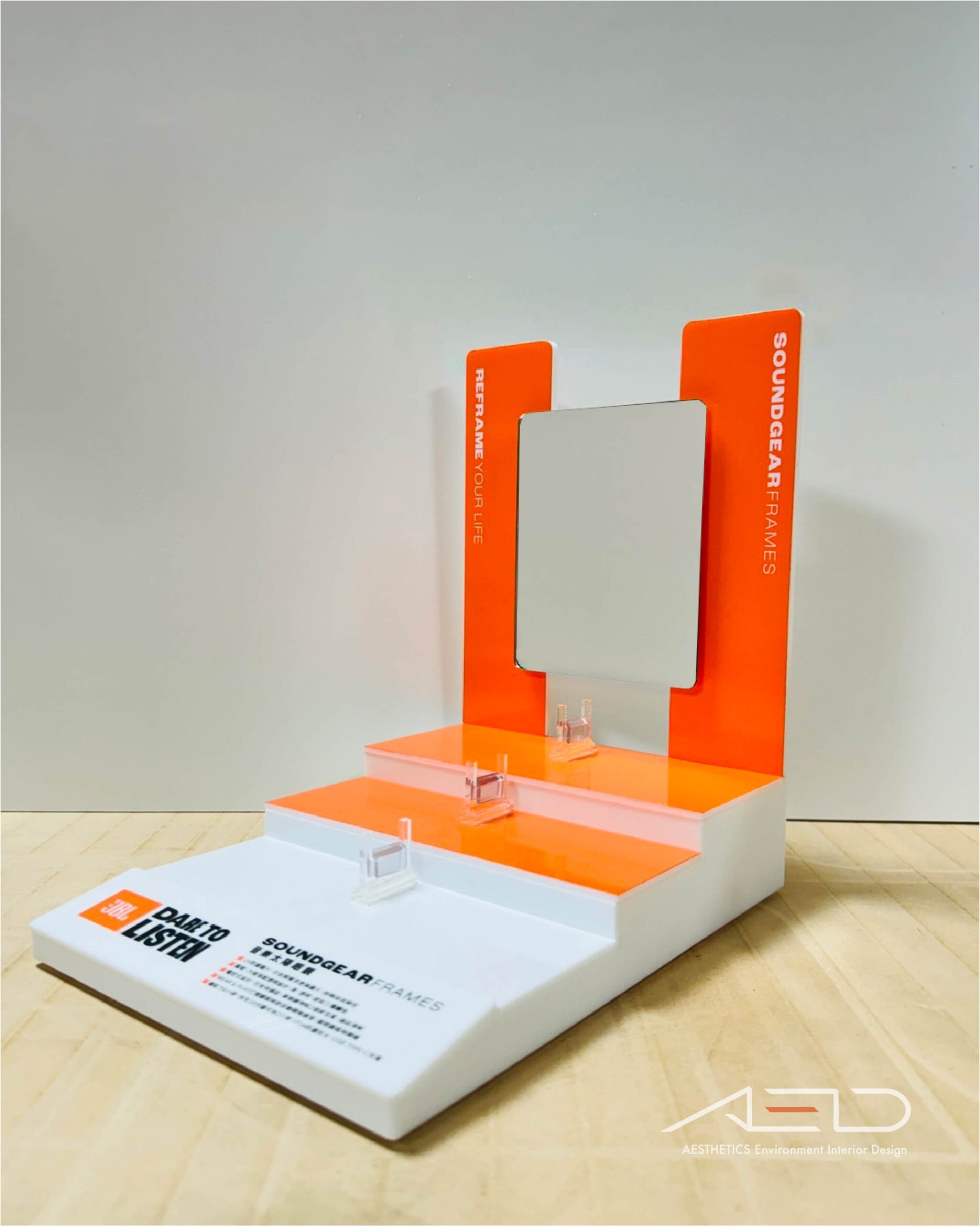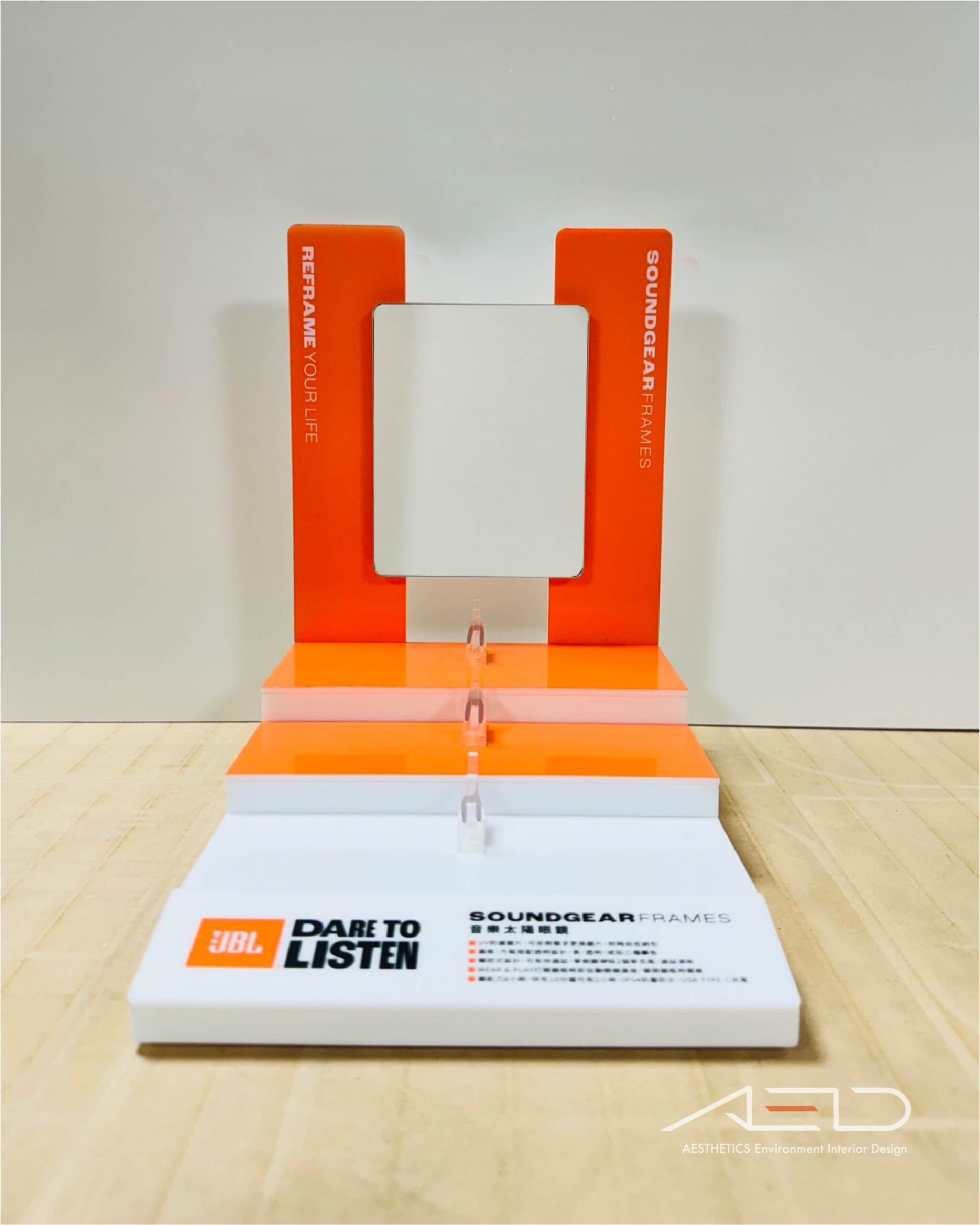 陳列架以多層階梯式展示平台與壓克力立板結構 為核心,結合透明壓克力支架,使產品能以不同高度清晰呈現;搭配品牌識別色彩面板與產品資訊版面,強化品牌視覺與產品特性說明。