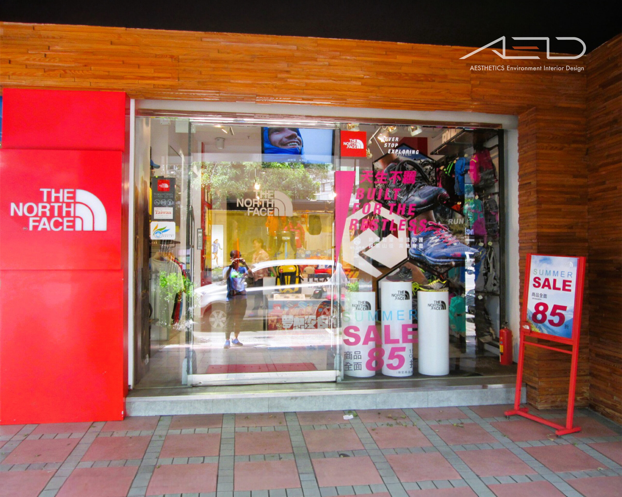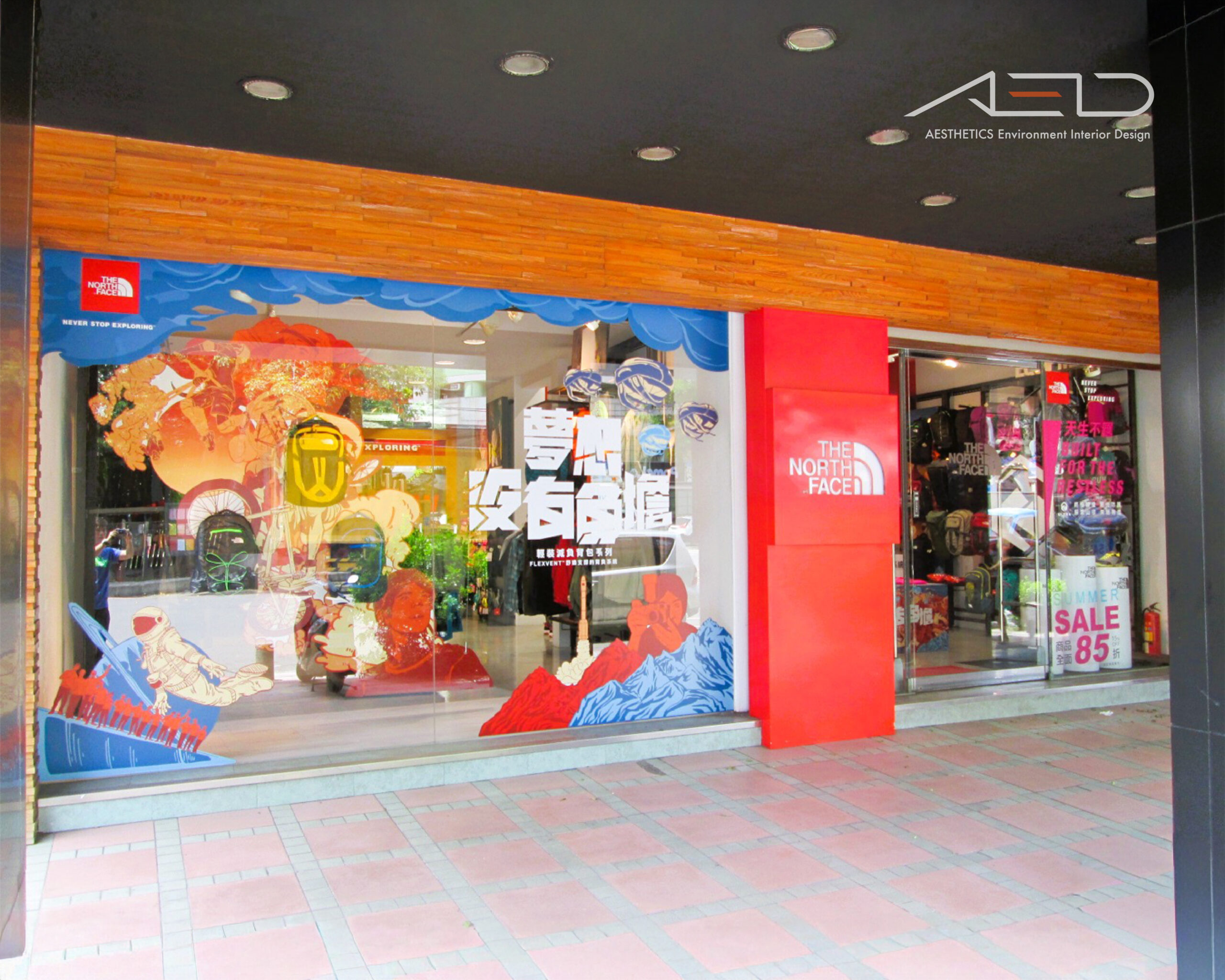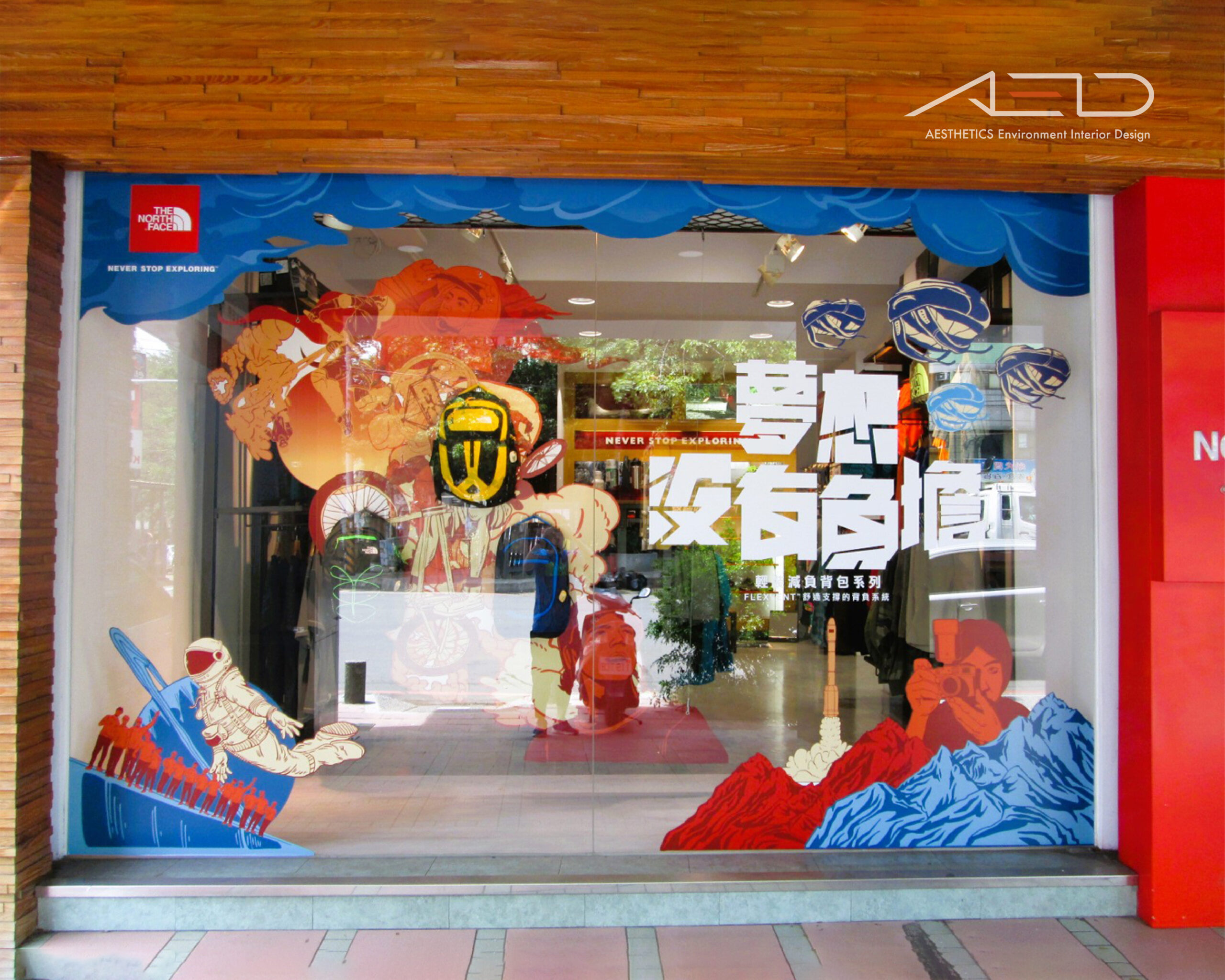 以鮮明的品牌紅色識別結合溫潤木質立面,構築具戶外精神的城市街區店鋪。