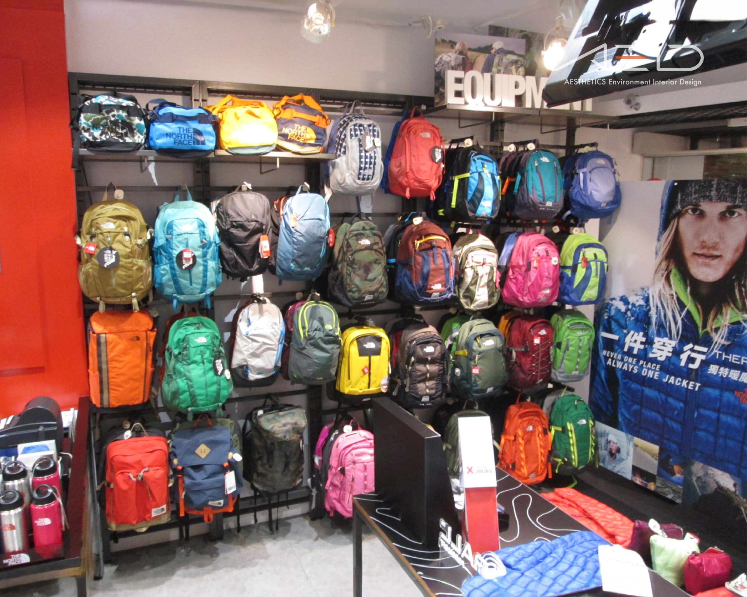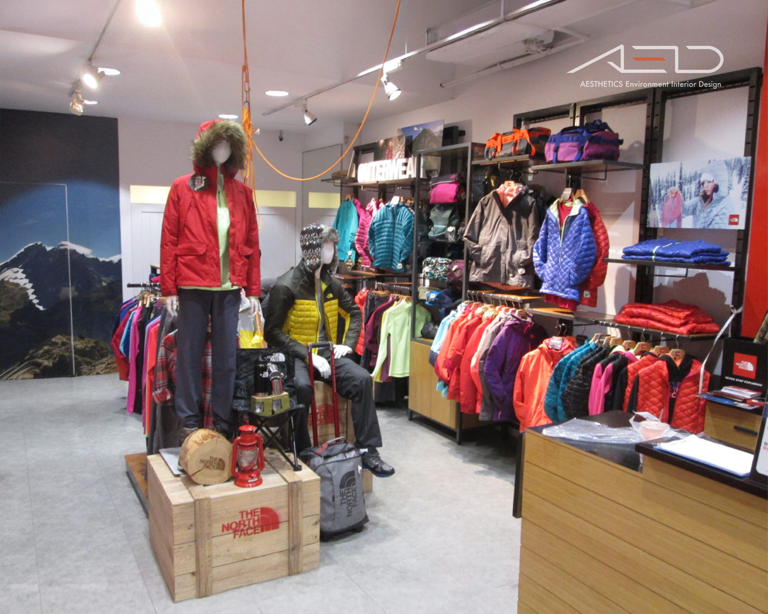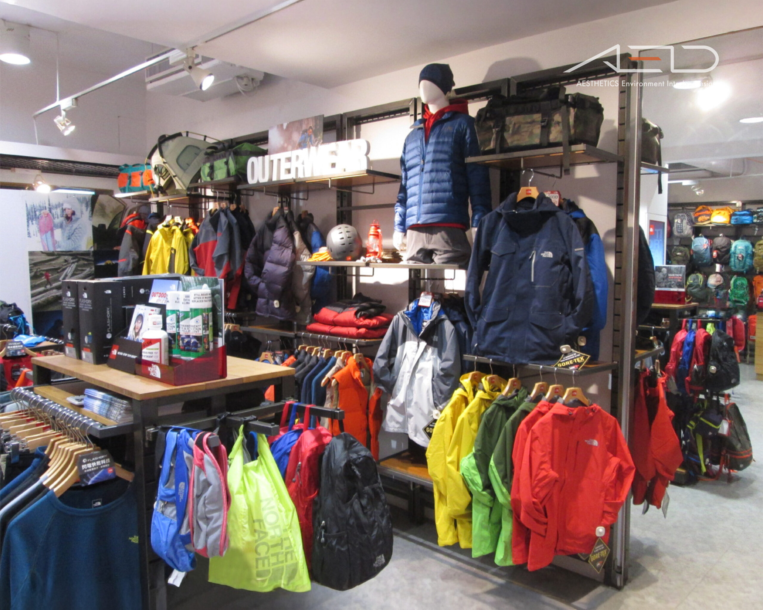 室內透過模組化展示系統與明亮色彩陳列,形塑層次分明的商品結構,在理性動線與清晰展示之中,呈現探索與機能並存的戶外零售空間。