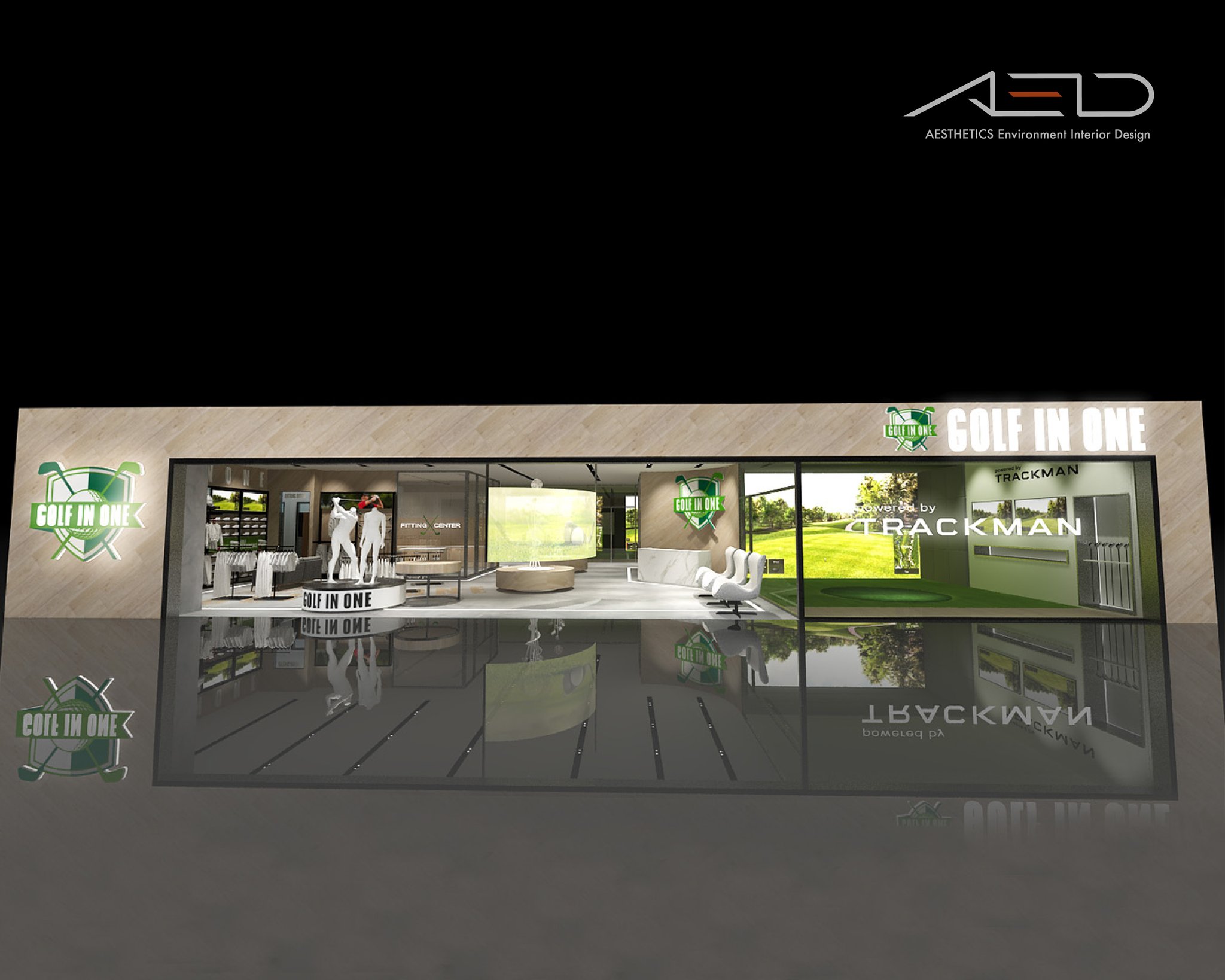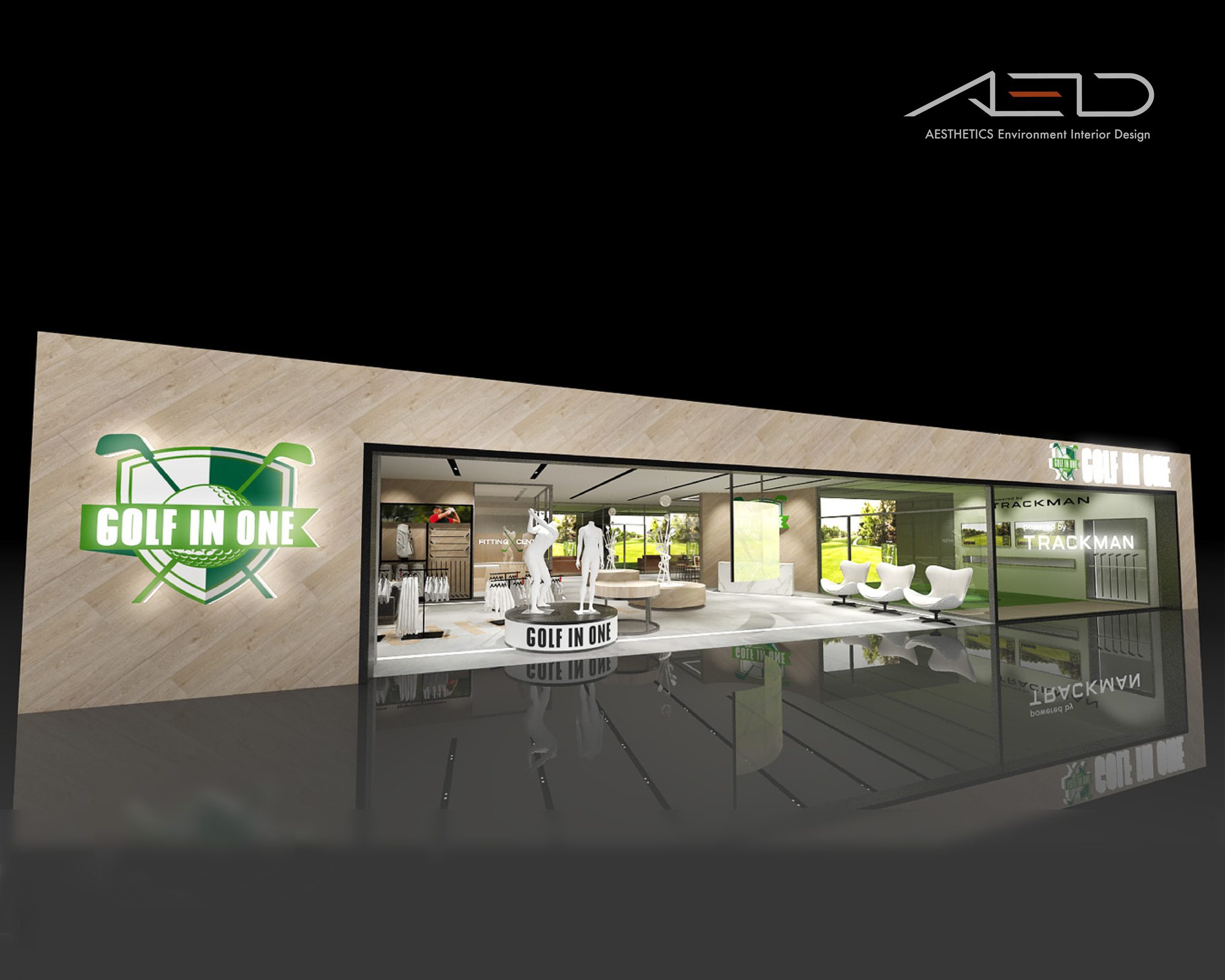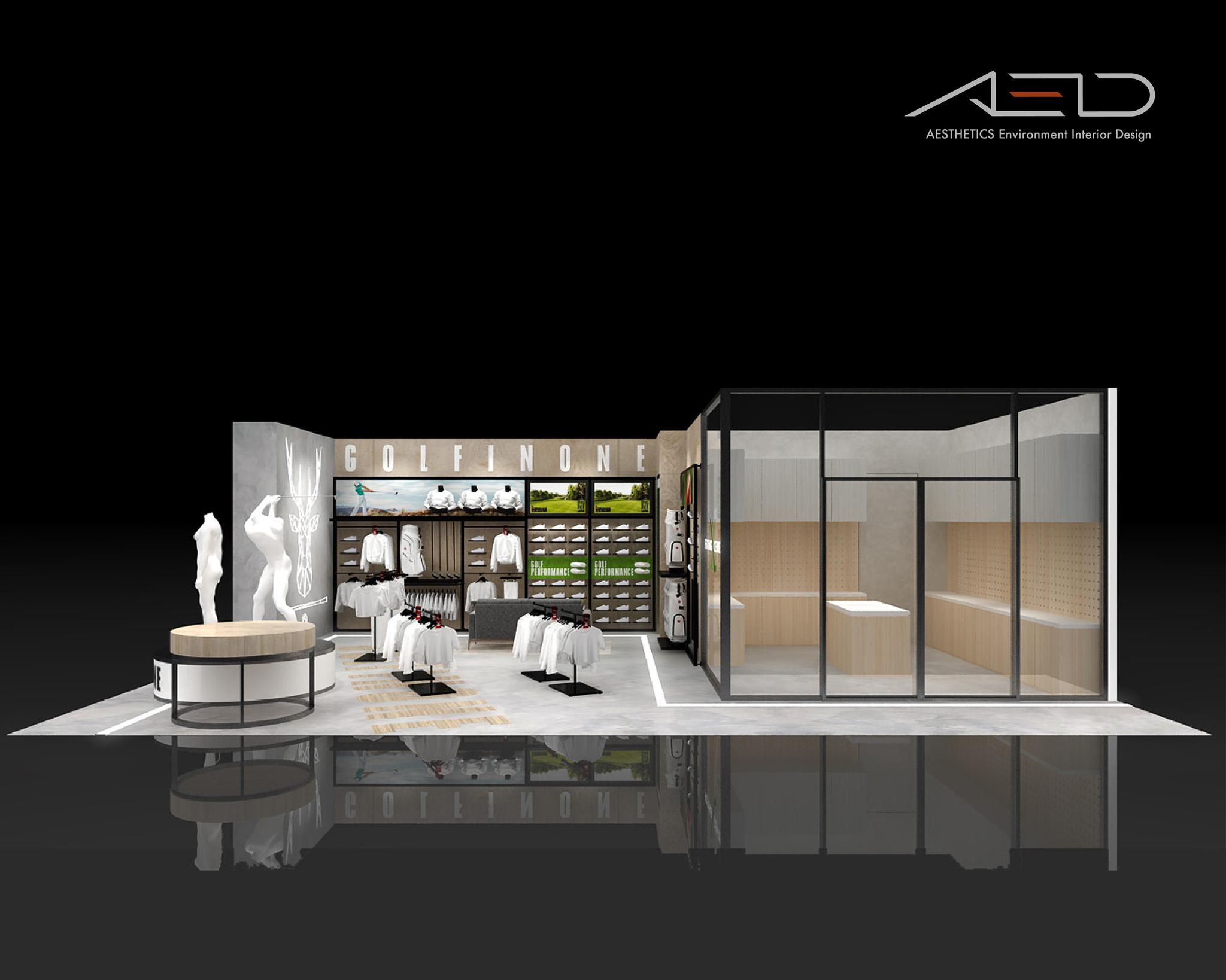 以高爾夫運動場景為空間概念,整體場域透過開放式立面與大面玻璃界面建立清晰的品牌展示窗口,使室內體驗自然延伸至公共空間之中,形成具有吸引力的品牌入口。