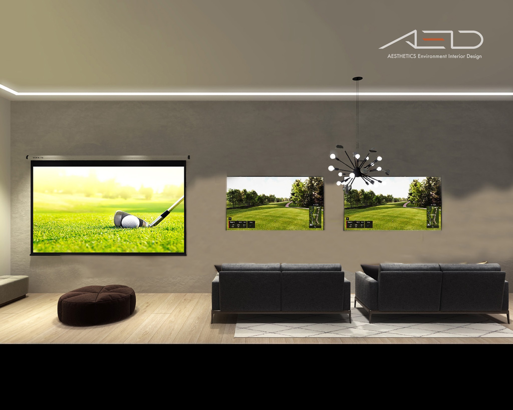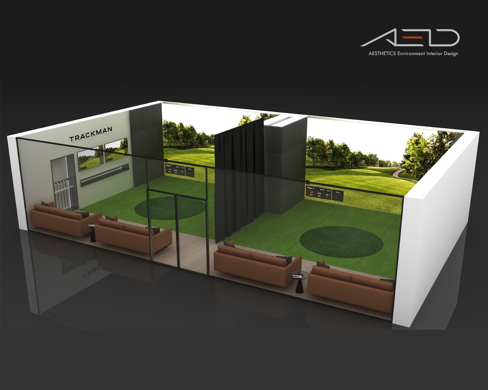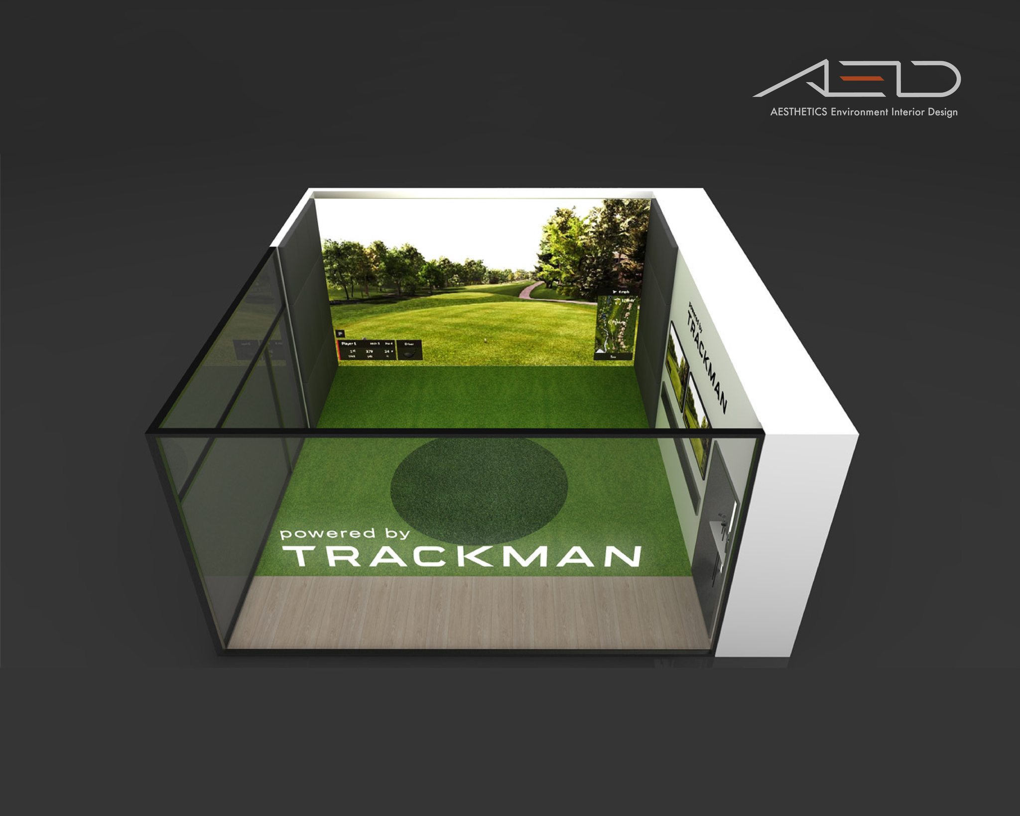 Retail display, swing simulation, and lounge areas are integrated into a unified spatial layout. A central display zone anchors the space with brand identity and product presentation, while the TrackMan simulator area creates an immersive golf environment through large-scale projection and turf surfaces. Clean material palettes and open circulation shape a contemporary retail environment that blends professional performance with a relaxed golf lifestyle.