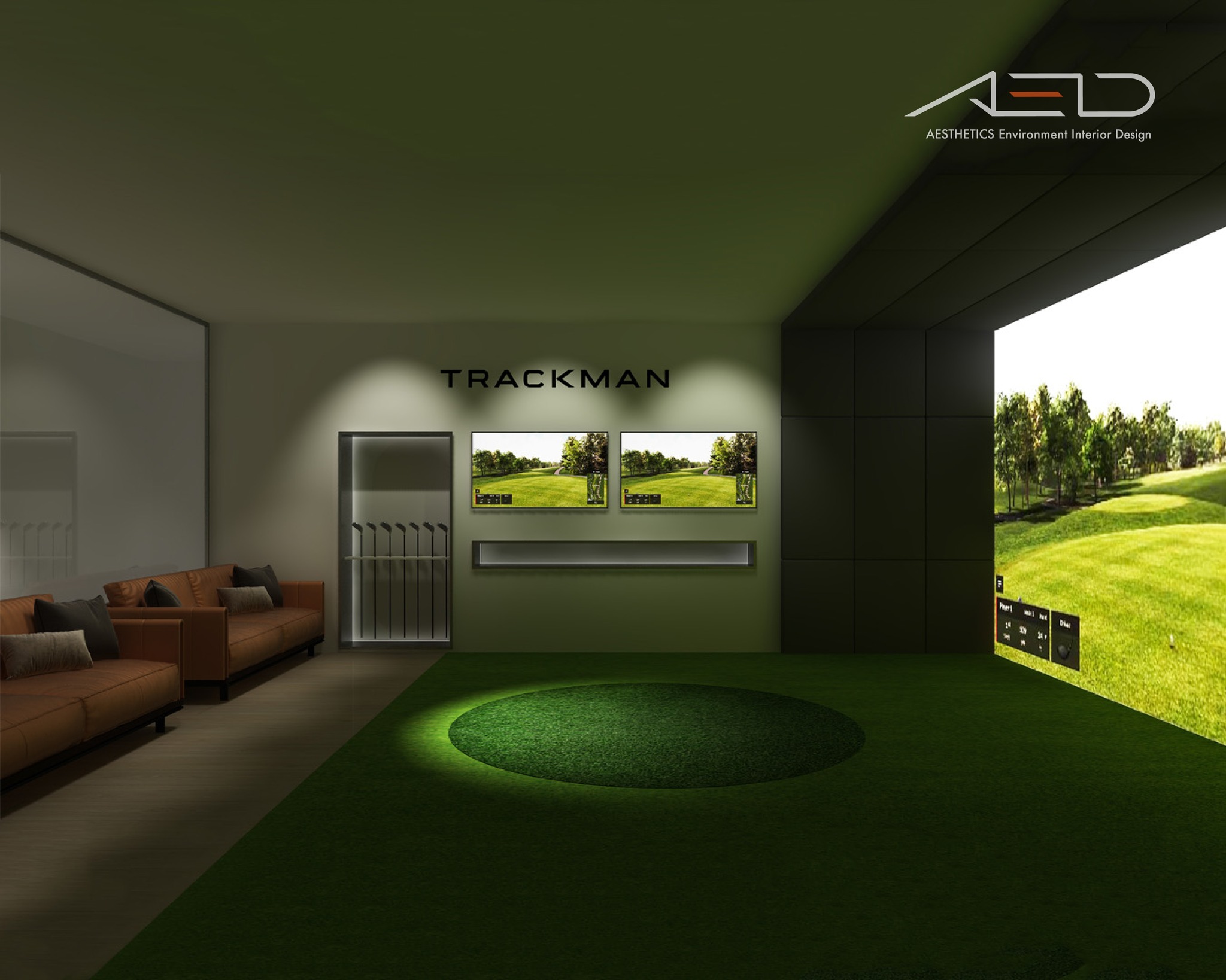 空間以展示、試打與休憩三種機能進行整合,中央展示區結合品牌識別與商品陳列,構築清晰的視覺核心;結合 TrackMan 模擬系統的試打空間則以沉浸式影像與草坪材質營造真實的高爾夫體驗。整體場域以簡潔的材料語彙與開放式動線,塑造兼具專業感與休閒氛圍的高爾夫生活空間。