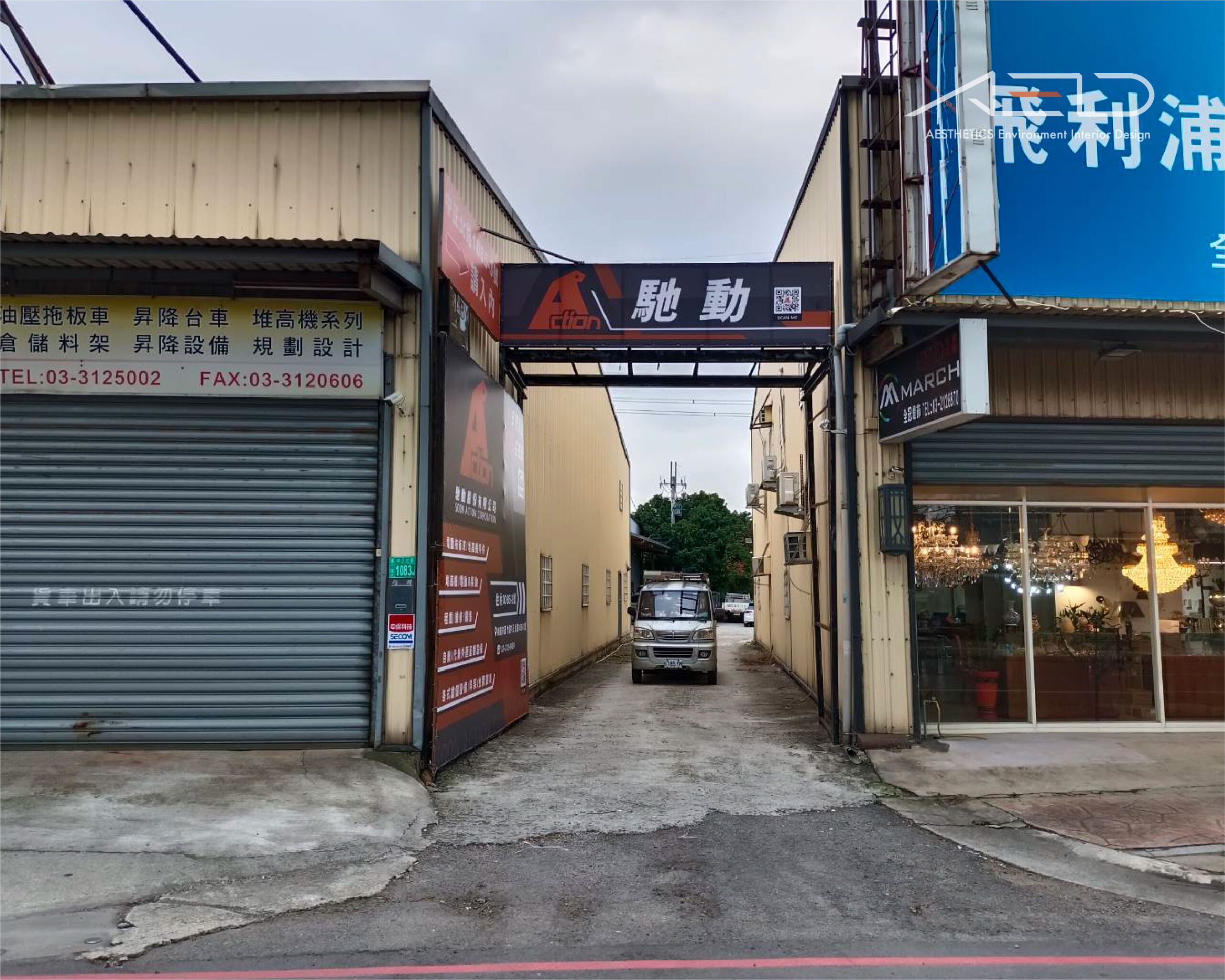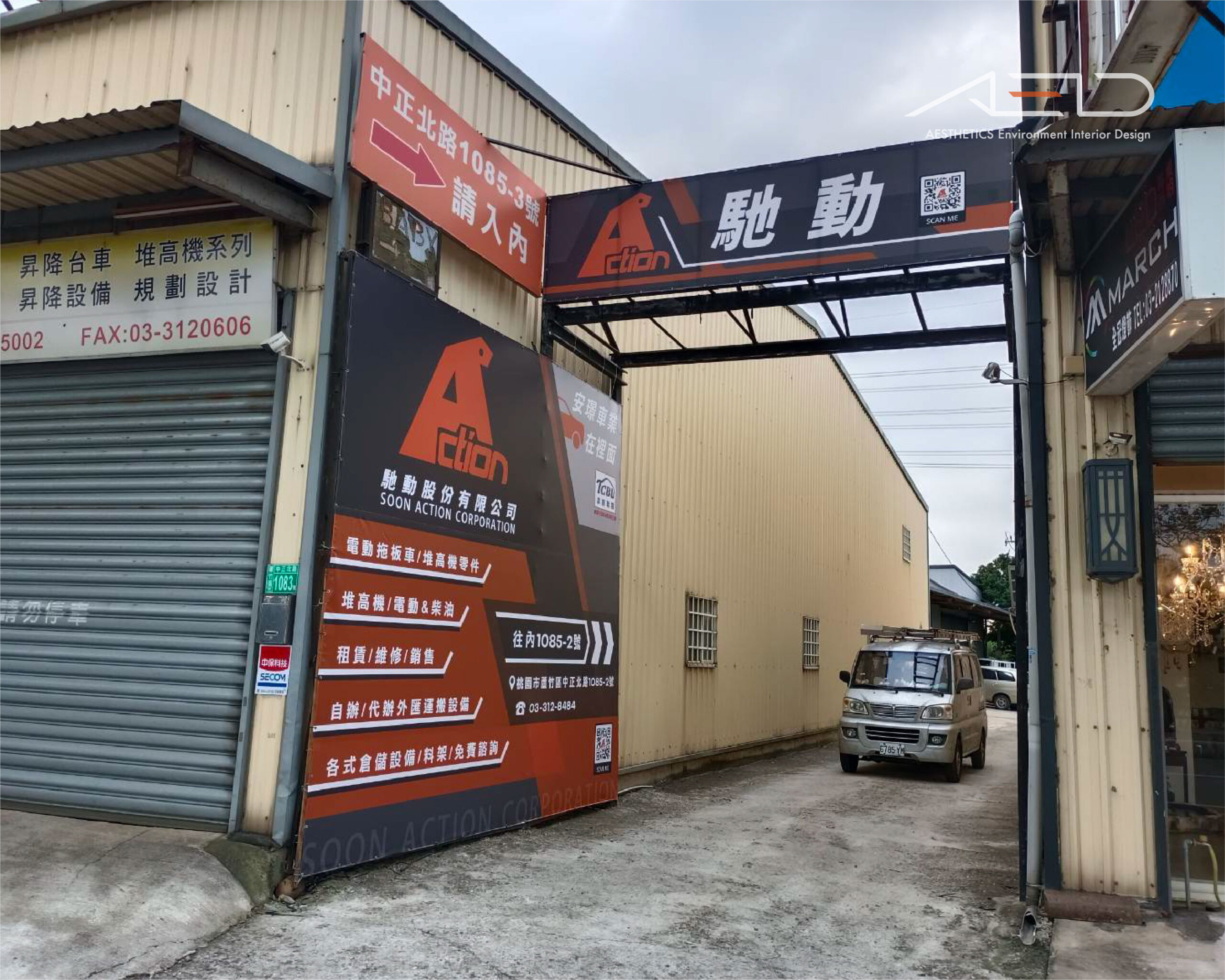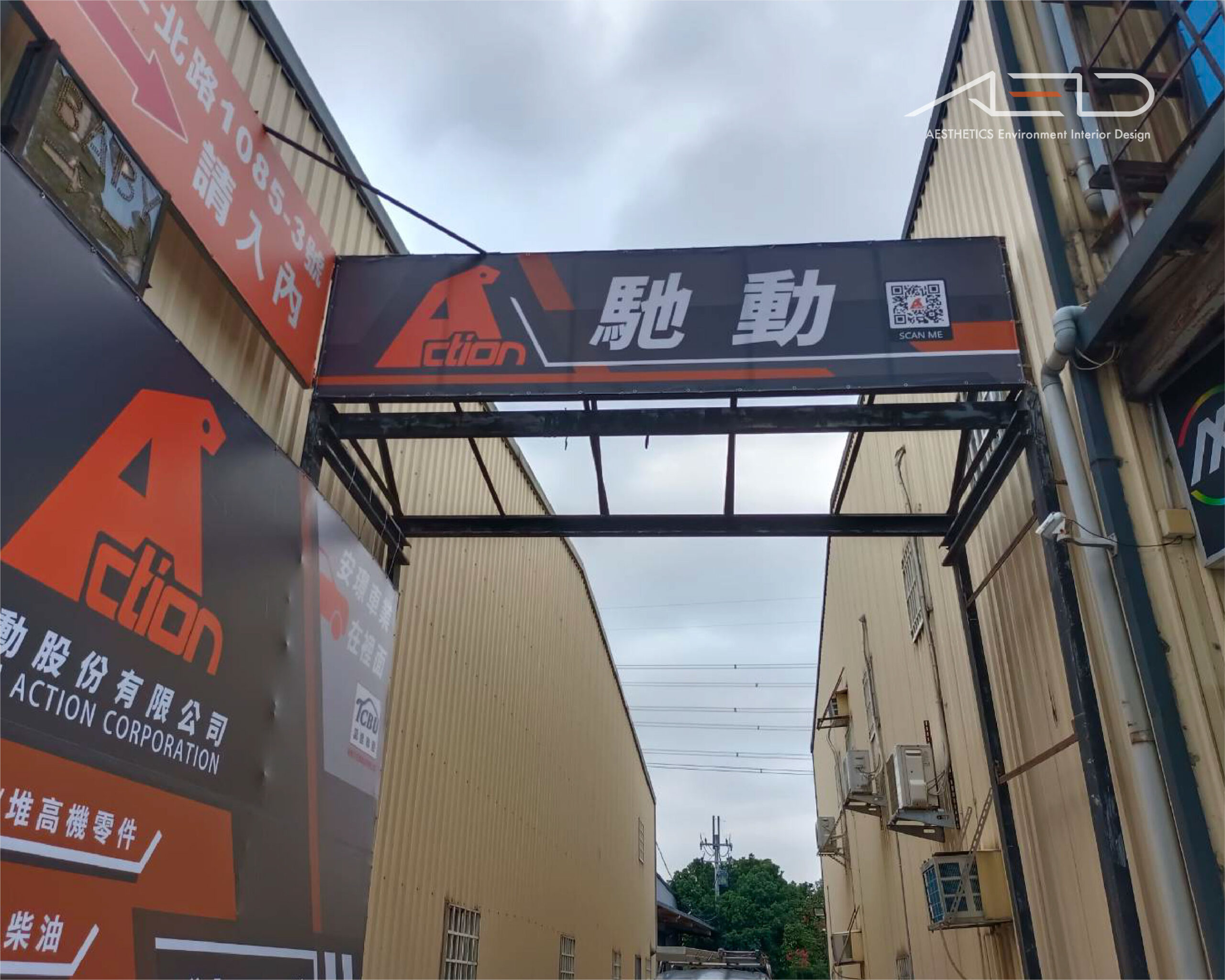 為 ACTION 馳動股份有限公司 規劃廠區入口與外牆形象視覺系統,整合品牌識別、導引資訊與企業形象,建立清晰且具識別度的入口界面。