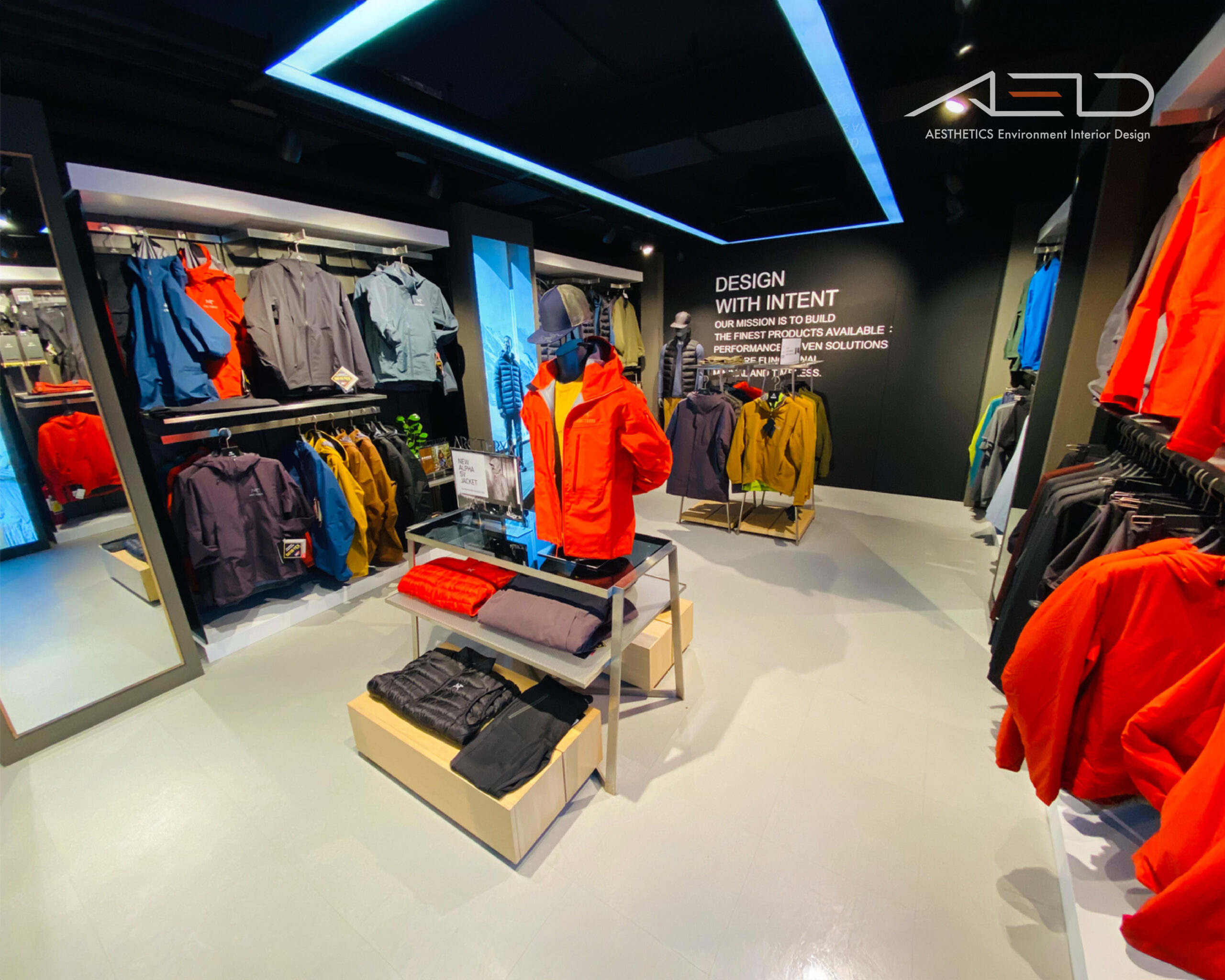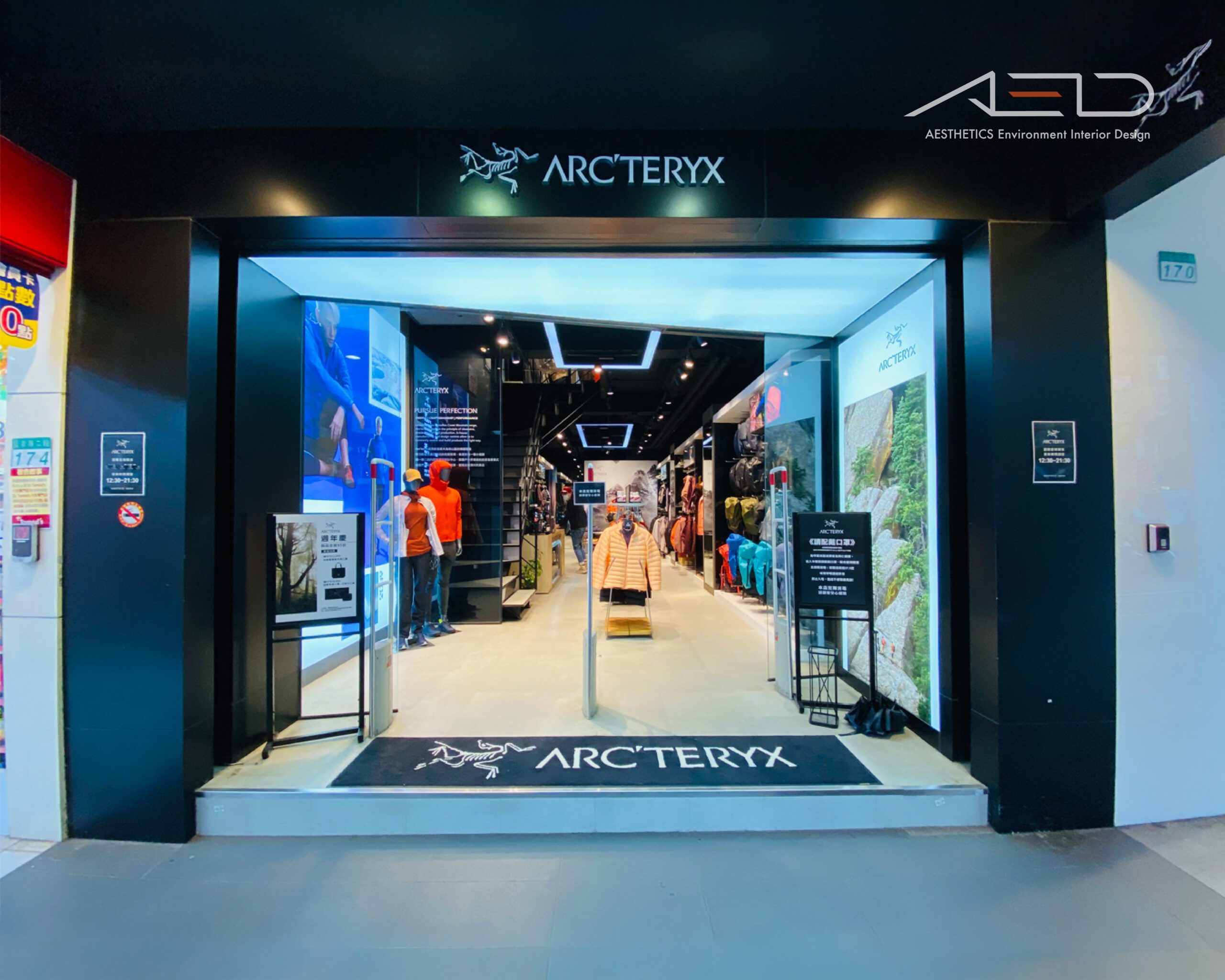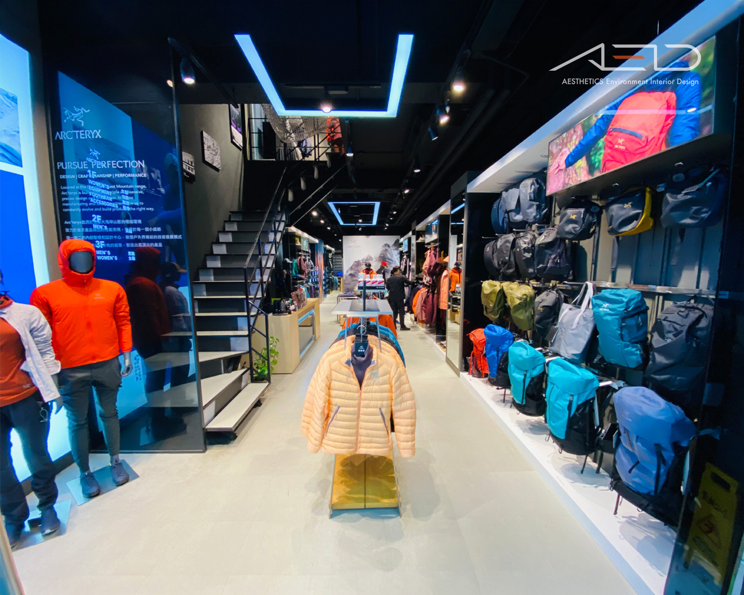 透過品牌展示陳列道具與精準燈光設計,使戶外機能服飾與裝備被有序呈現,體現 Arc’teryx 對性能與探索精神的品牌核心。