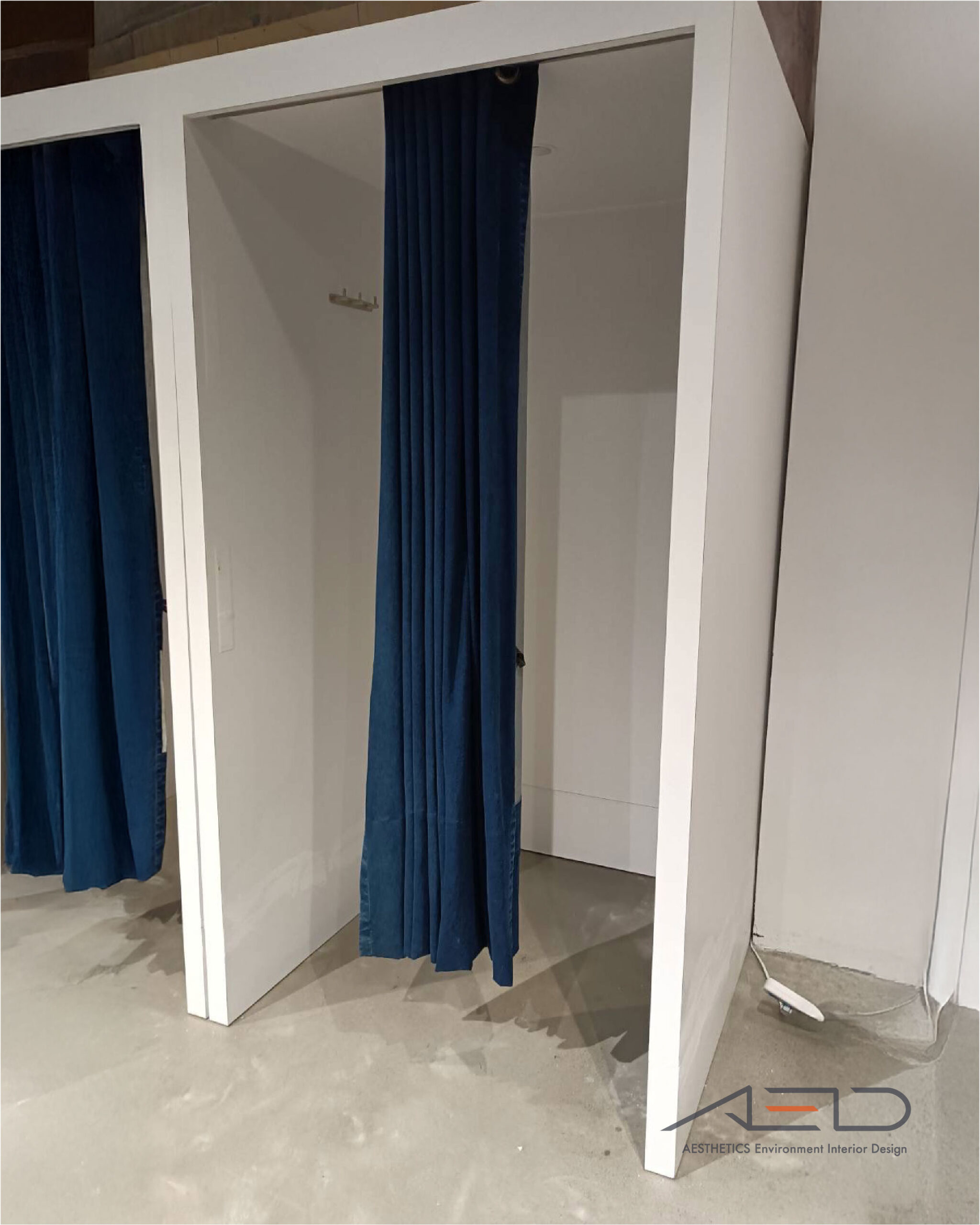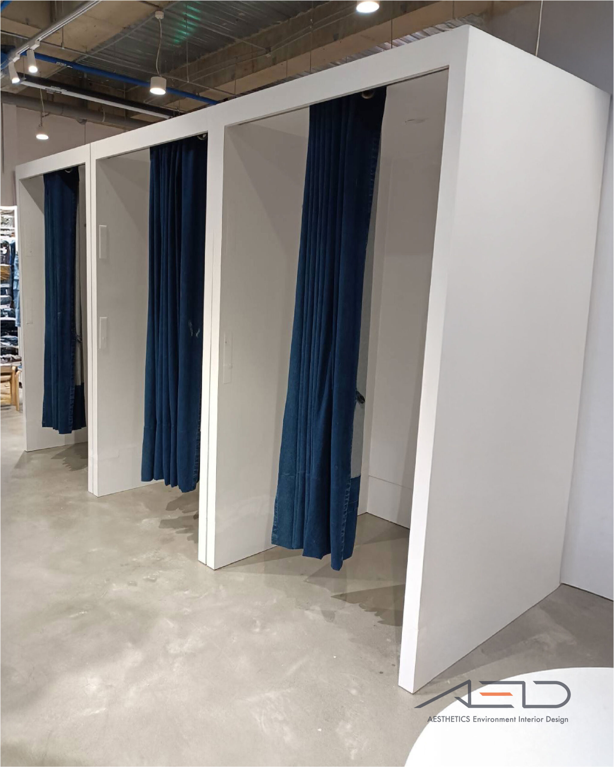 更衣室以簡潔白色框體結構為核心,透過連續模組排列形成整體空間界面;內部配置 布簾系統、掛衣配件與隱藏式照明,在維持開放視覺的同時提供舒適且私密的試穿體驗。