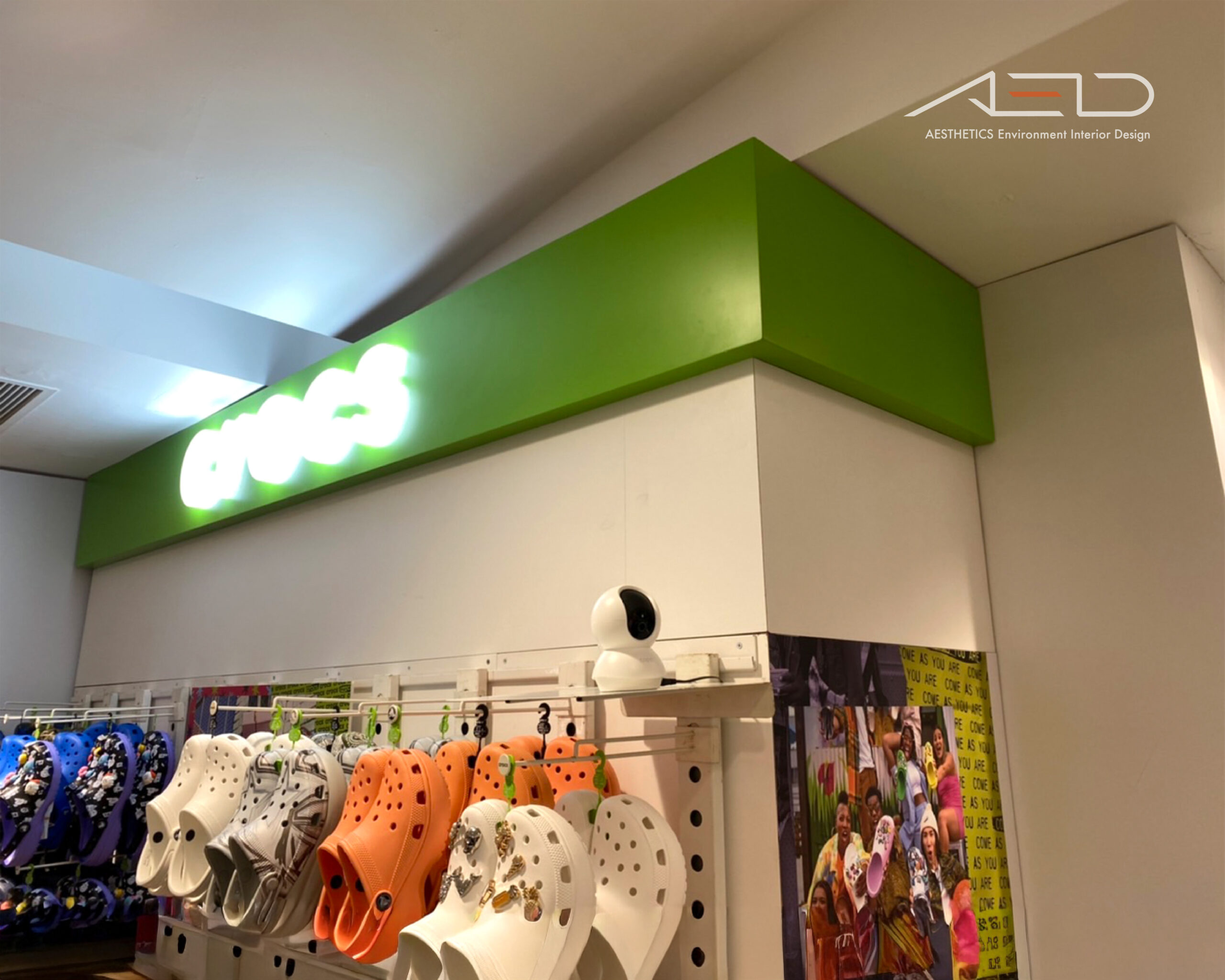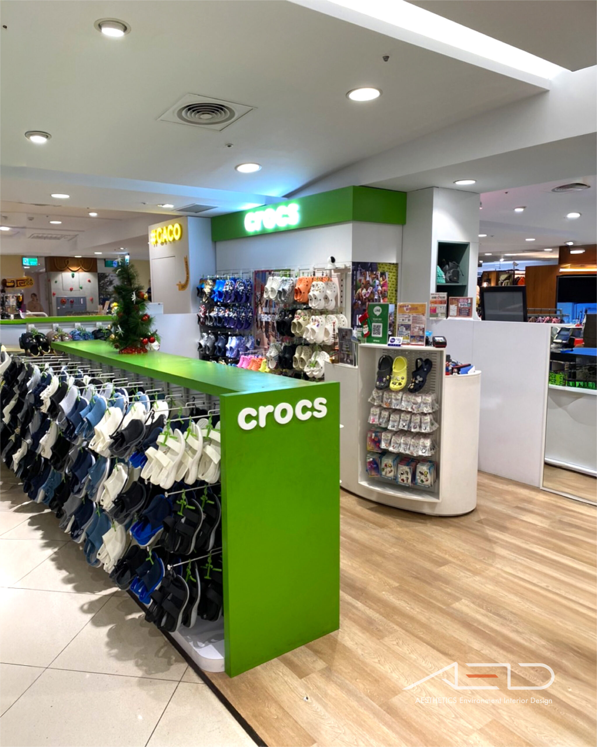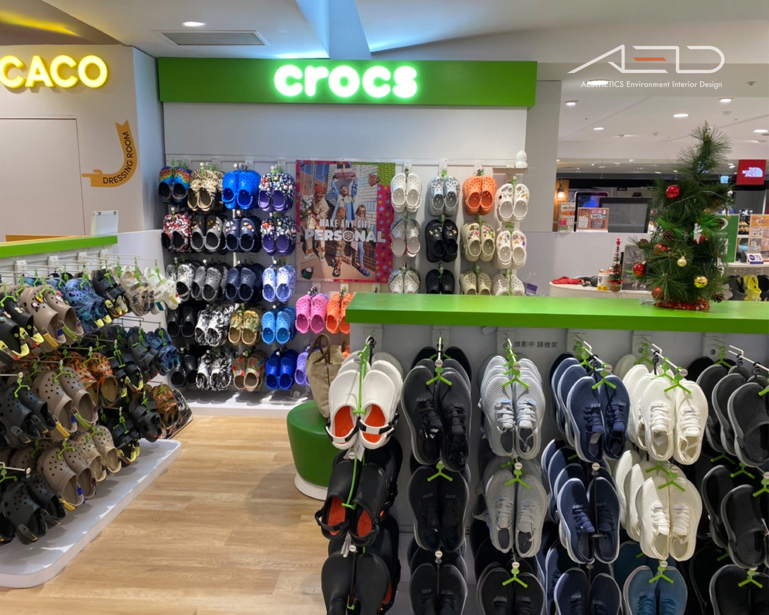 空間透過展示桌與壁面鞋牆系統組織商品動線,低檯展示架整合鞋履吊掛系統,使商品以整齊序列呈現;壁面展示架結合品牌鞋架與掛勾系統排列多色鞋款,形成高密度且清晰的商品展示,中央展示平台融入品牌綠色元素與配件展示層架,使鞋履與 Jibbitz 裝飾配件形成完整而具有節奏感的展示序列。