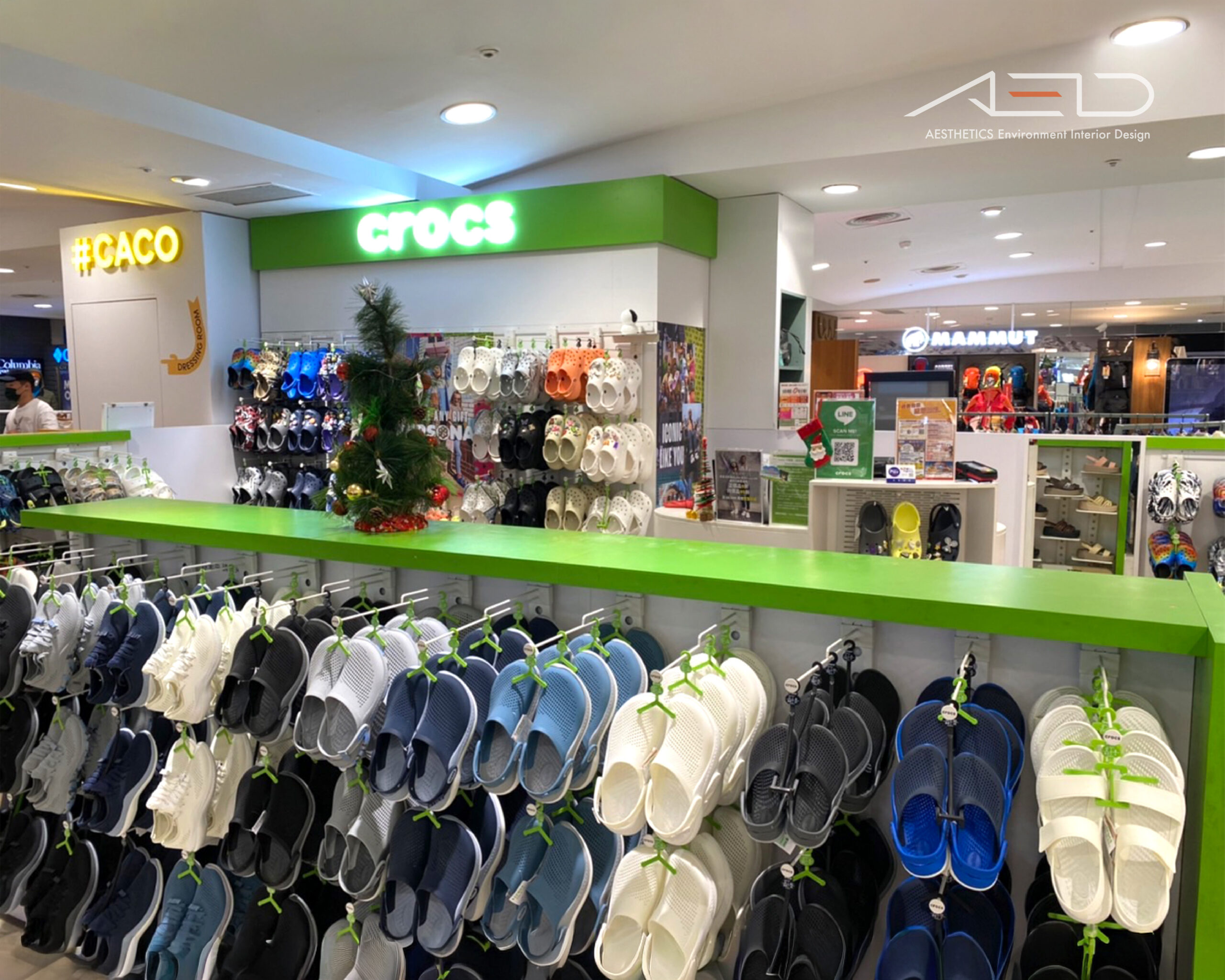 鮮明的品牌綠色識別構築開放且具辨識度的品牌界面,LED LOGO 與中央展示中島形成清晰的視覺焦點,使 CROCS 輕鬆活潑的品牌形象在百貨空間中被有效呈現。