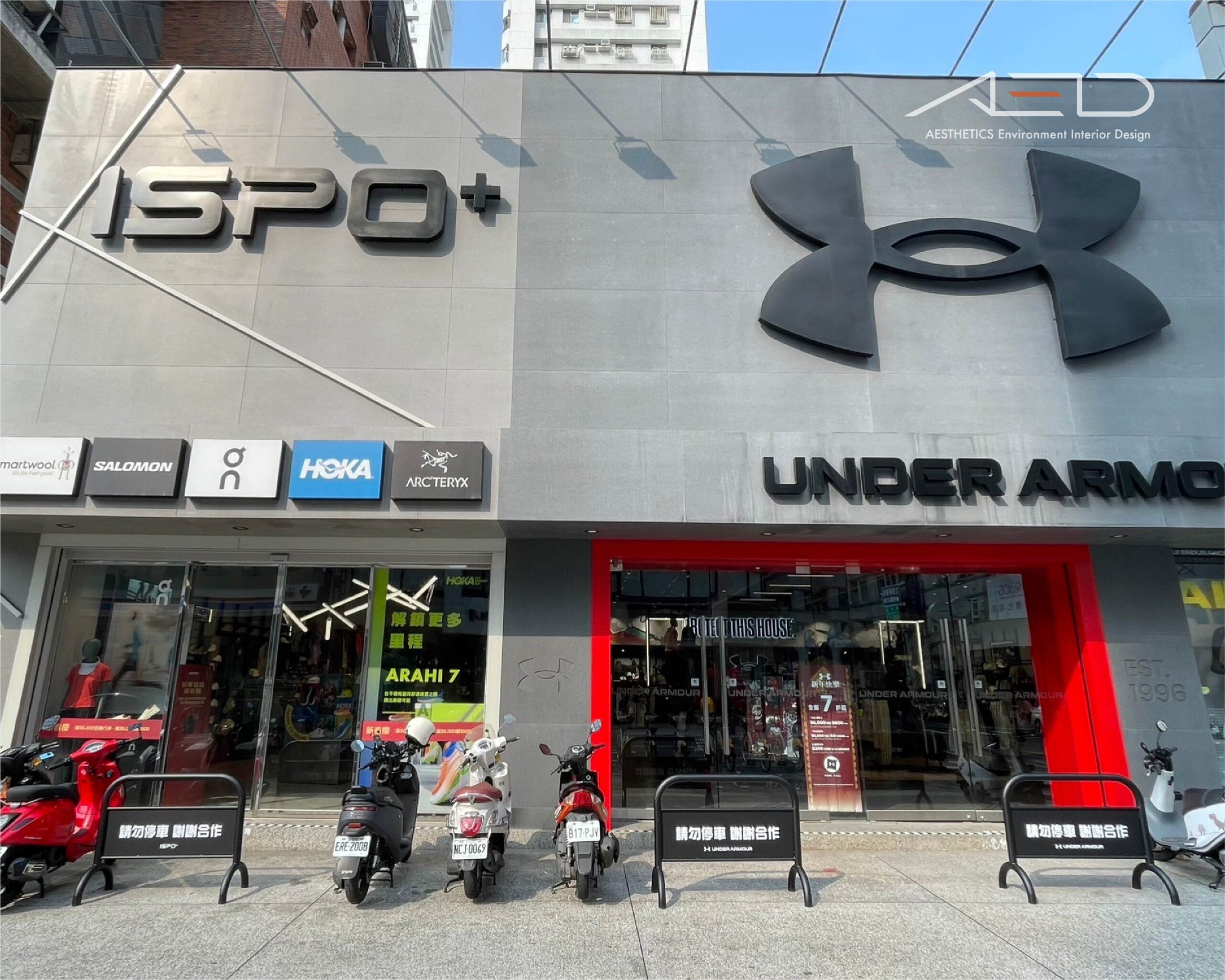 透過簡潔結構、標準化尺寸與品牌識別整合,使街邊店入口維持整齊的公共界面,並延續 UNDER ARMOUR 一貫俐落且具有國際感的品牌形象。