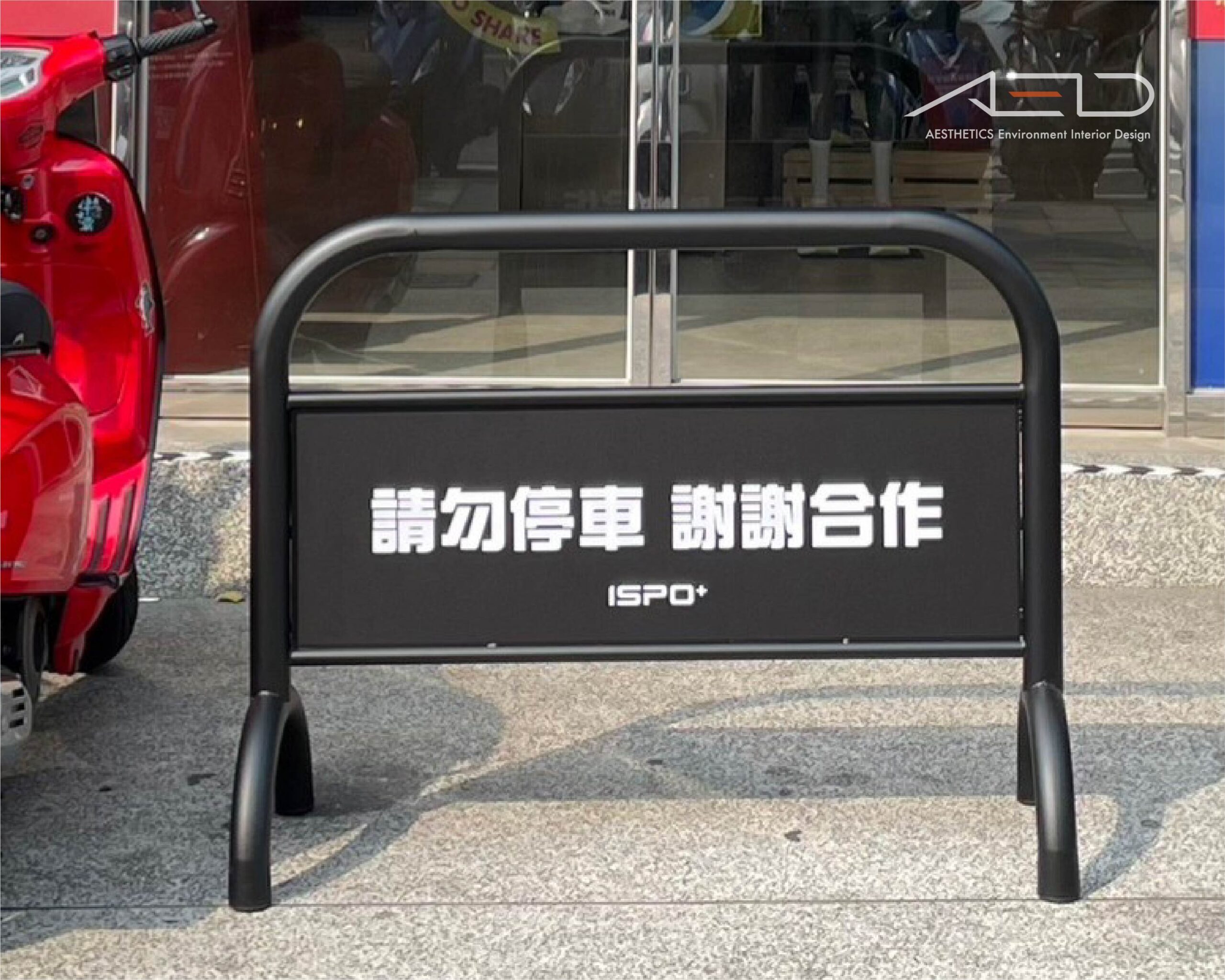 路障採彎管金屬結構與面板 製作,整體以黑色烤漆處理,兼具耐候性與品牌質感;中央整合品牌識別圖文,使功能性設施同時成為品牌延伸的視覺元素。