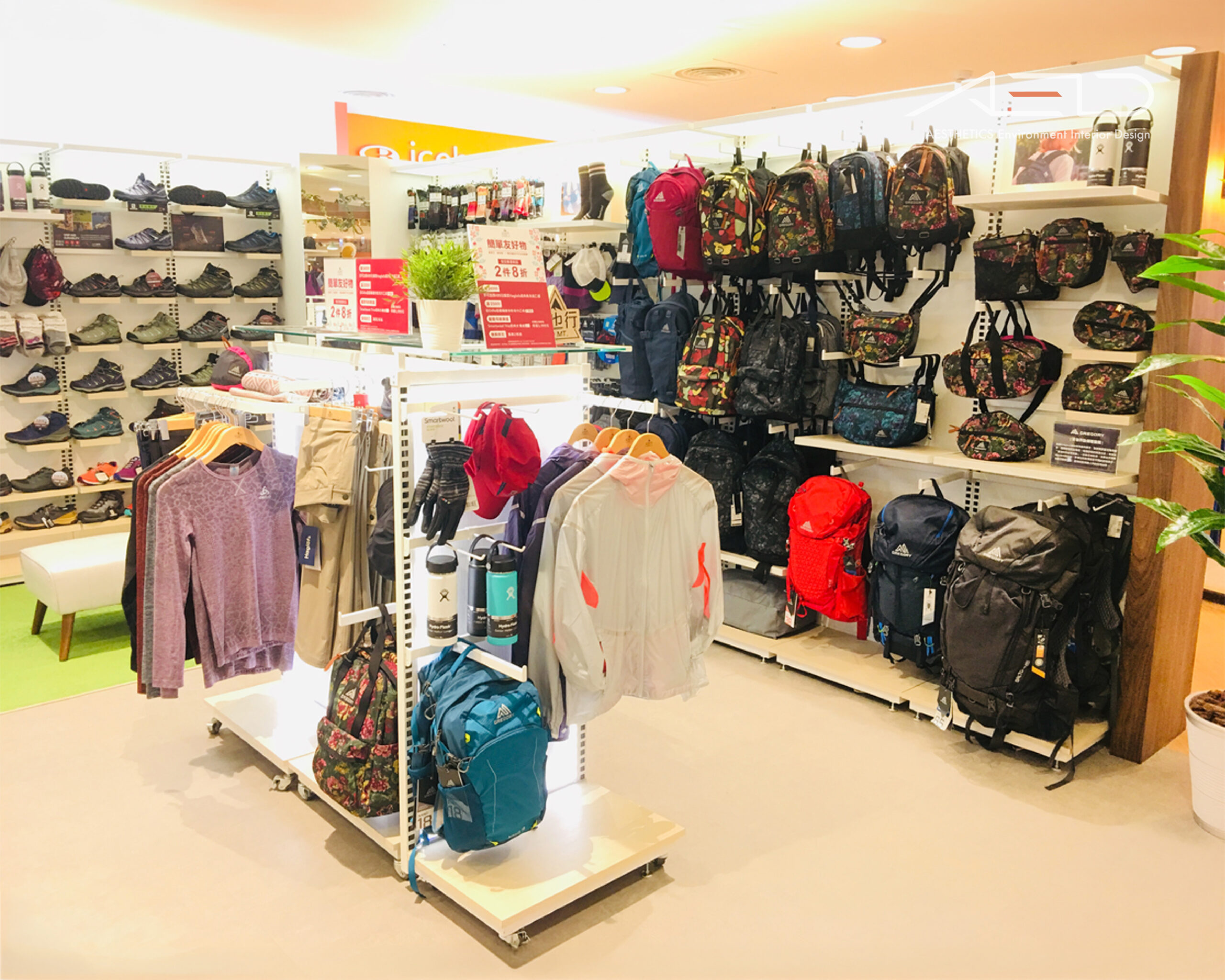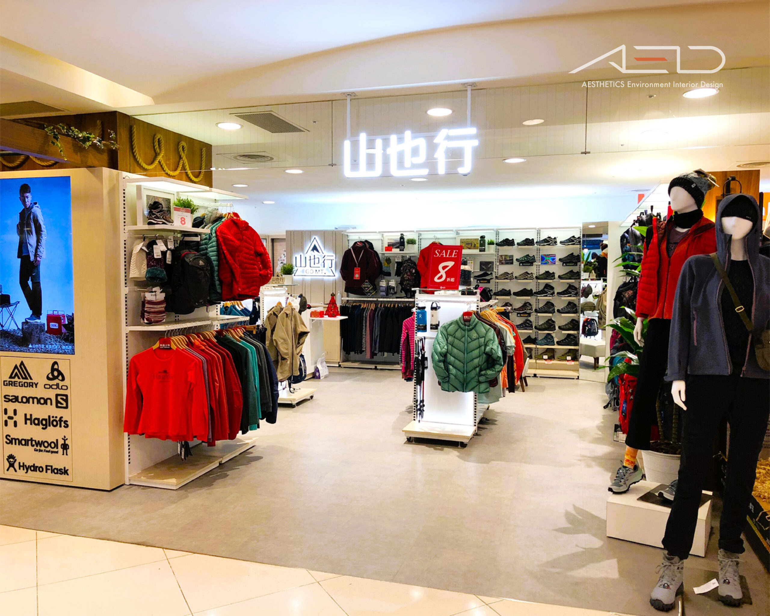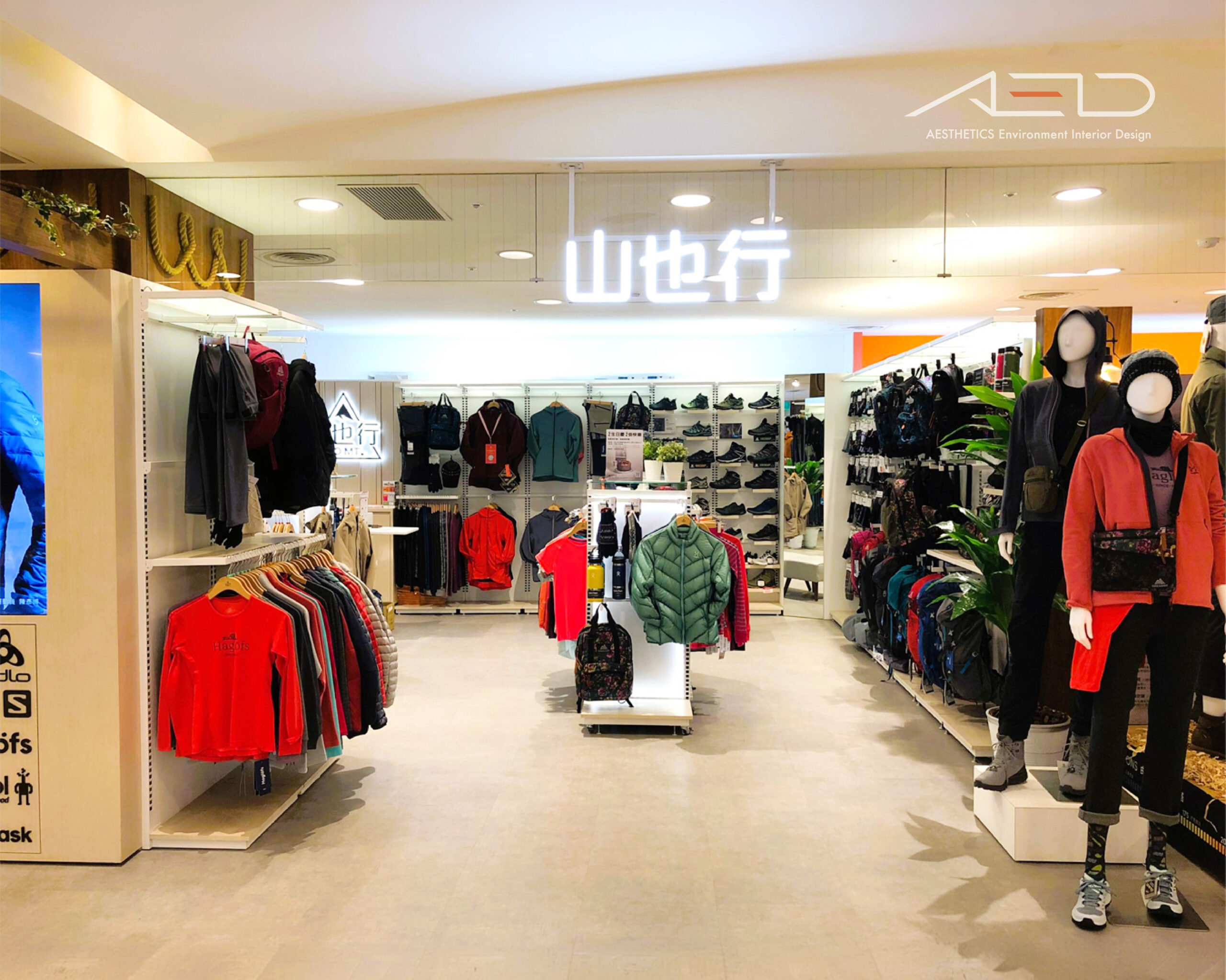 透過模組化展示系統與清晰的商品序列,戶外服飾、裝備與配件被有序整合於空間之中,形成流暢且易於瀏覽的購物動線。