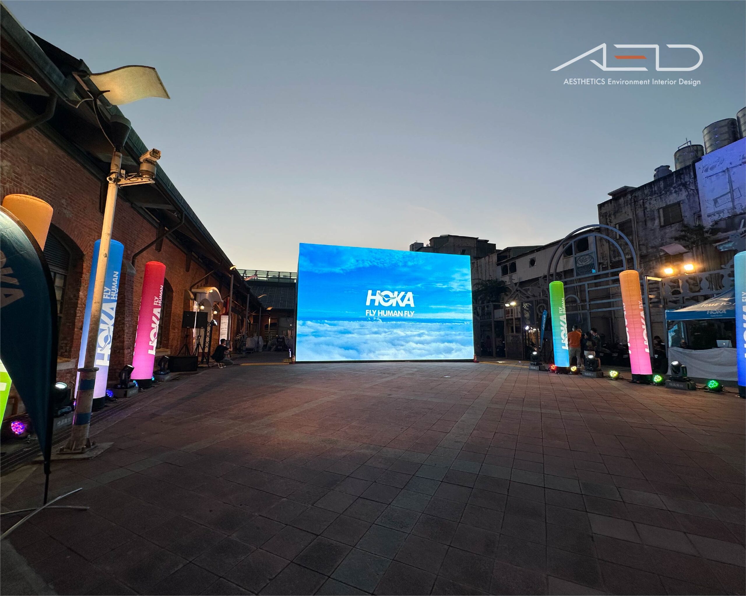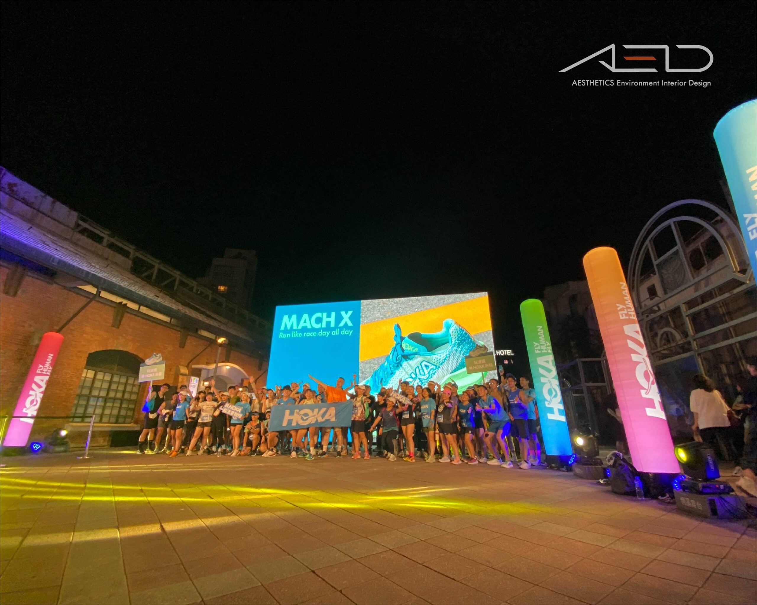場域以大型戶外 LED 主視覺牆、品牌光柱與跑者集結廣場構成活動入口視覺焦點,搭配活動燈光與品牌旗幟裝置,形塑具有速度感與能量感的運動氛圍。