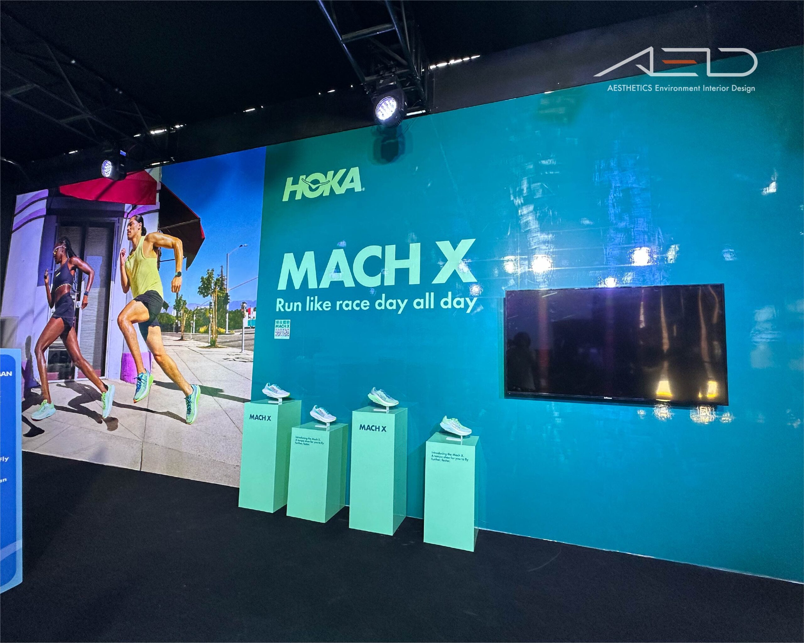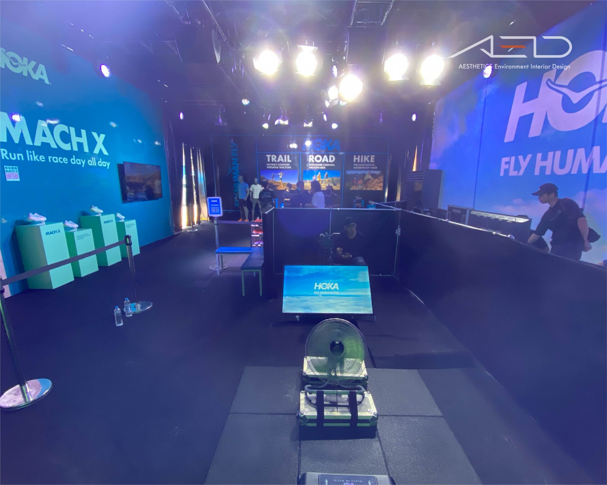 主體空間以沉浸式品牌 Pavilion 結構包覆,整合品牌形象牆、產品展示平台、互動體驗區與跑鞋陳列裝置;透過分區產品展示(Trail / Road / Hike)、模特展示、產品展示台與多媒體螢幕,建立清晰的品牌敘事動線,使跑者在活動、體驗與產品探索之間形成完整的品牌體驗。