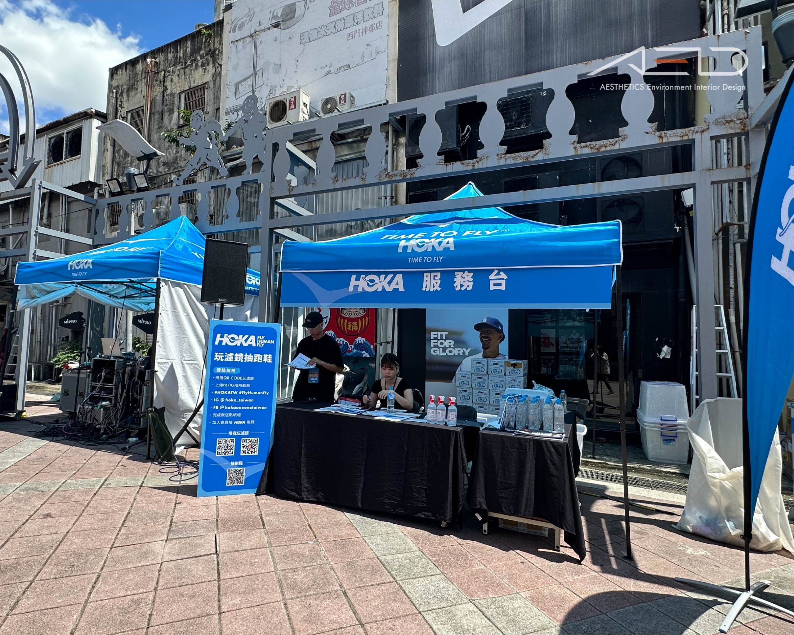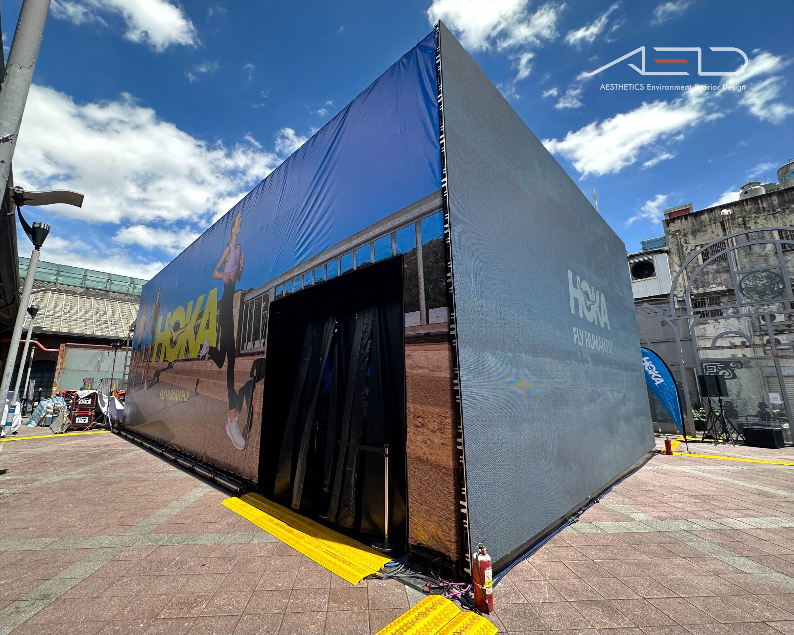 為 HOKA 2023 FLY RUN 品牌活動打造沉浸式品牌體驗場域,以「Fly Human Fly」品牌精神為核心,建立結合跑者社群、產品展示與活動互動的戶外運動空間。