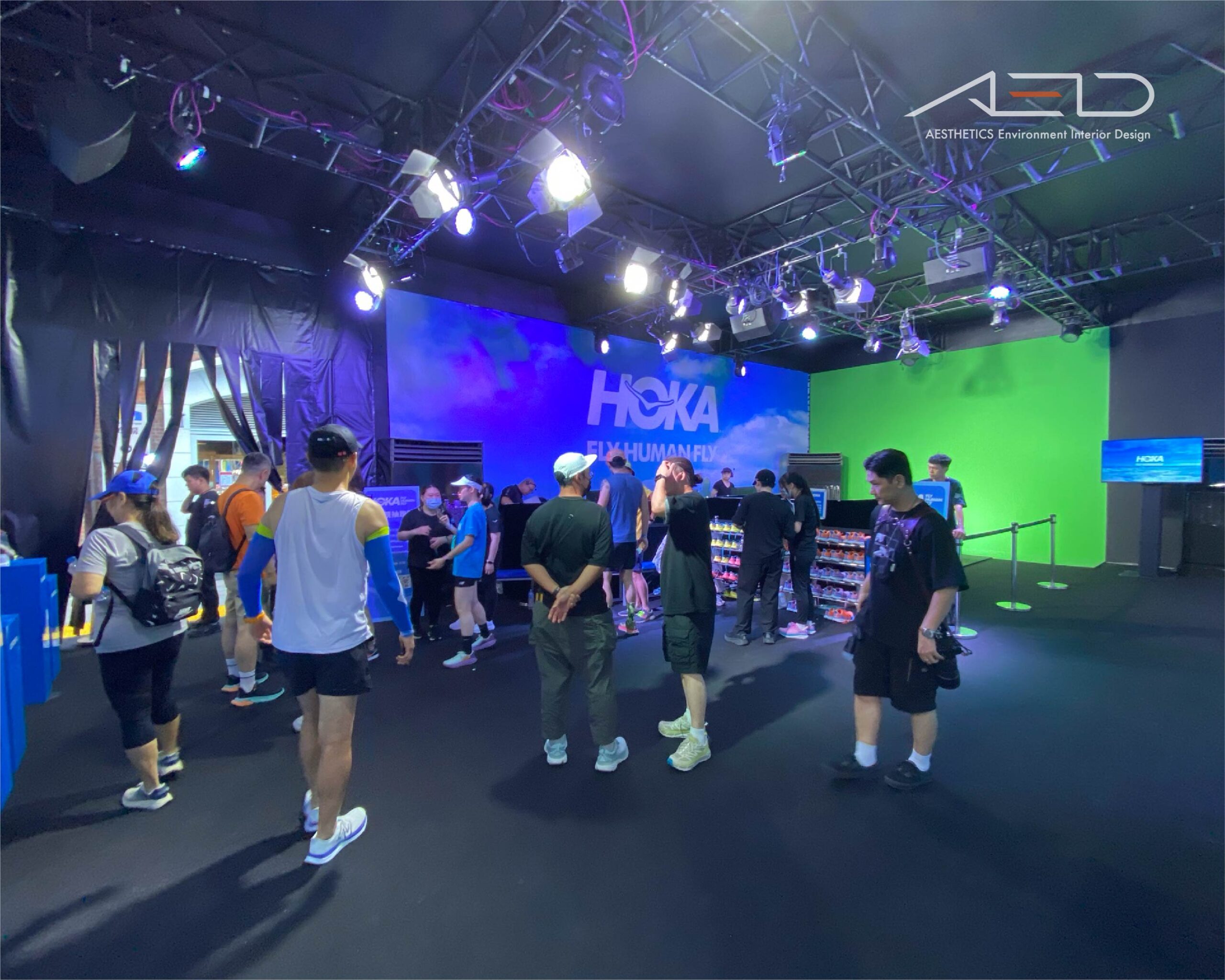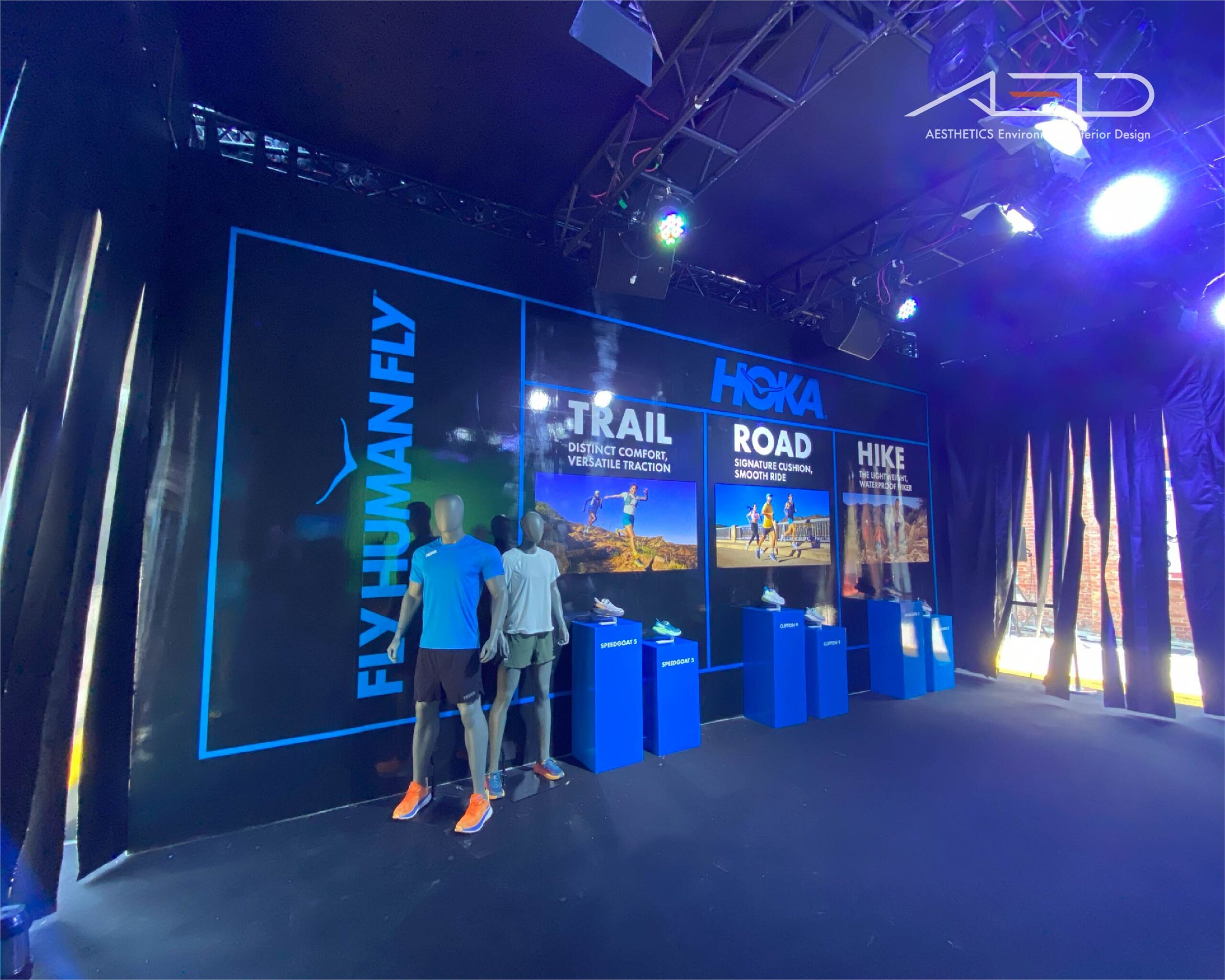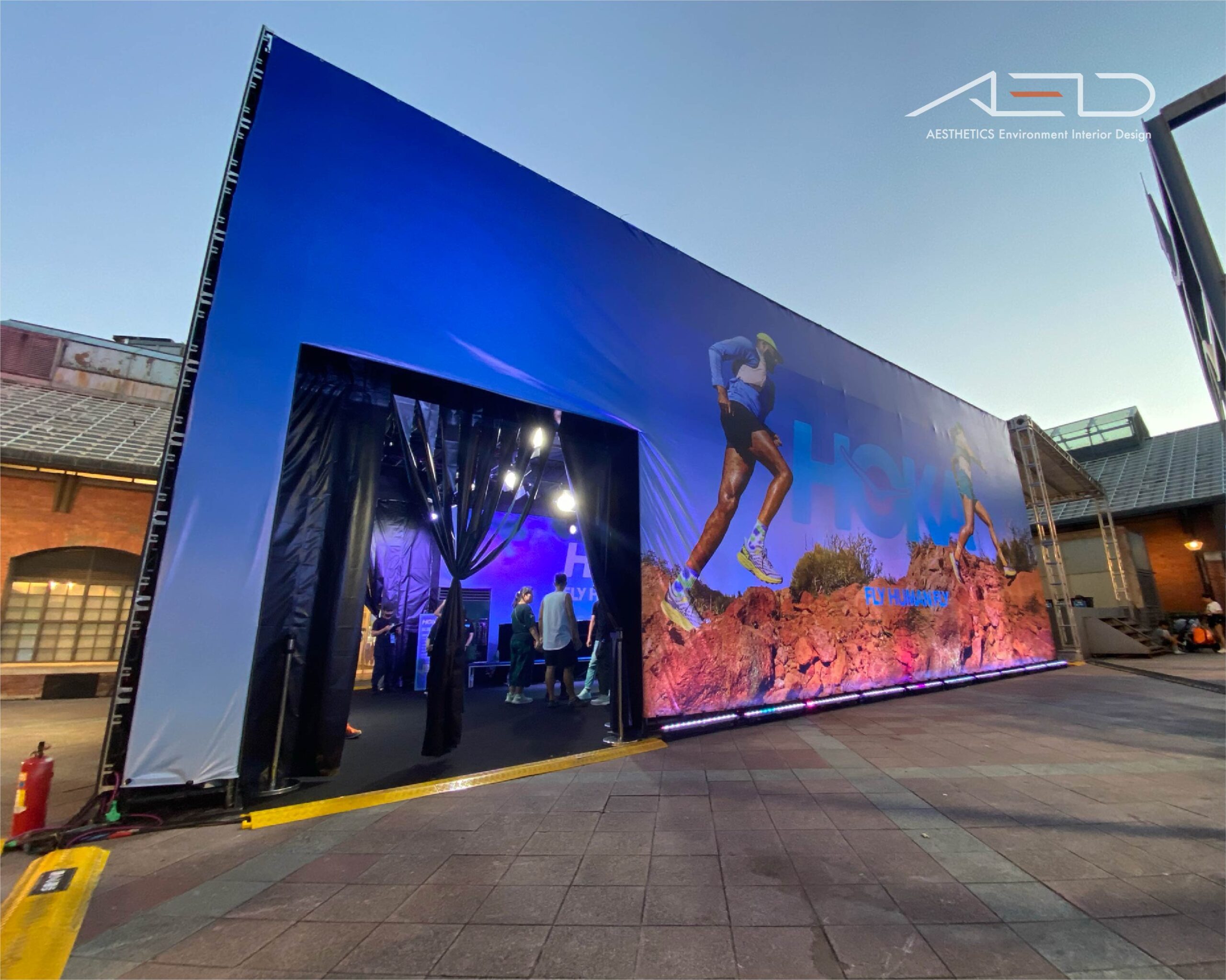 An immersive brand pavilion was designed for HOKA FLY RUN 2023, translating the brand’s “Fly Human Fly” philosophy into an experiential environment that connects the running community with product discovery and live event engagement.