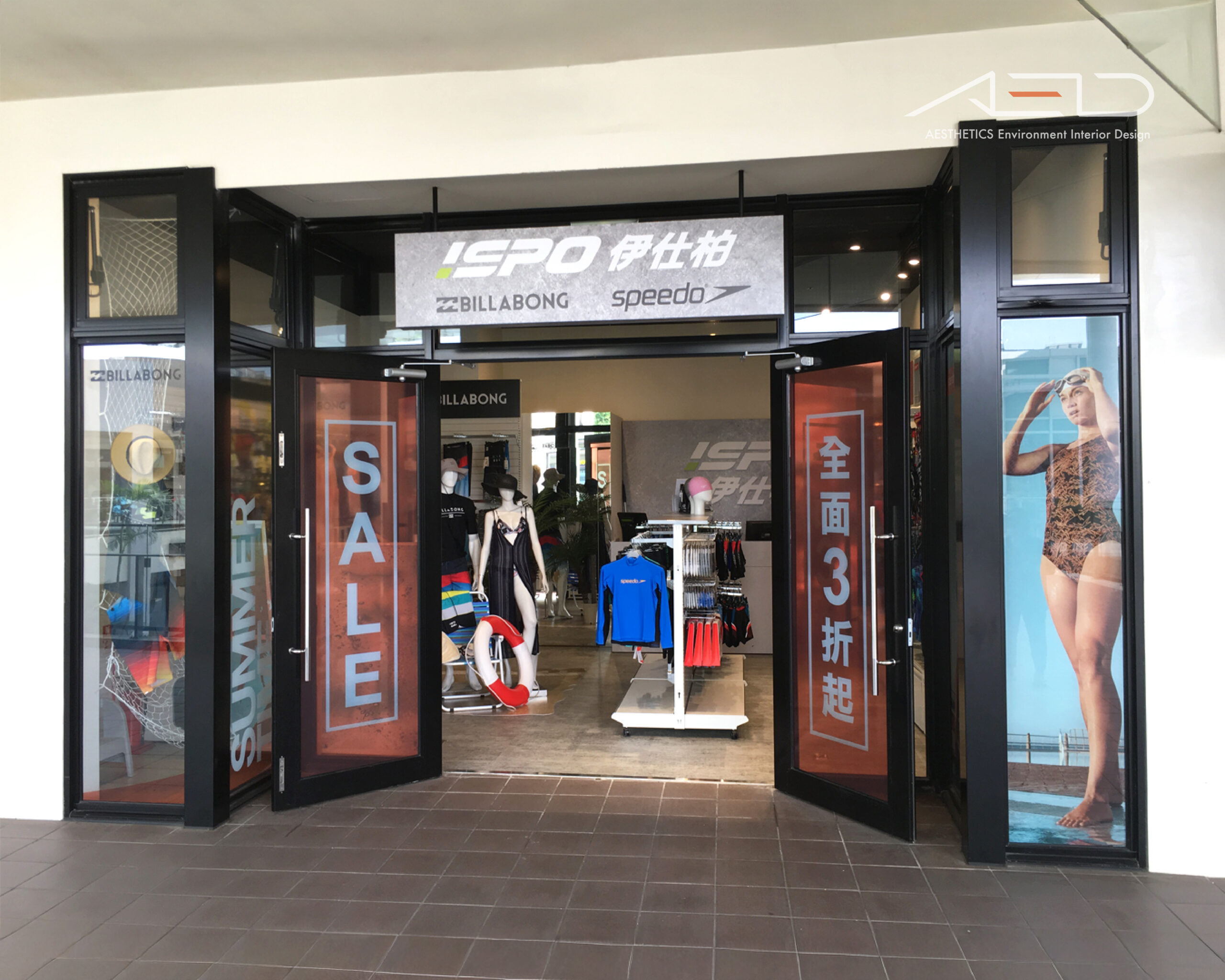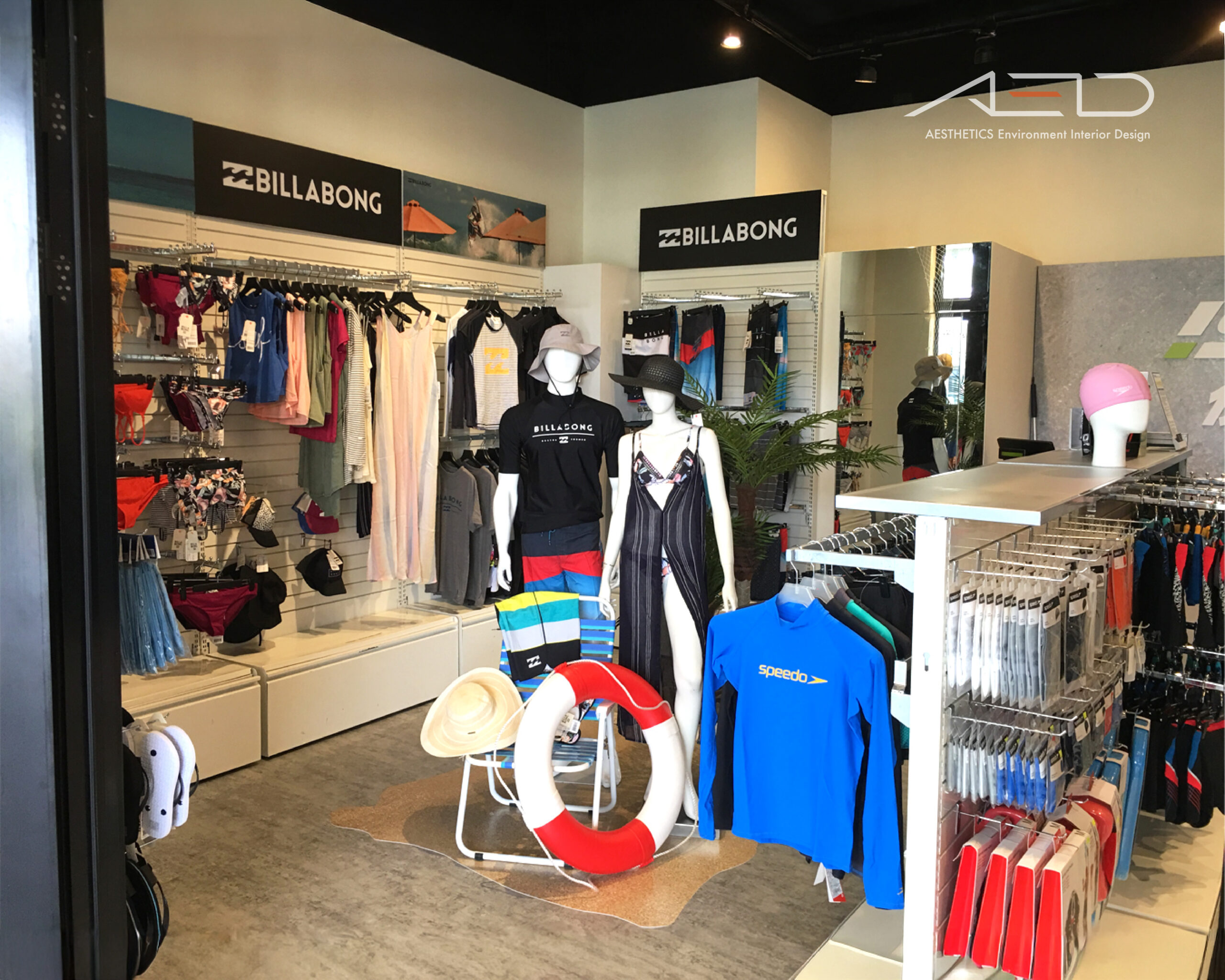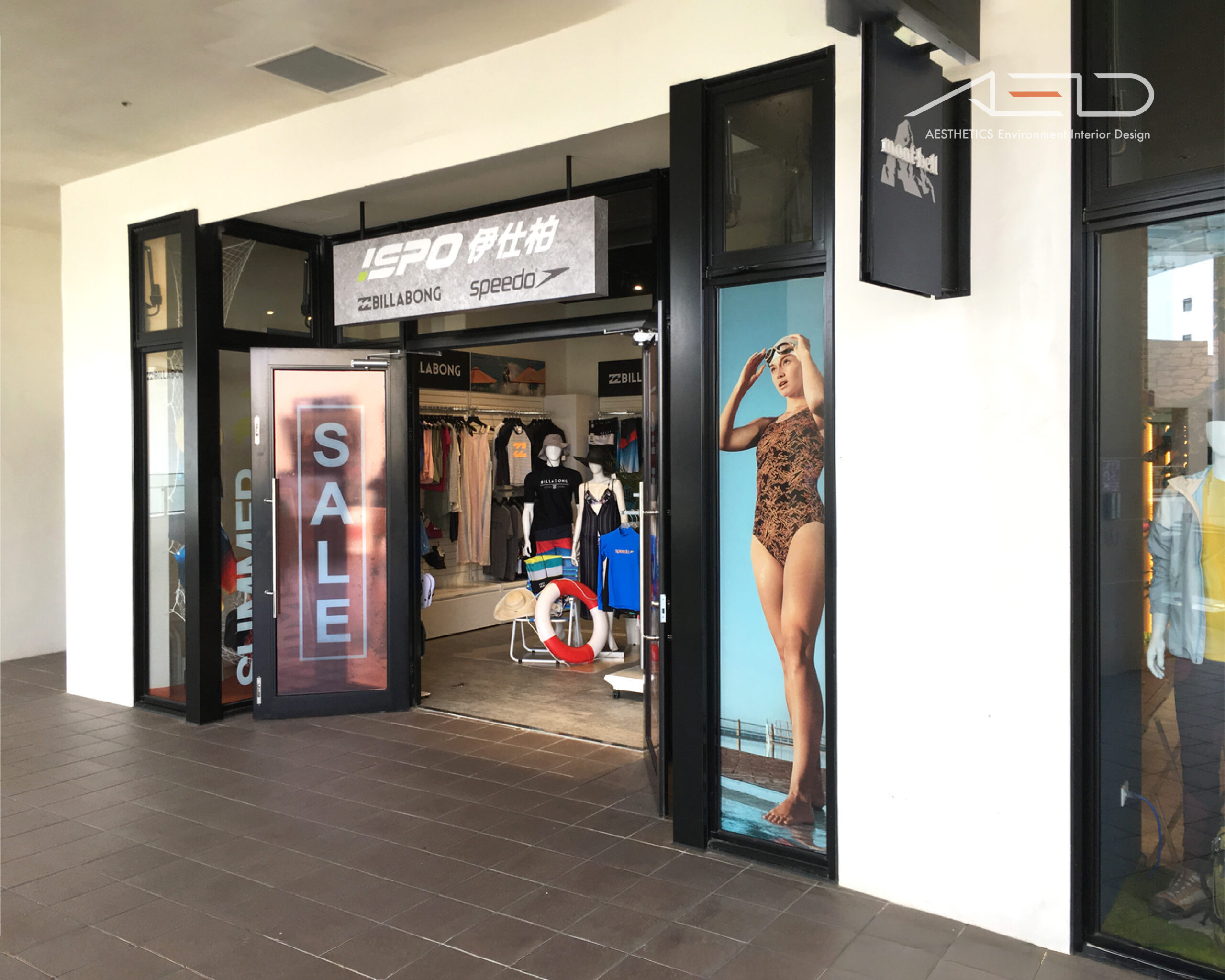 The spatial layout integrates displays for ISPO, Billabong, and Speedo, with clear circulation paths and a simple display system that presents merchandise with greater clarity, layering, and order.