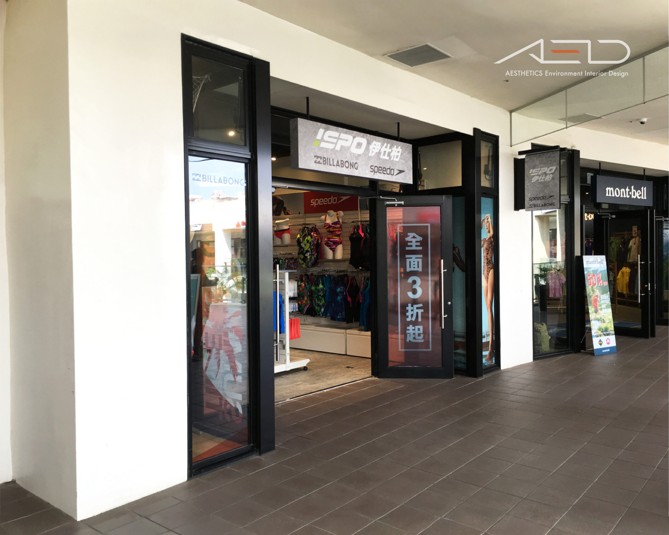 空間規劃整合 ISPO、Billabong、Speedo 等品牌展示,透過清晰動線與簡潔陳列架構,讓商品呈現更有層次與秩序。