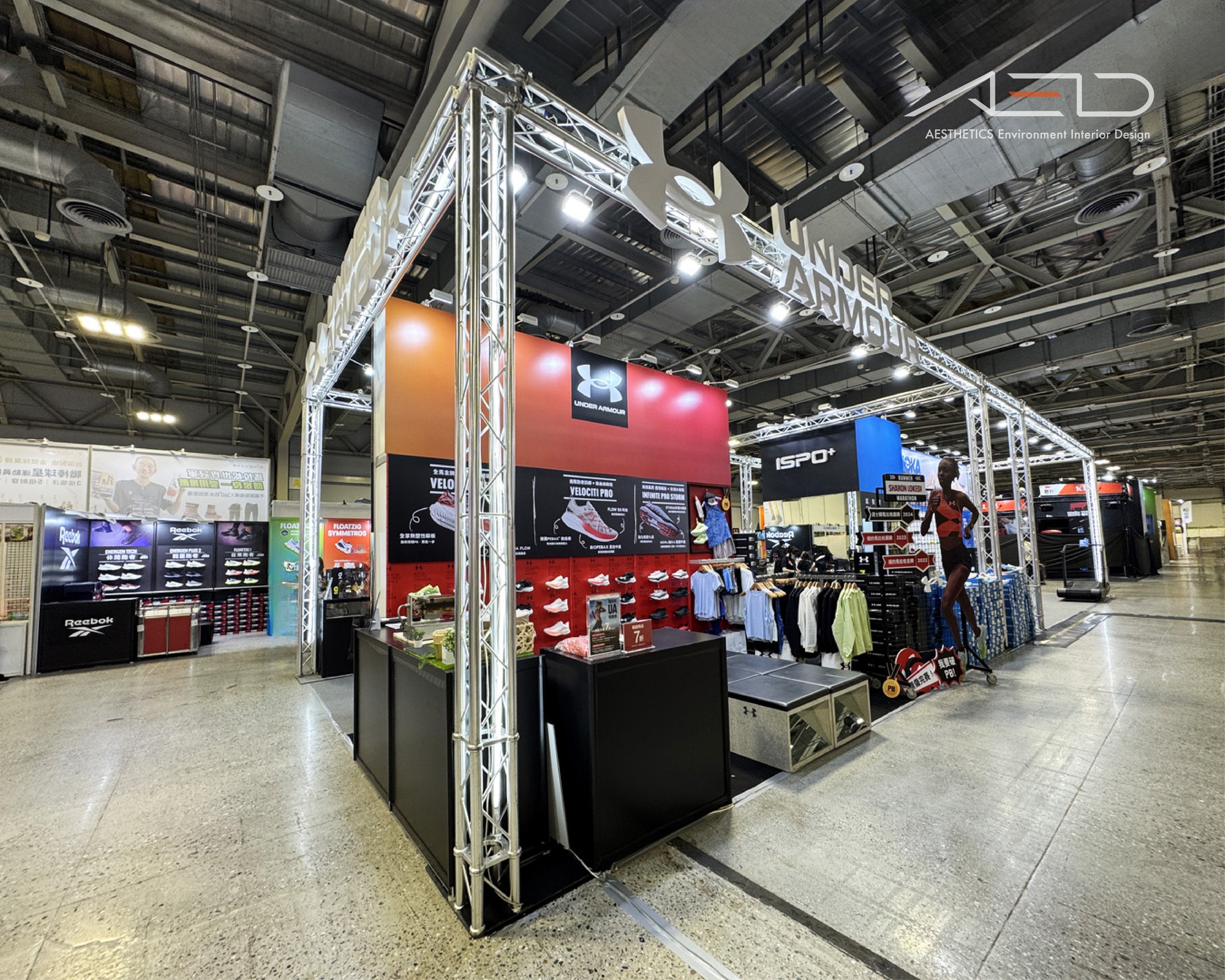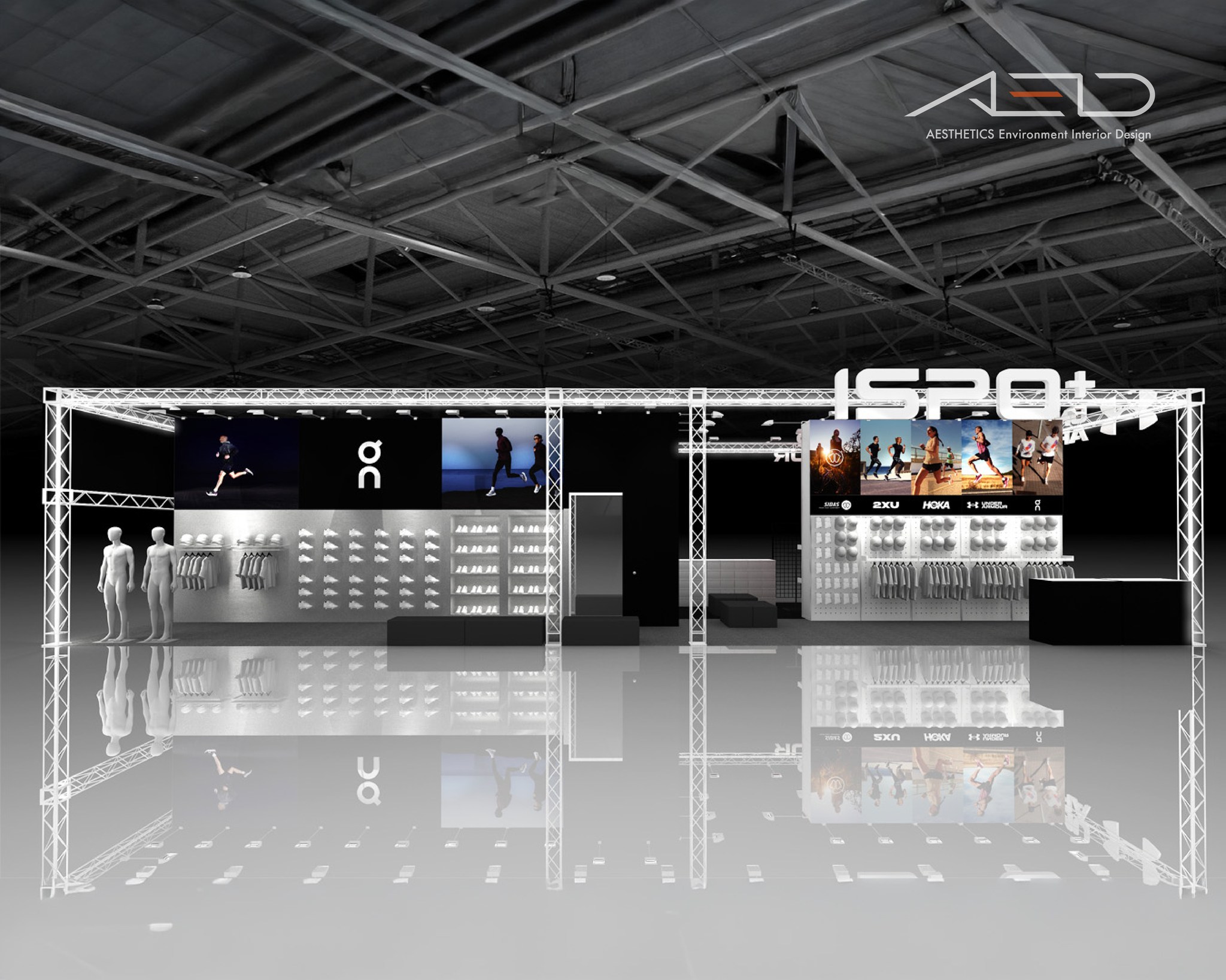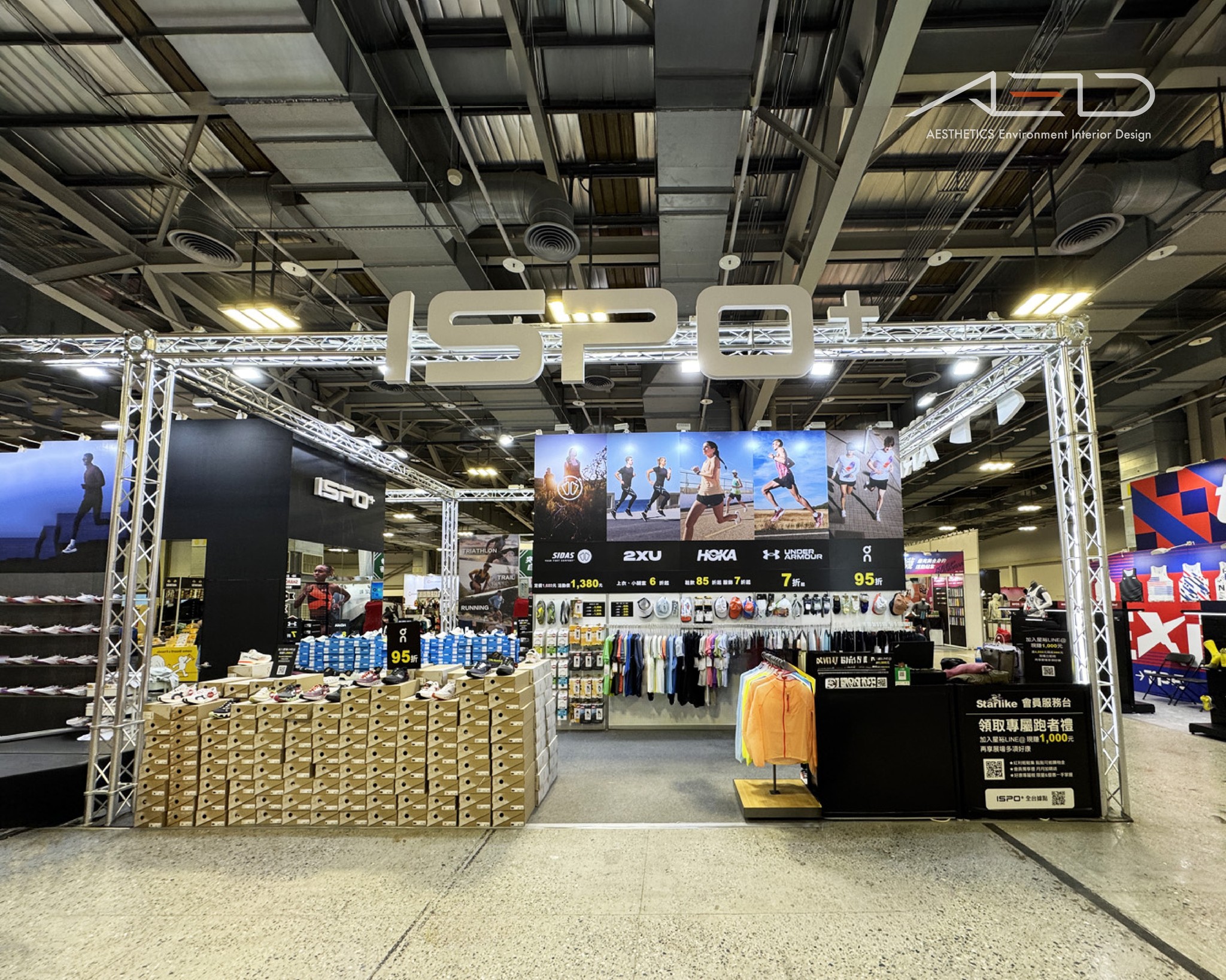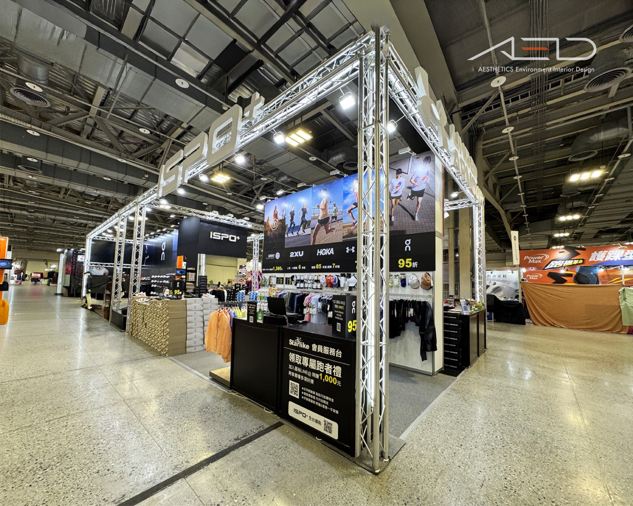 A large-scale multi-brand exhibition booth was designed for ISPO at the 2024 Taipei Marathon Expo, integrating performance sports brands including On, HOKA, 2XU, and Under Armour into a cohesive and high-visibility retail environment.