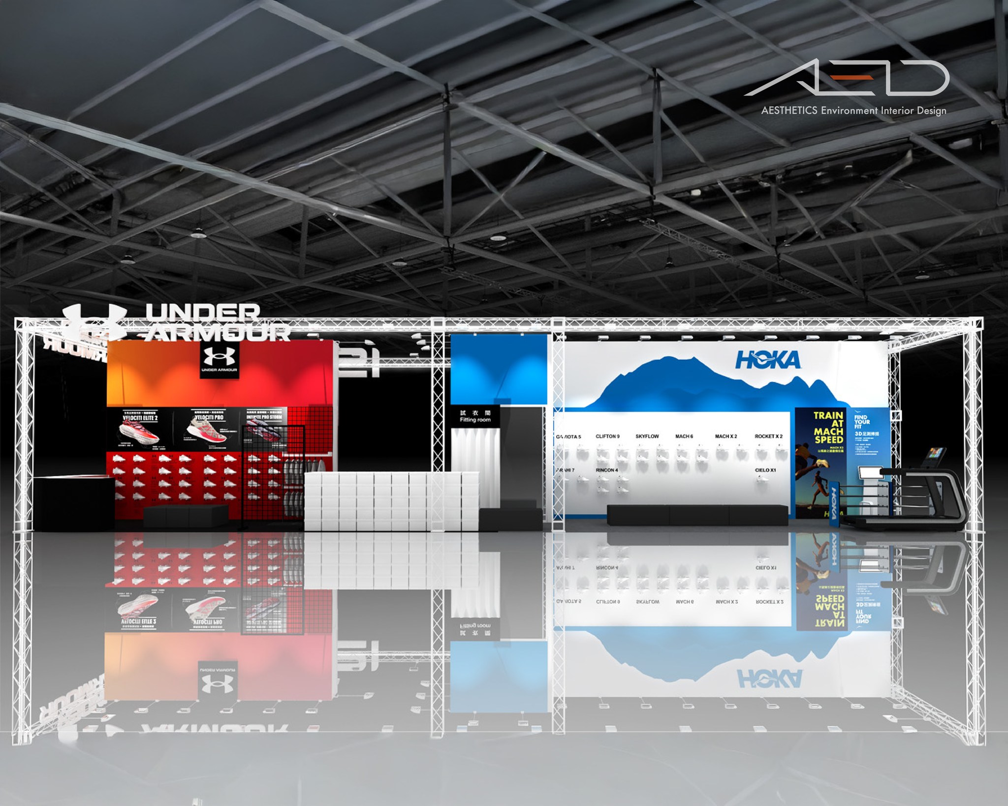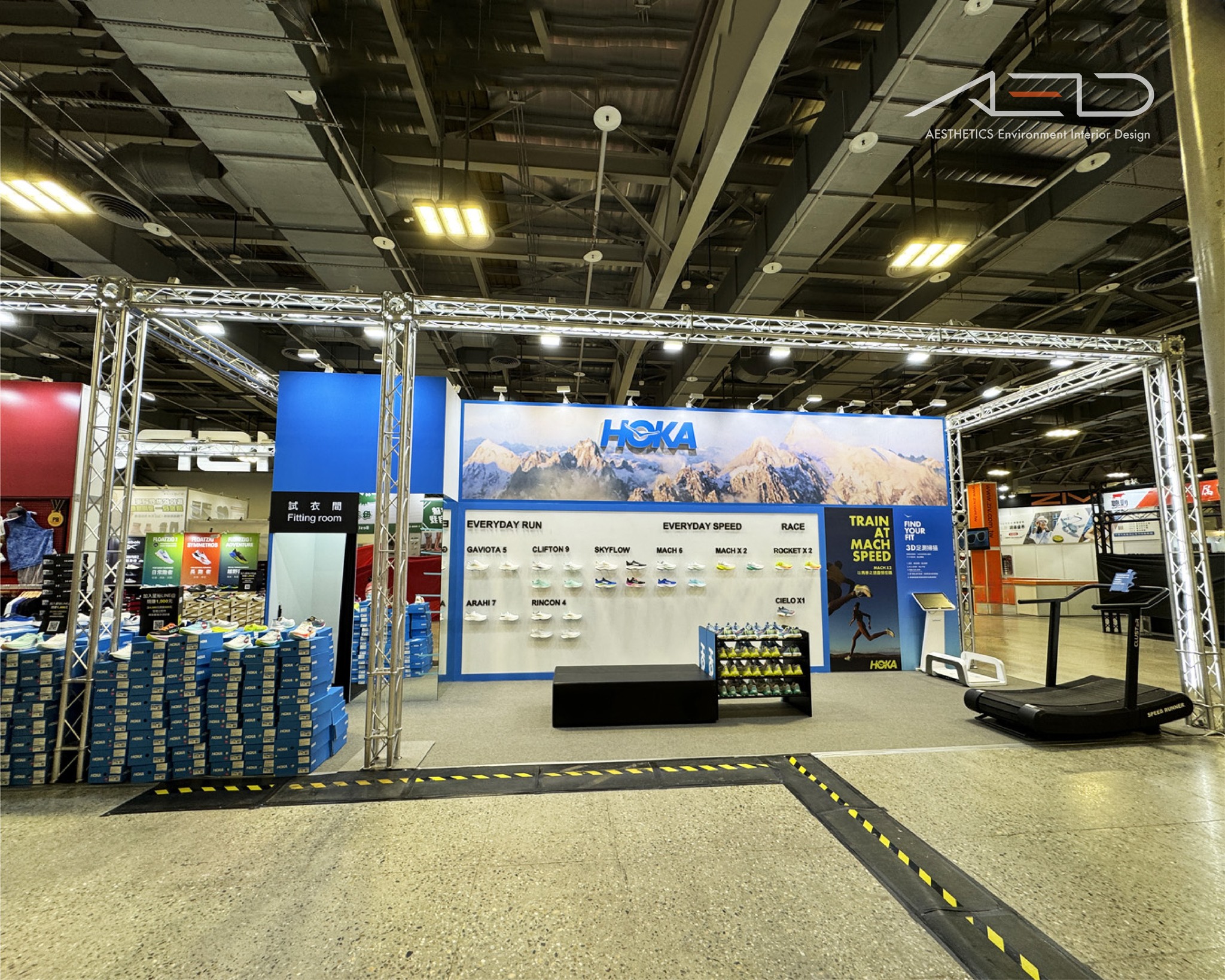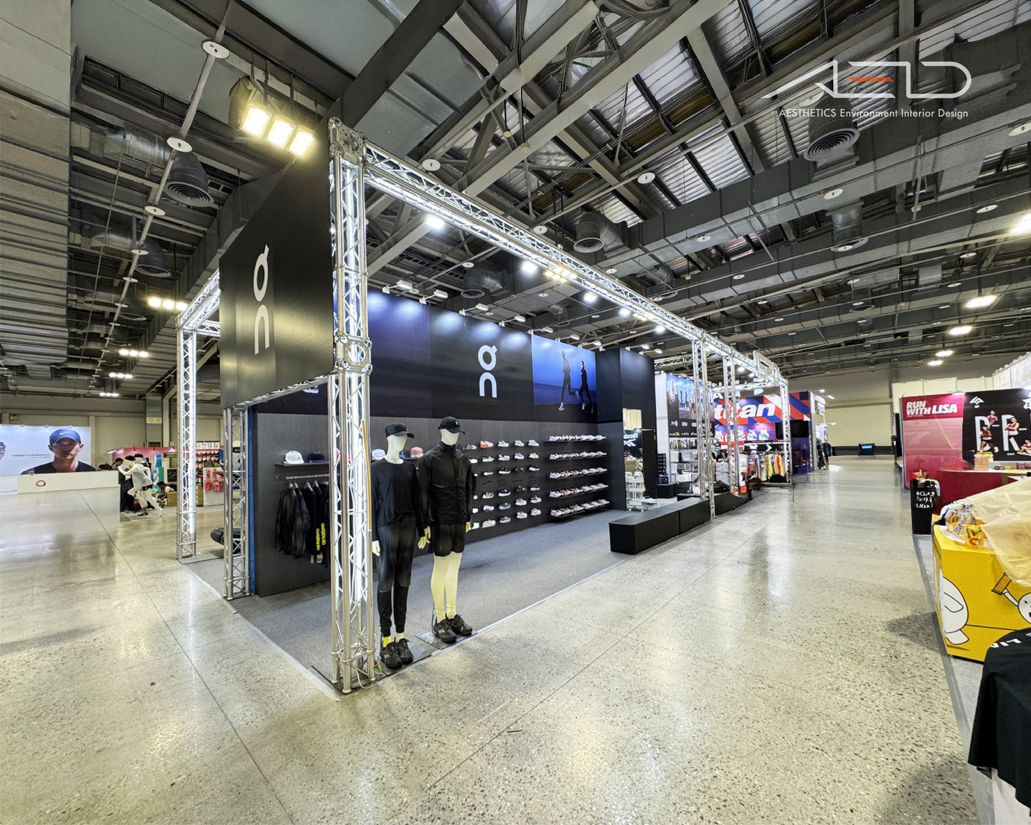 建構開放式展覽框架,結合高識別品牌視覺牆、跑者形象輸出與產品科技展示區,形成具有速度感與科技感的運動展示氛圍。
