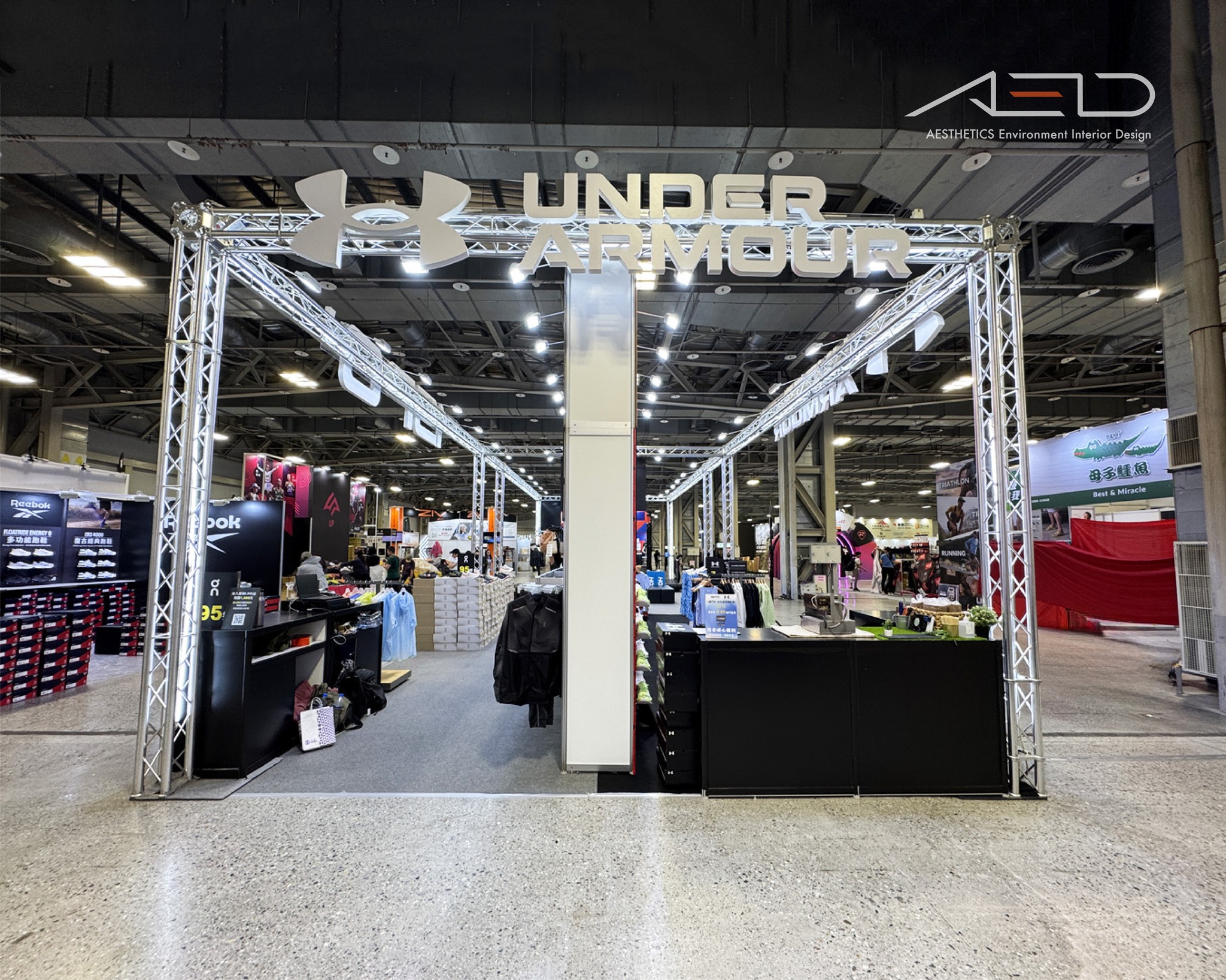 The space is structured with a modular aluminum truss framework, creating an open architectural layout complemented by large-scale athlete visuals, brand identity walls, and product technology displays that convey speed, movement, and performance.