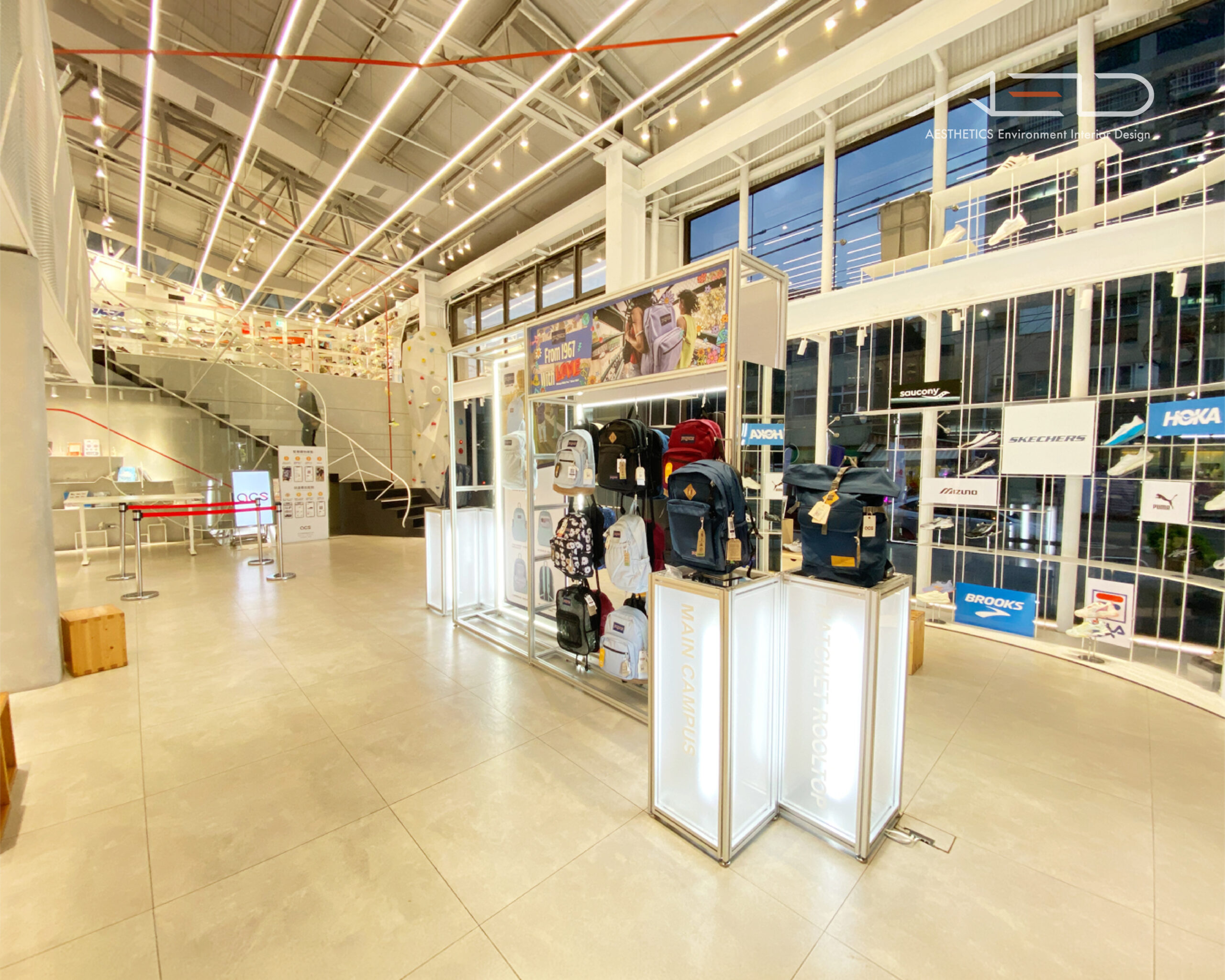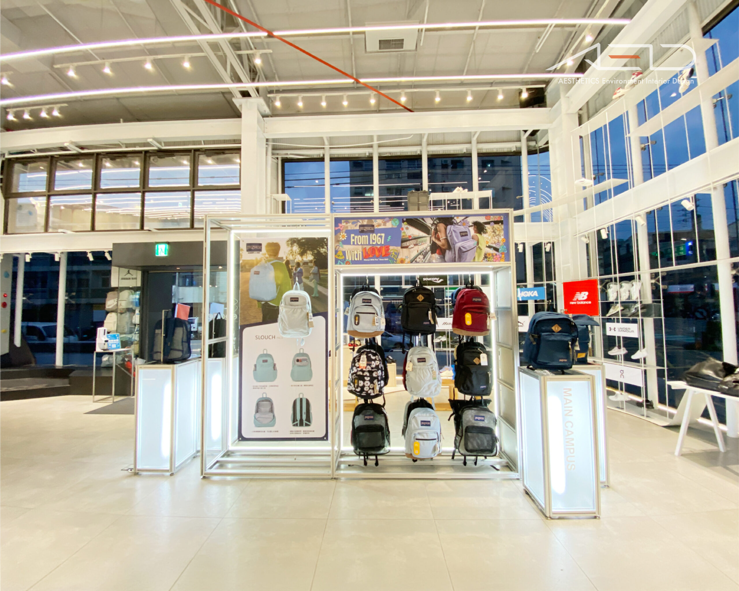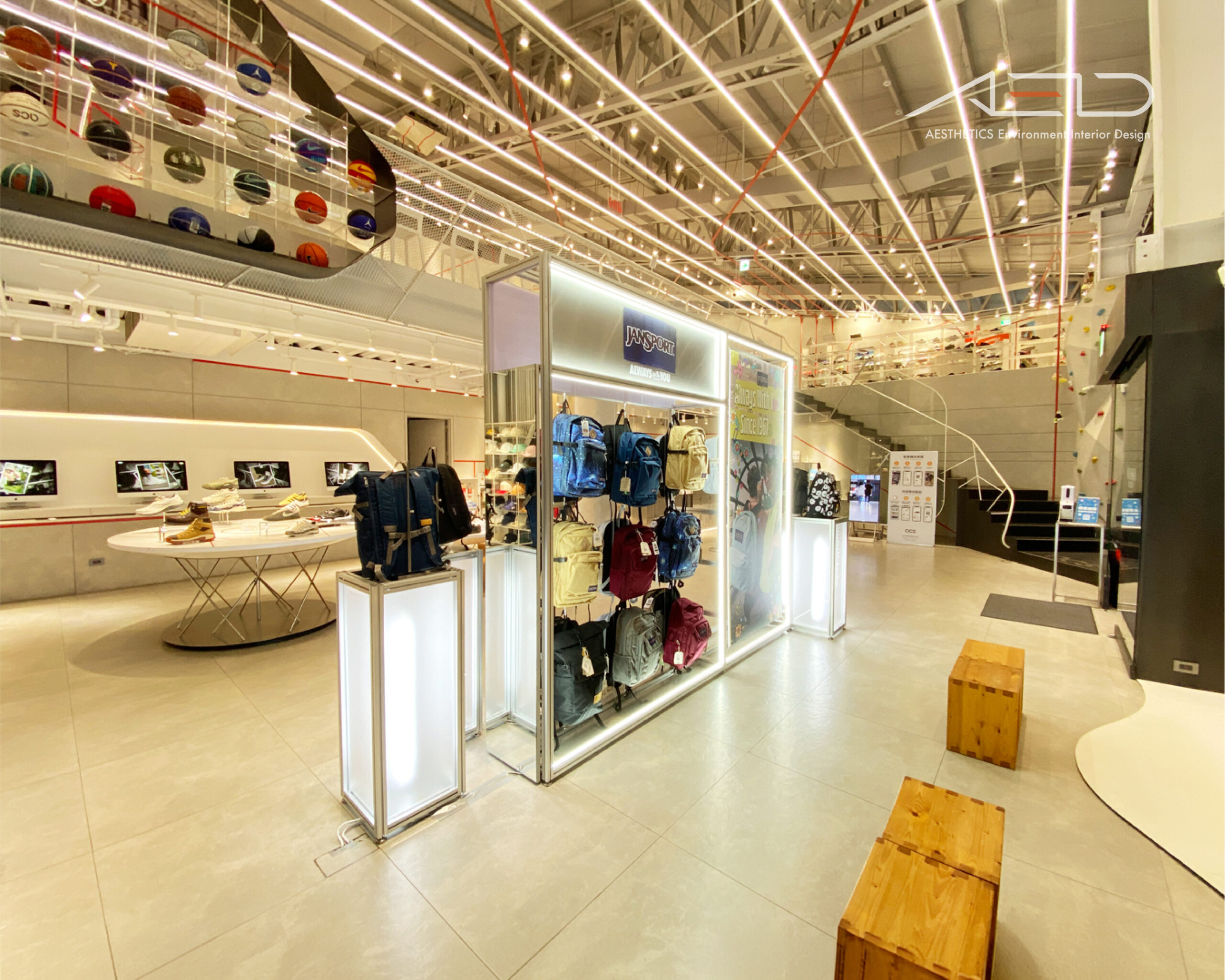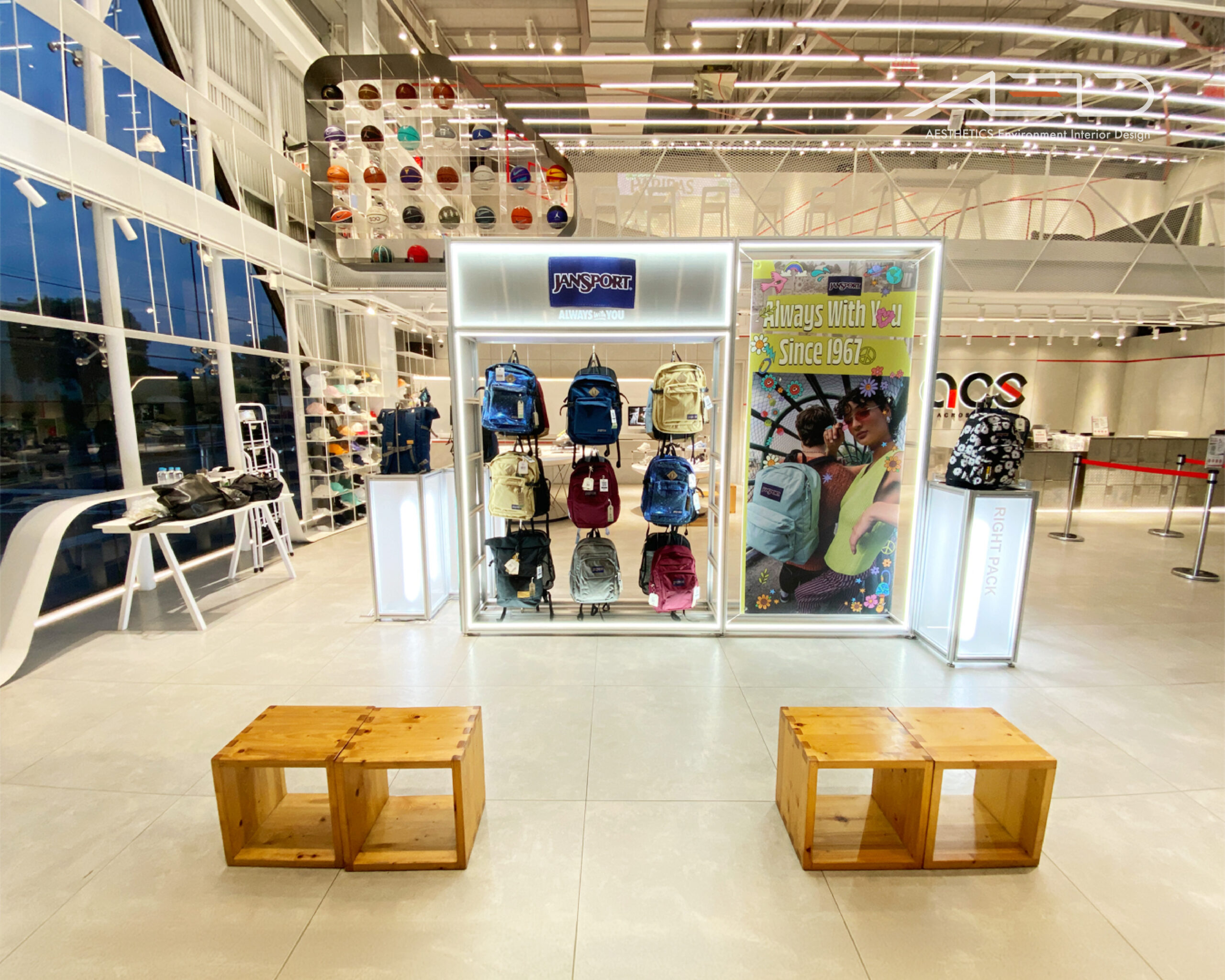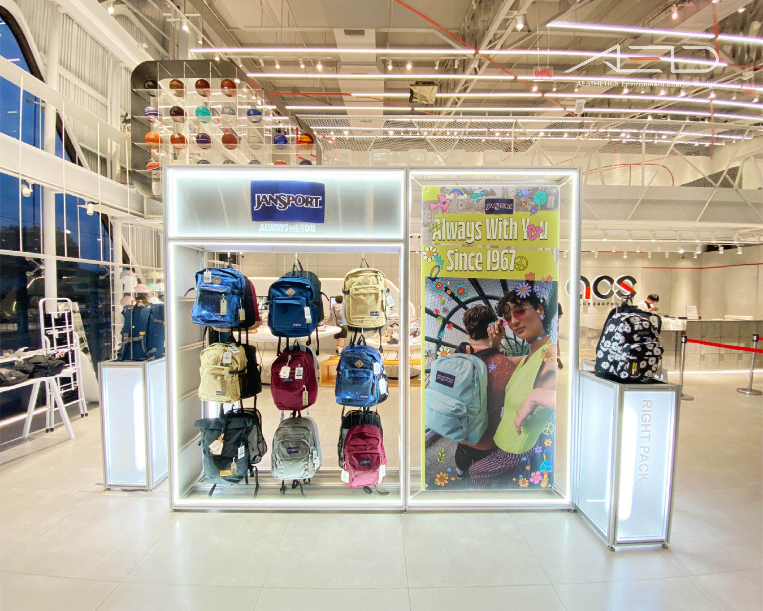 為 JANSPORT 於 ACS 跨運動場域打造品牌快閃展示櫃,透過開放式空間中的品牌裝置,建立清晰且具有辨識度的展示焦點。