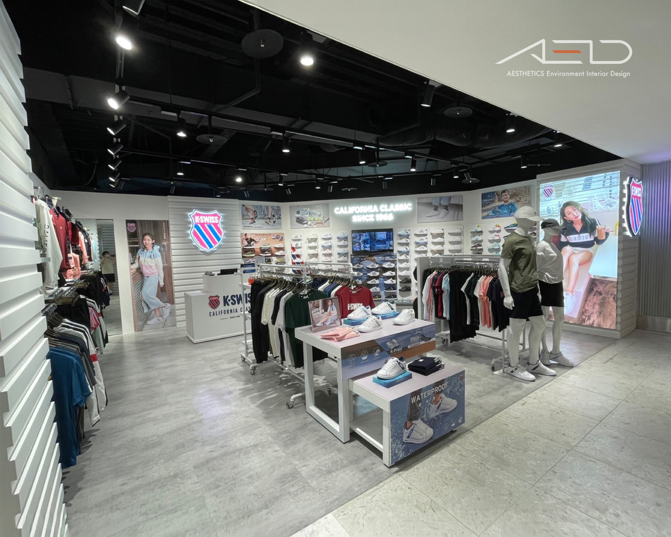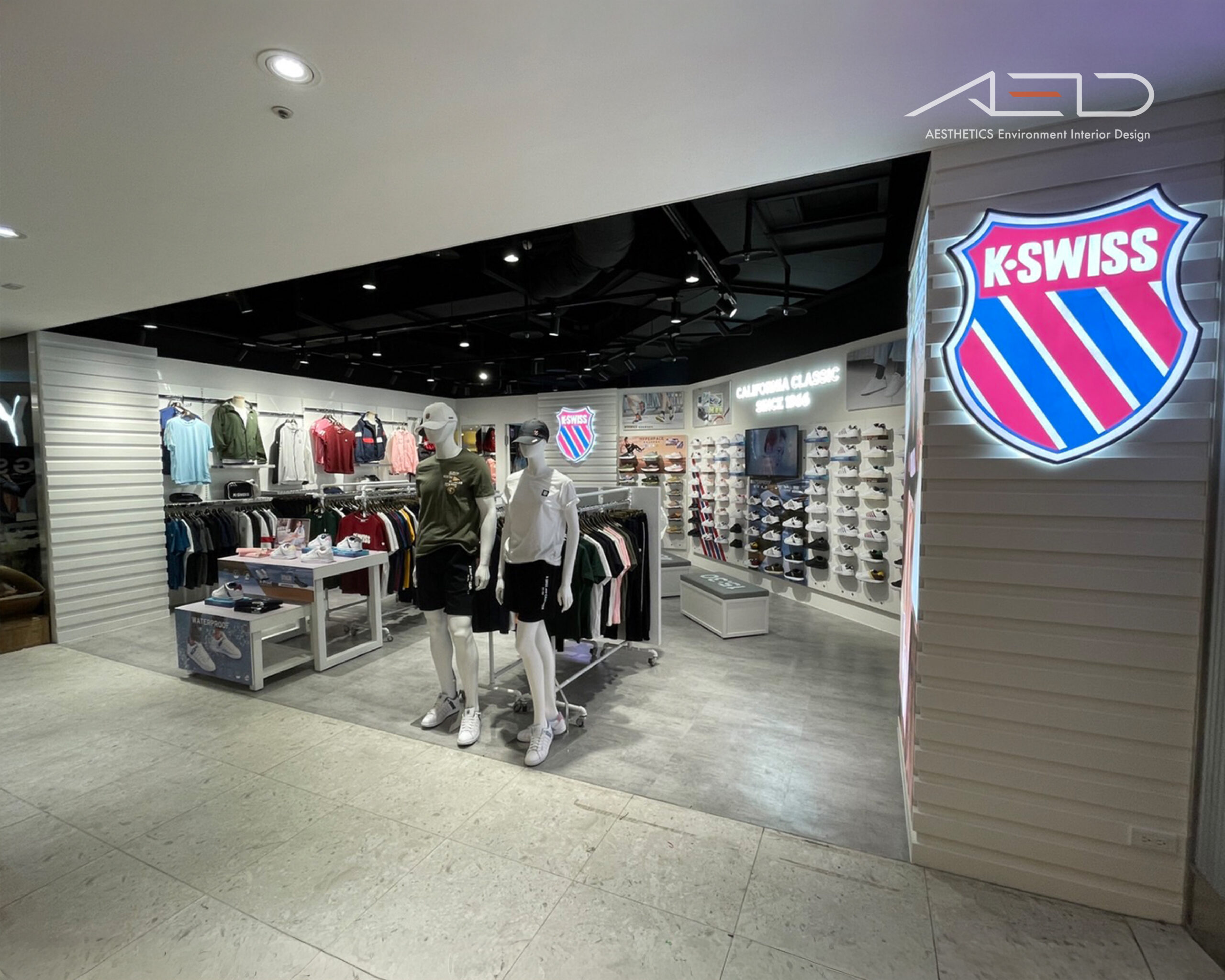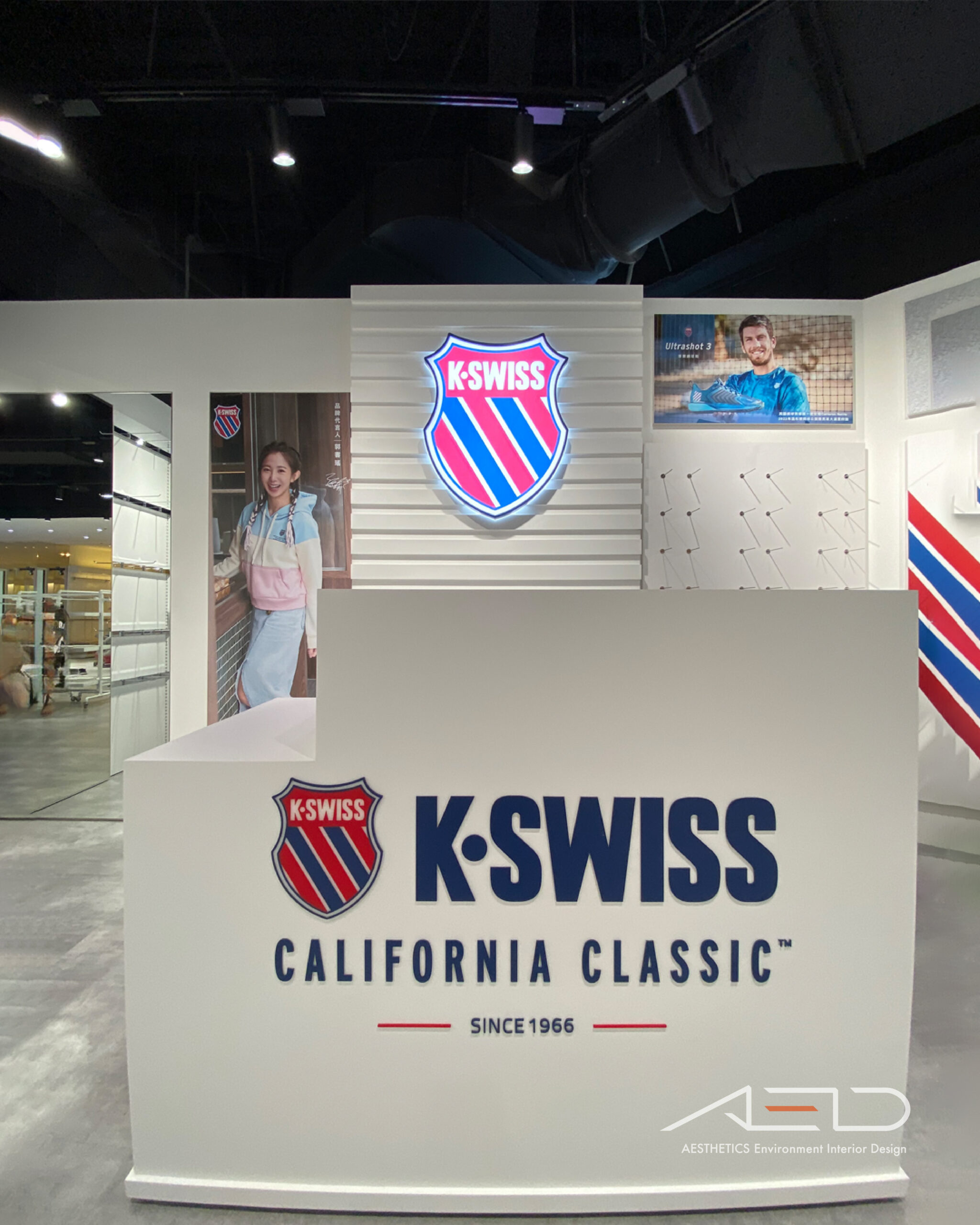 發光品牌盾牌 LOGO 建立清晰的品牌識別界面,使 K-SWISS 在百貨動線中形成鮮明且具辨識度的運動品牌入口。