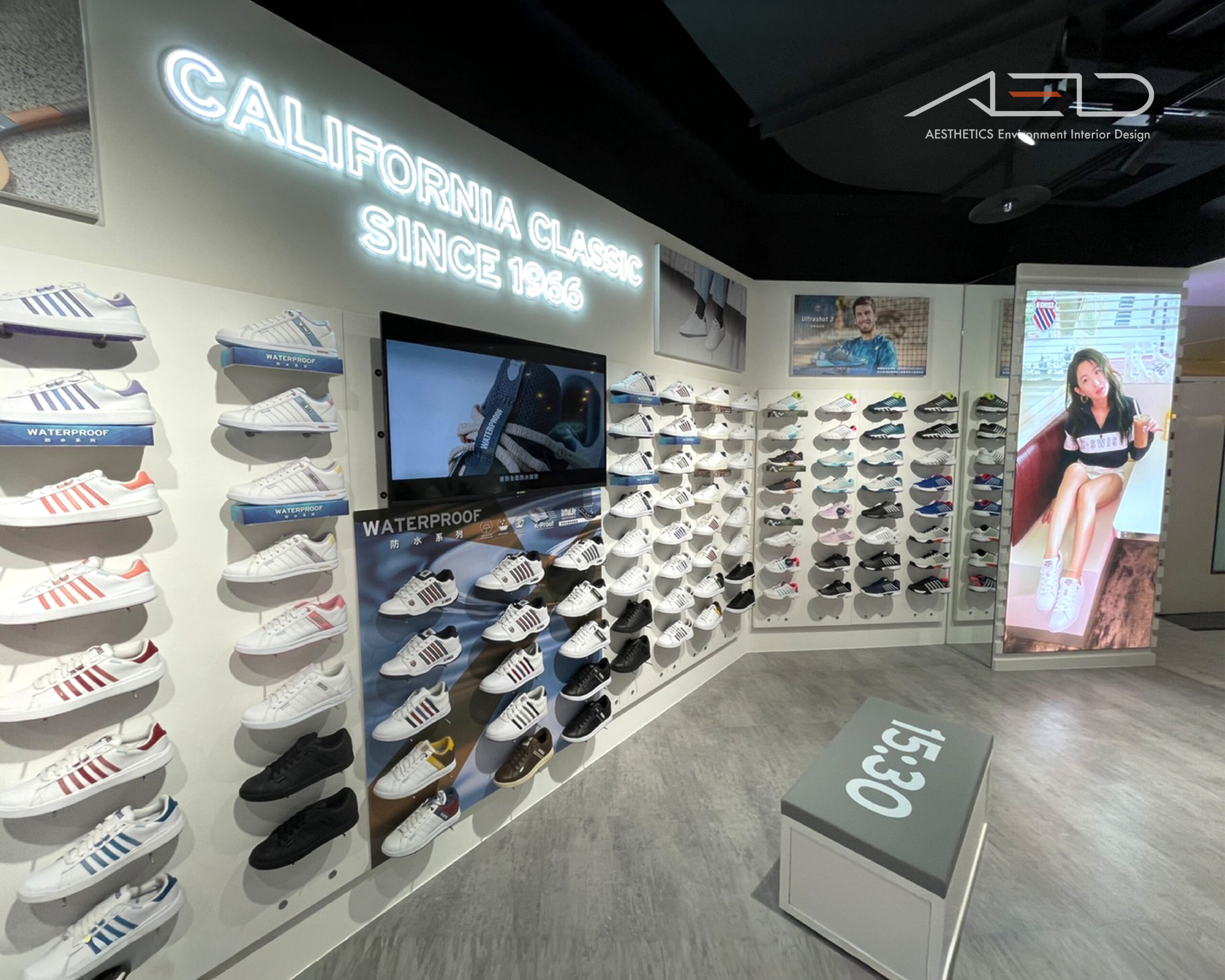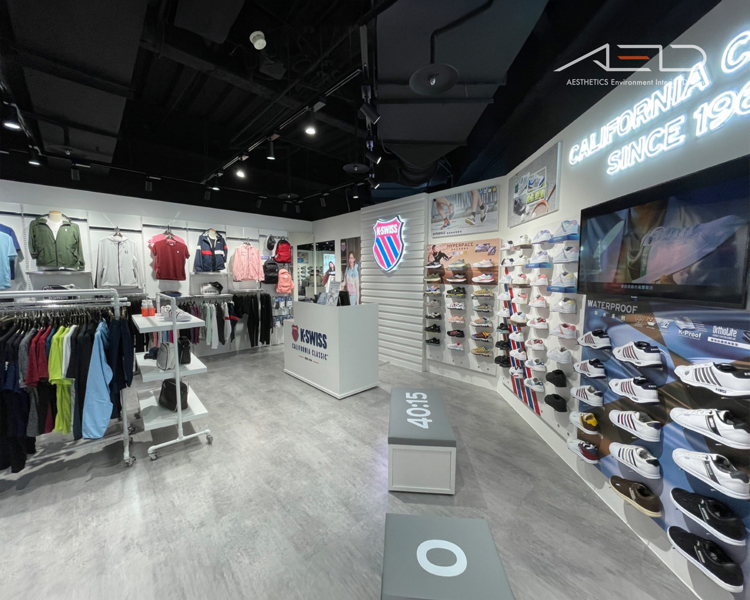 品牌形象牆整合數位影像螢幕、燈箱視覺與發光字標,收銀櫃檯與櫃內陳列形成空間視覺節點;透過簡潔材質的陳列道具與整合照明設計,營造俐落且具有國際感的運動品牌零售空間。