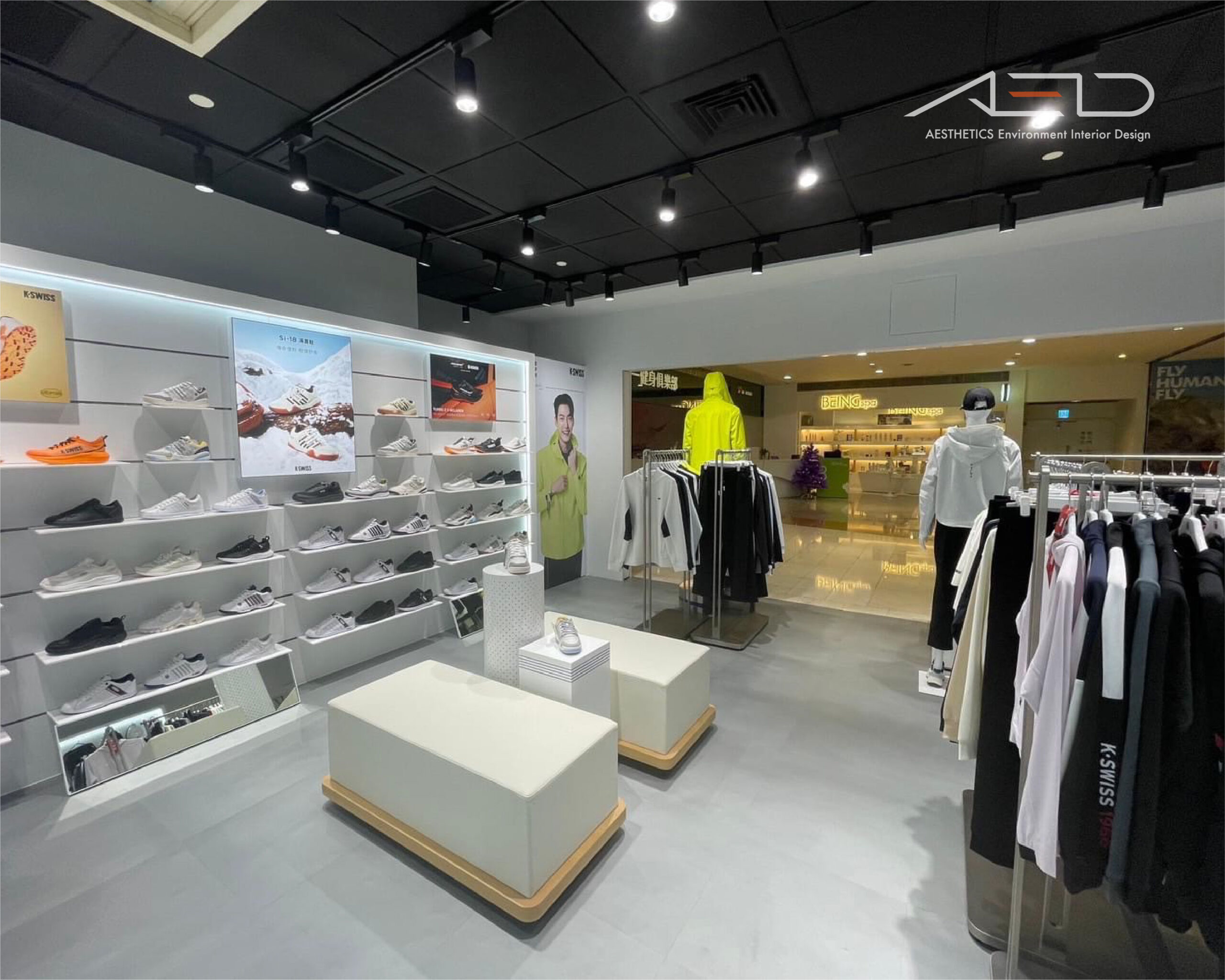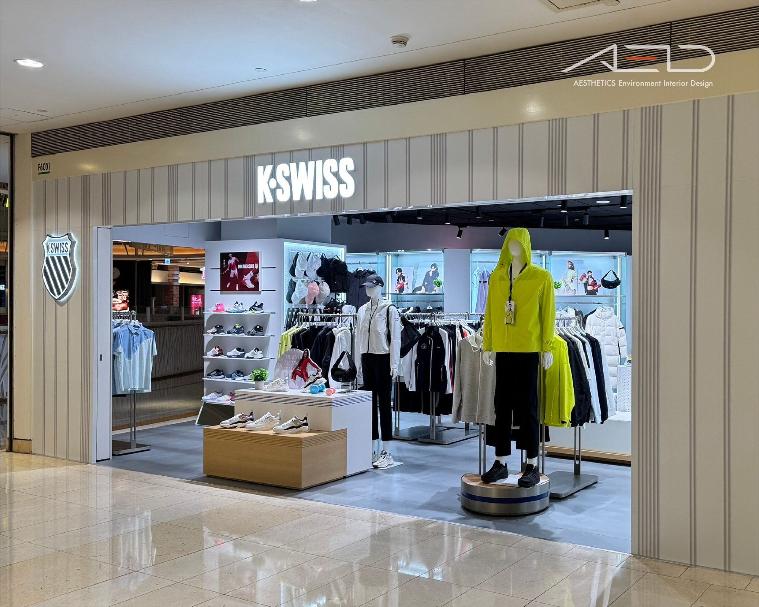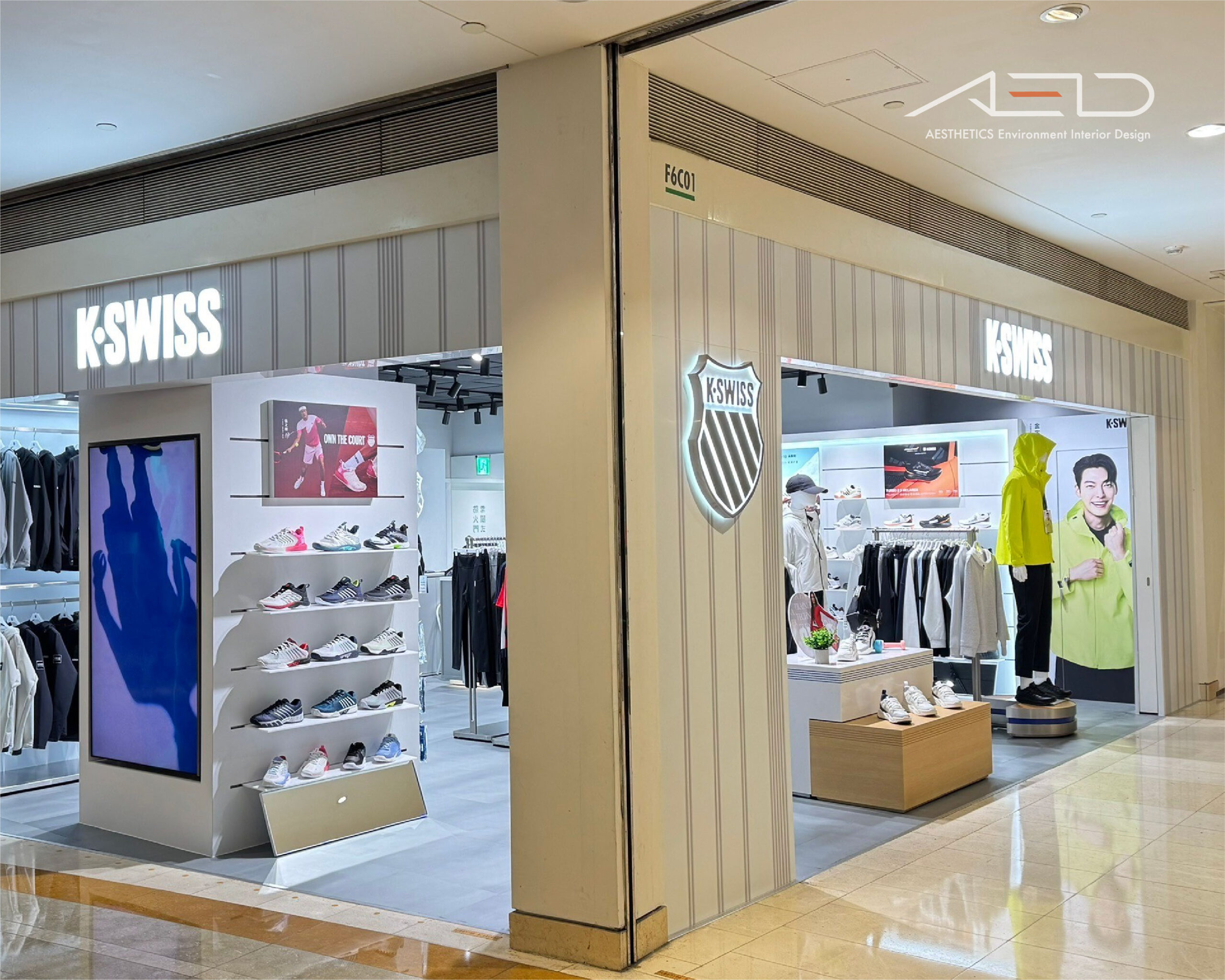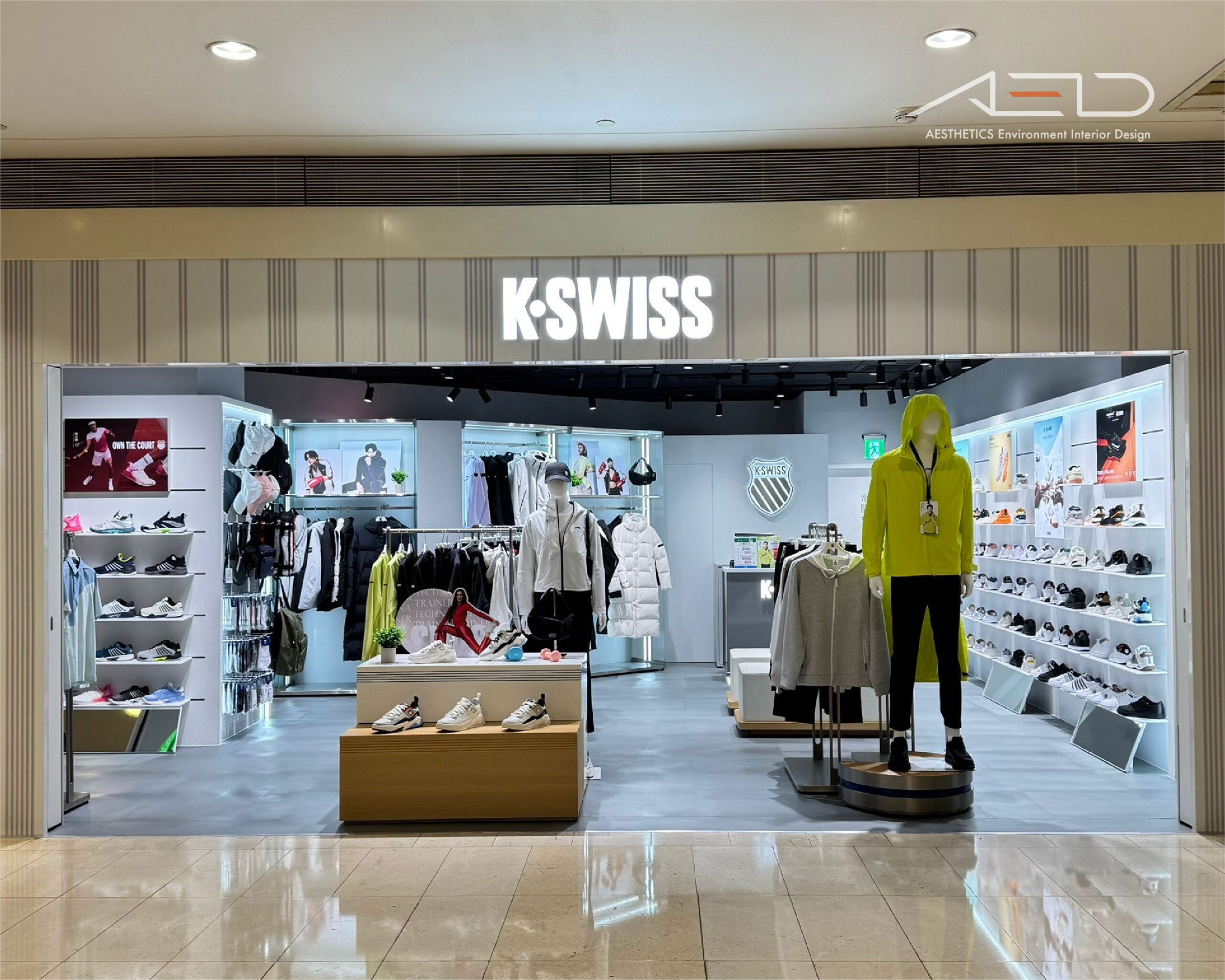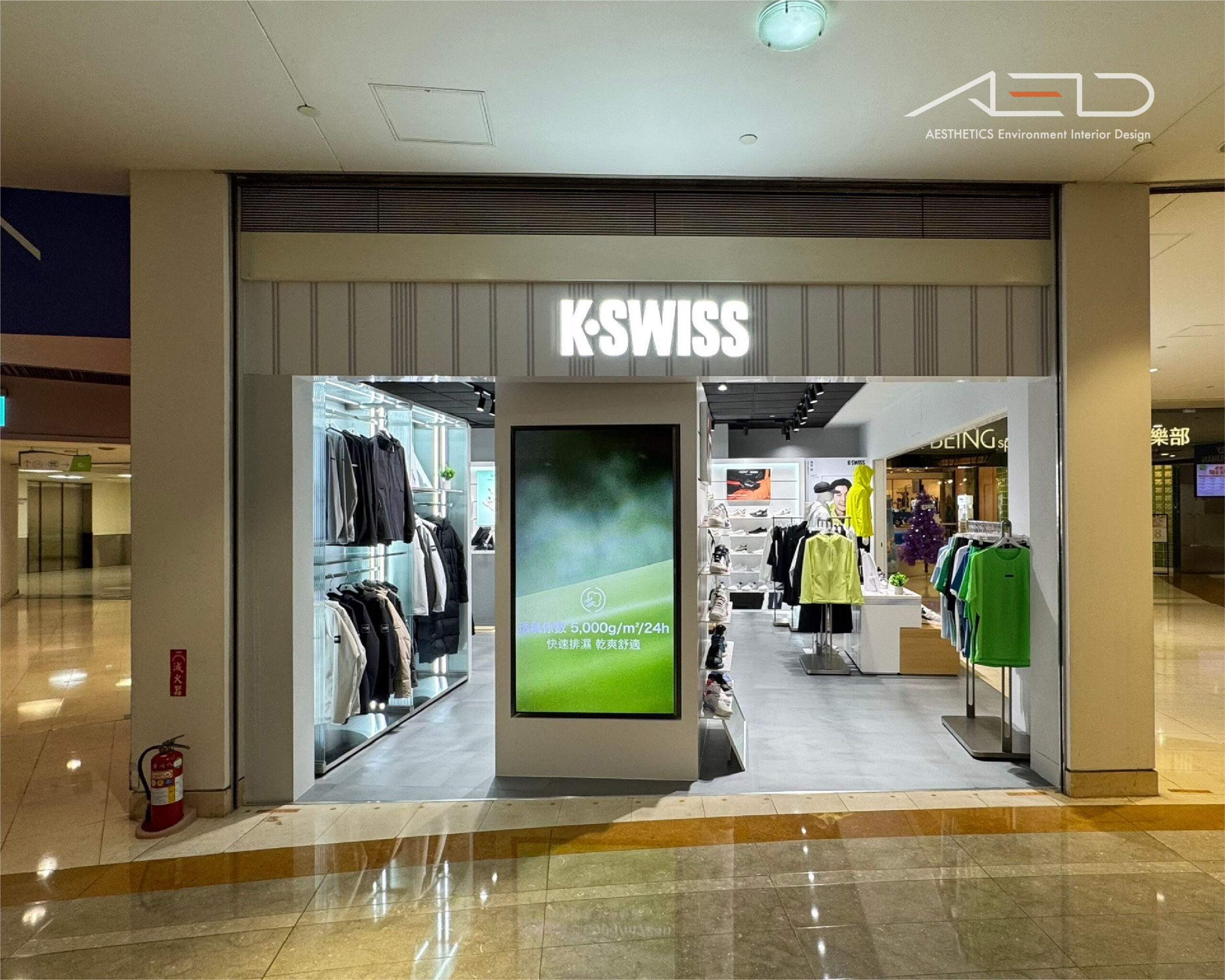 LED 品牌 LOGO 與數位影像屏幕建立清晰的品牌識別界面,使 K-SWISS 在百貨公共動線中形成鮮明且具辨識度的運動品牌入口。