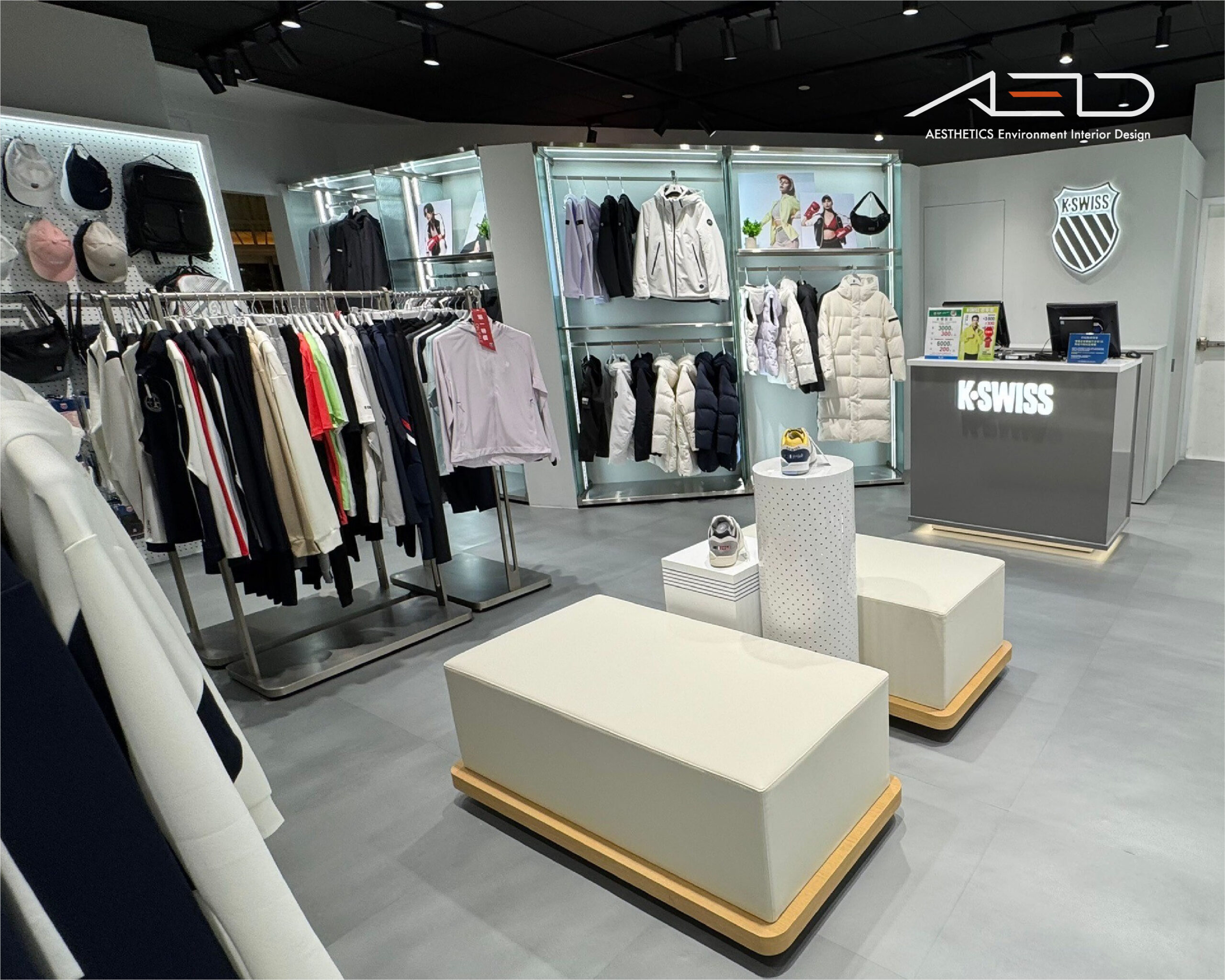 收銀櫃檯整合品牌盾牌 LOGO 與發光字標,作為空間視覺焦點;透過簡潔材質、模組化陳列道具與整合照明設計,營造俐落且具有國際感的運動品牌零售空間。