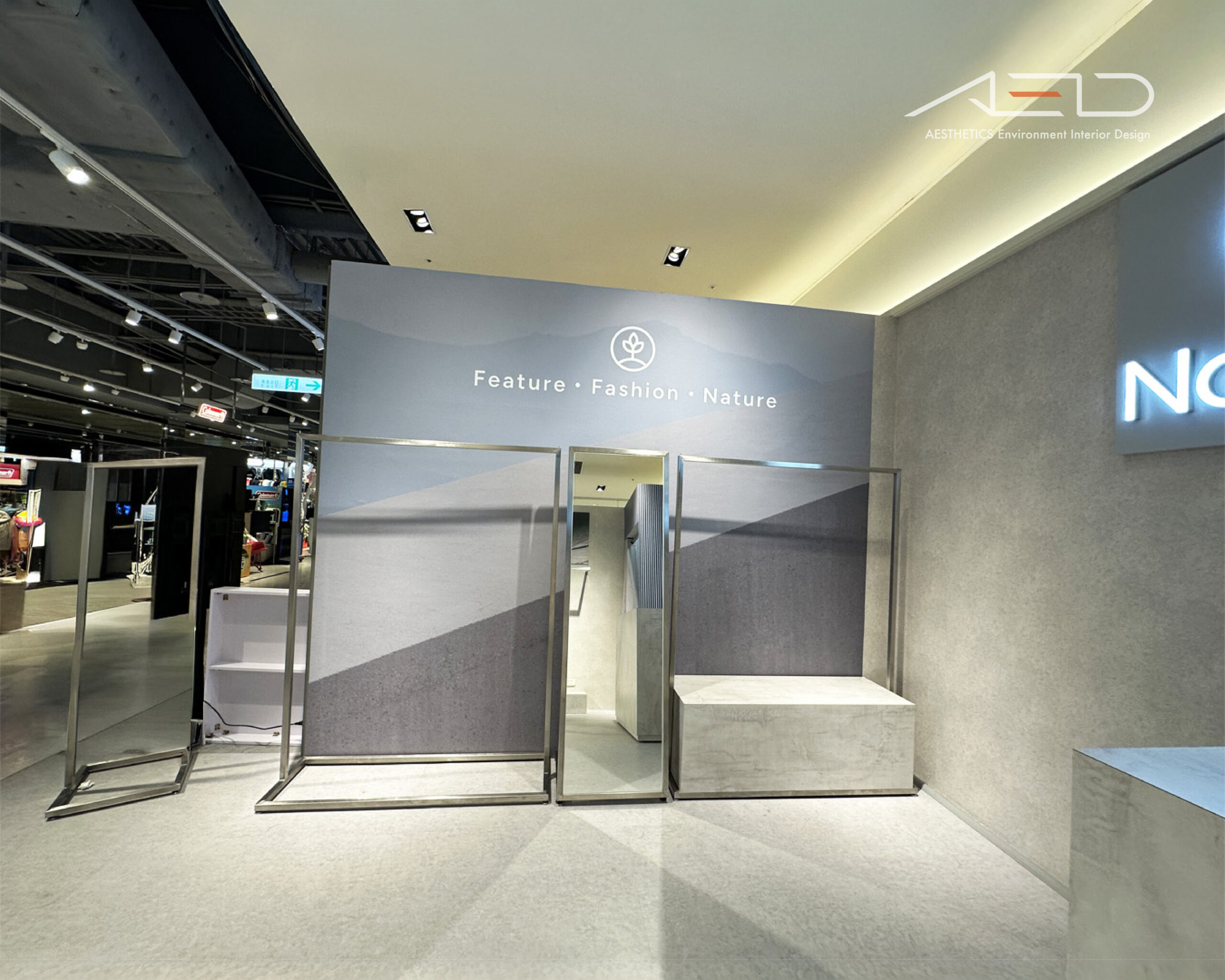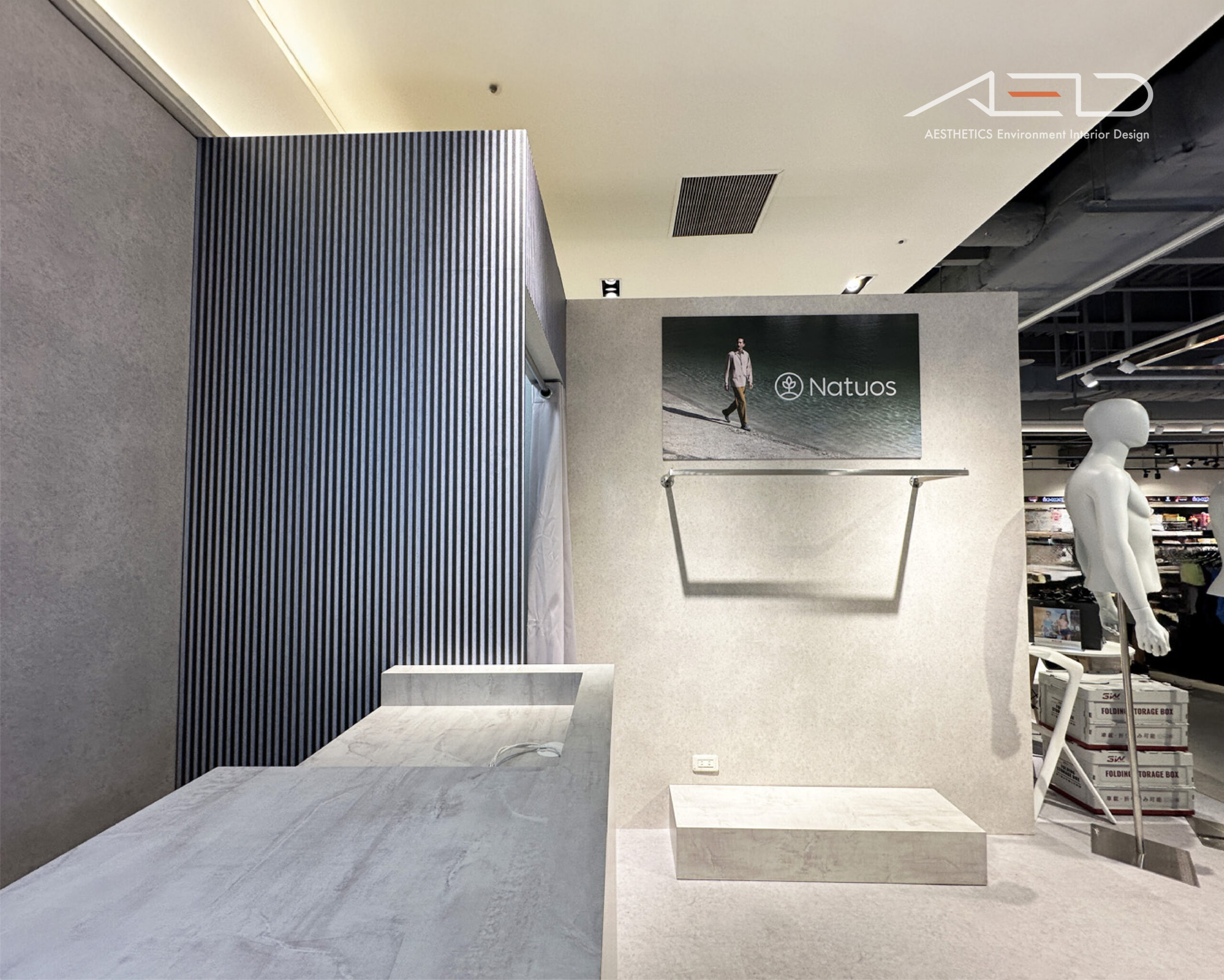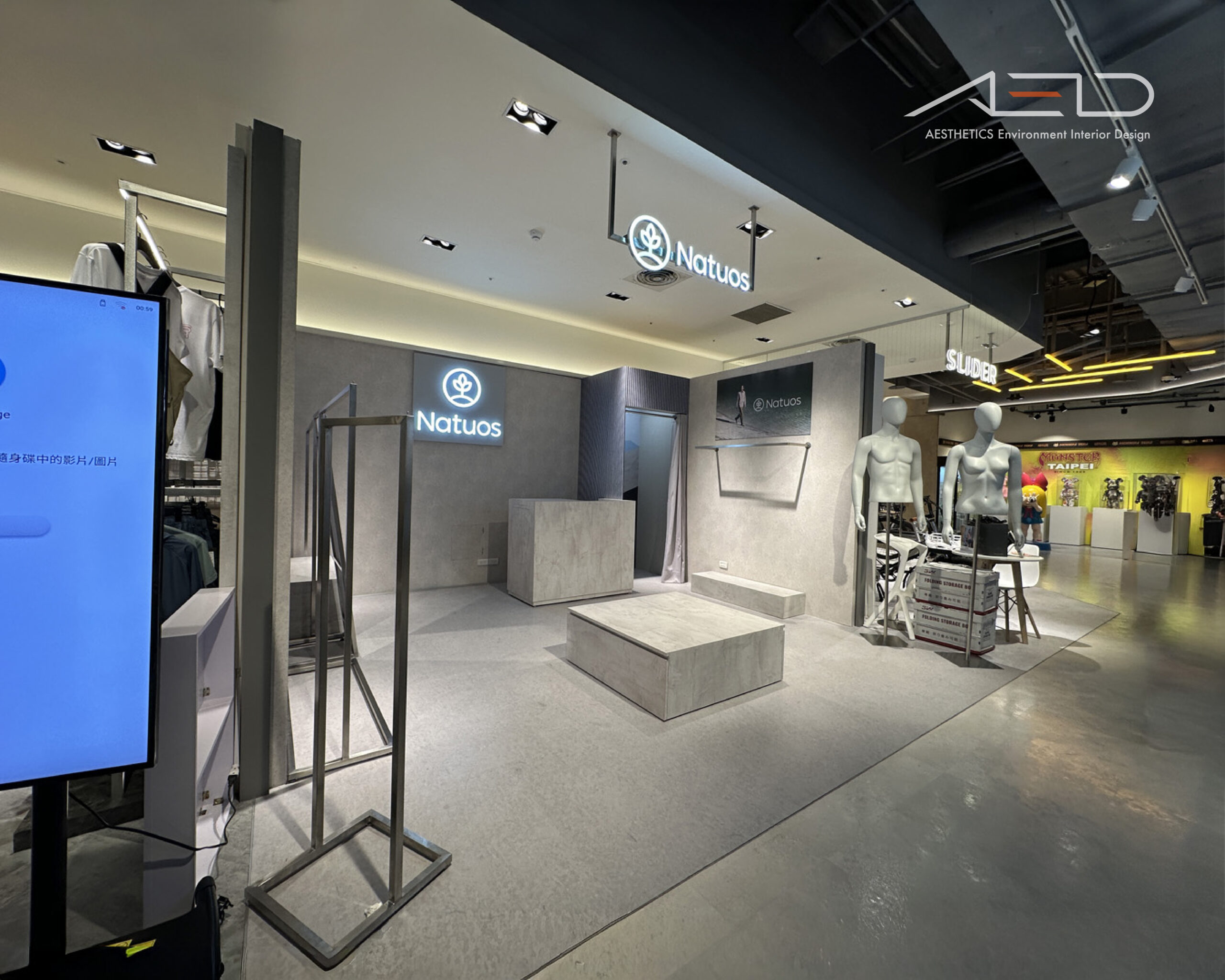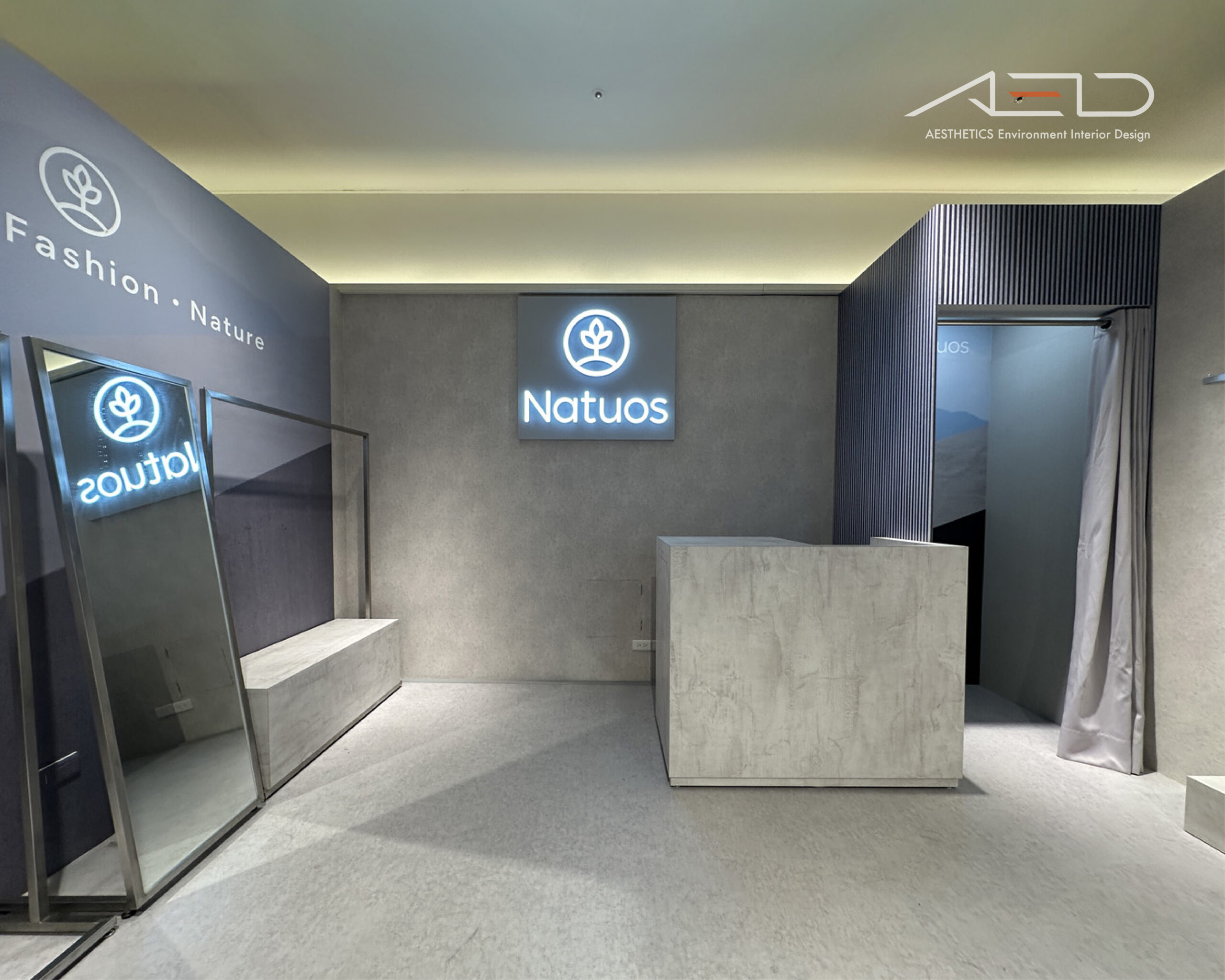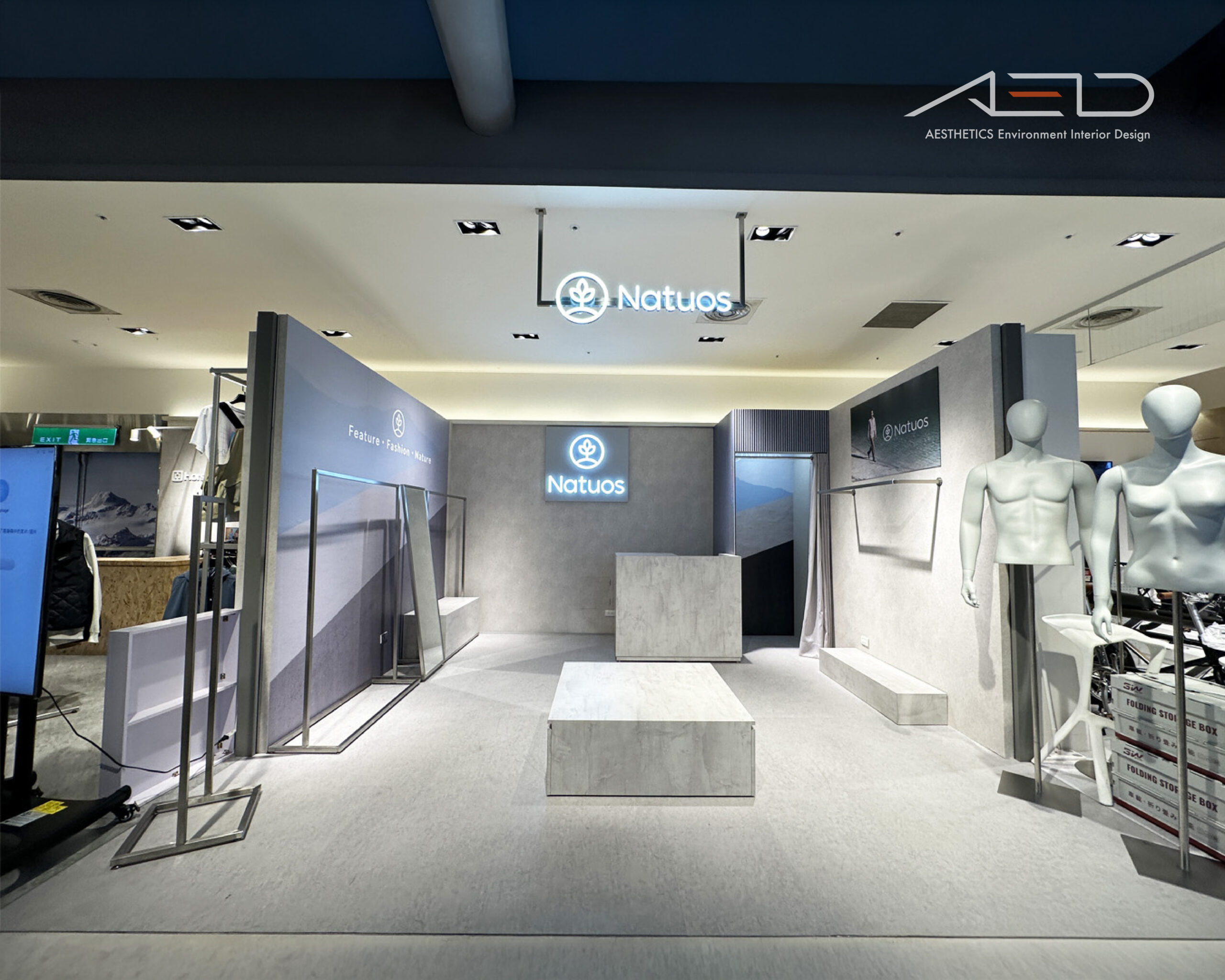 店櫃以開放式界面融入百貨公共動線,懸掛式 LED 品牌識別與簡潔立面構成純粹而清晰的品牌入口,使 NATUOS 在商場場域中保持高度辨識度。
