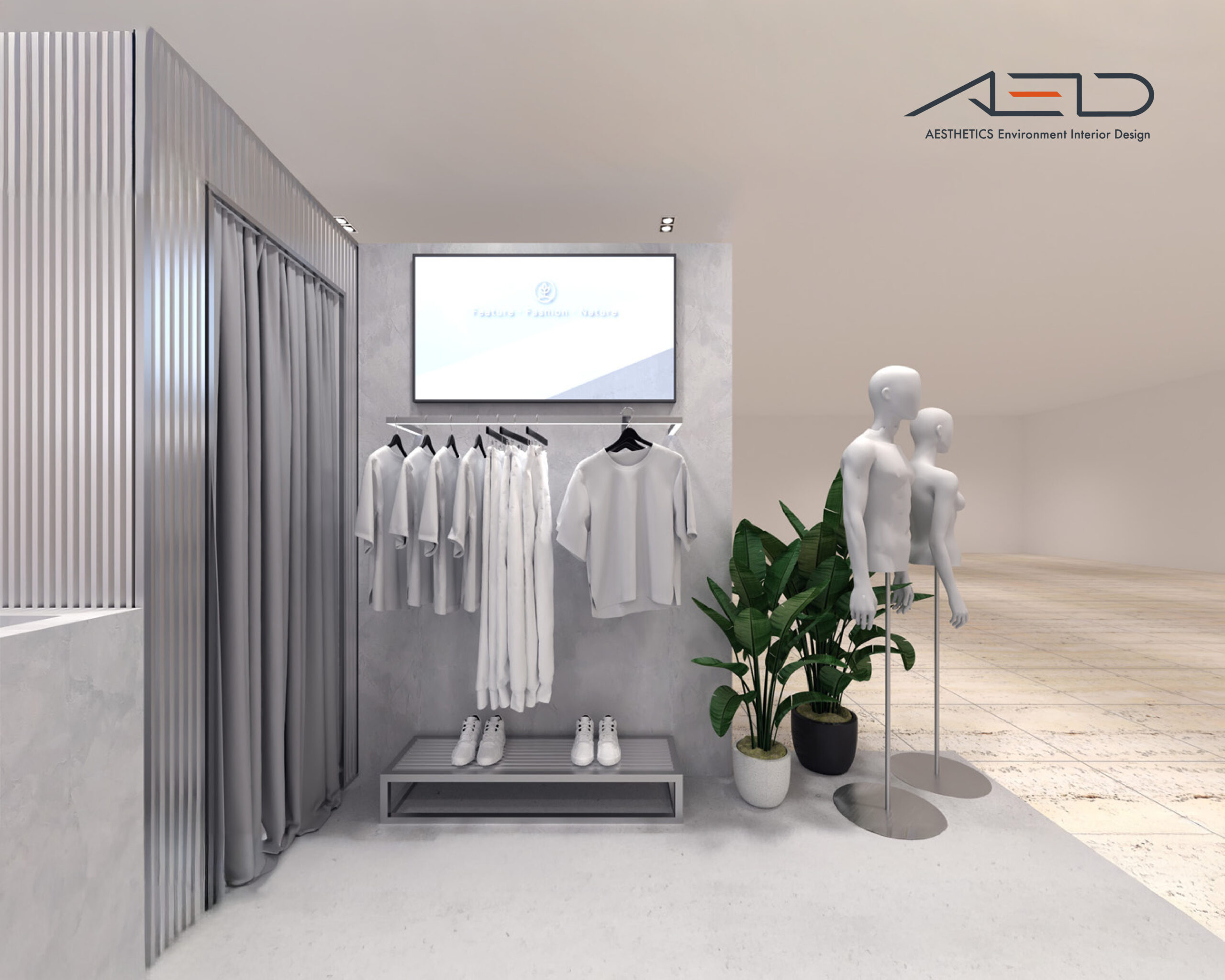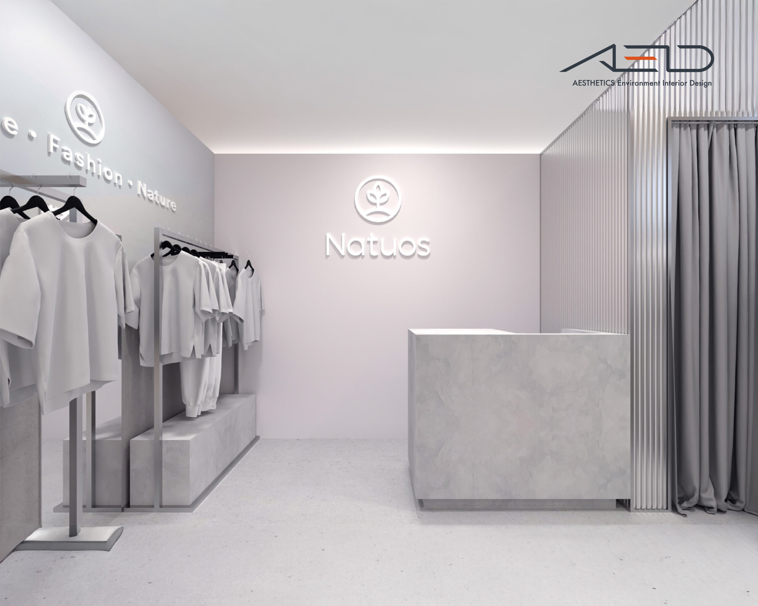 壁面整合品牌形象視覺與服飾展示架構,試衣區以布簾與立面格柵界定空間層次,收銀櫃檯與展示平台則以礦物質感材質呈現簡潔質感;整體透過金屬展示架構與整合照明系統,營造明亮而純粹的零售空間氛圍。