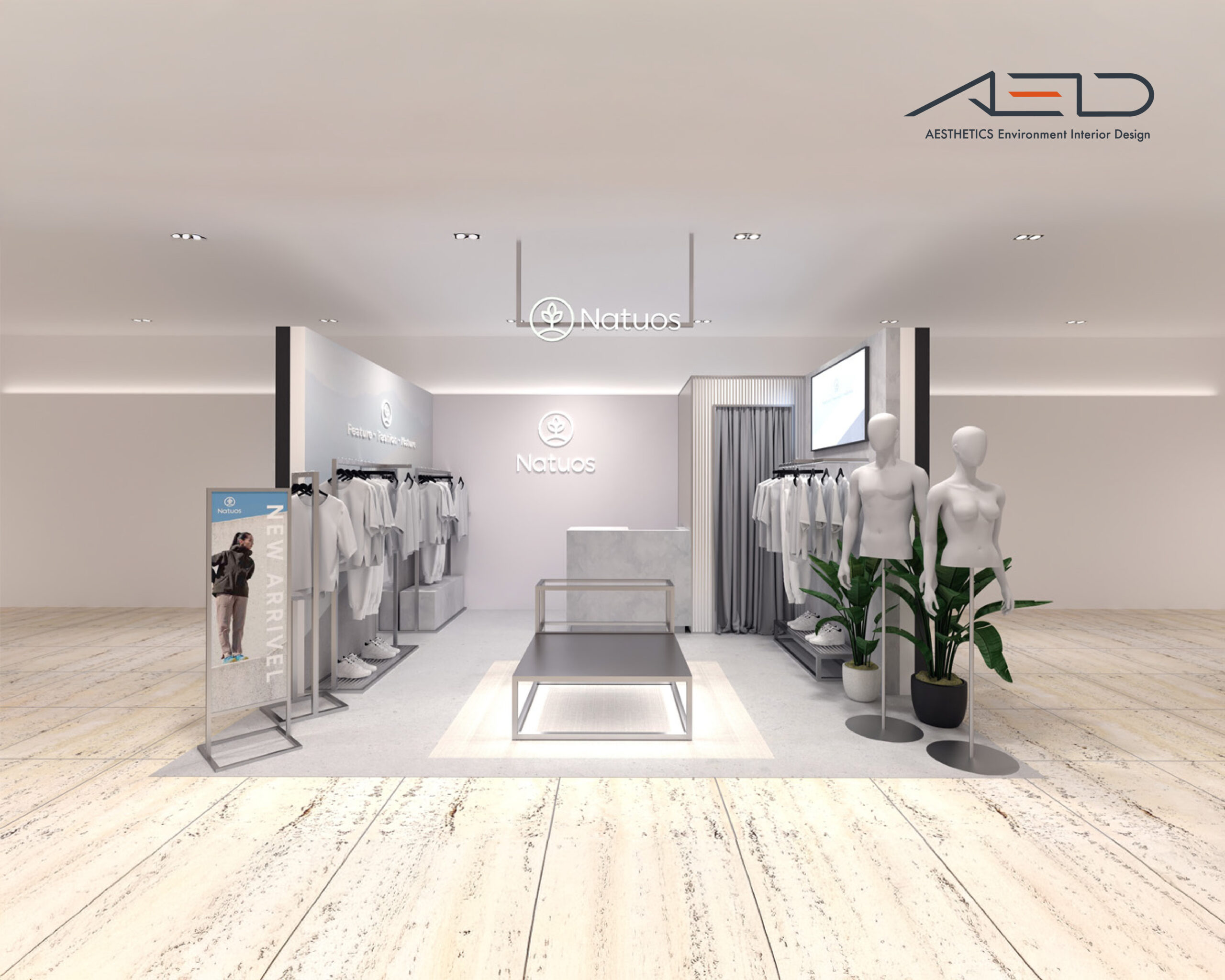 The store adopts an open retail interface integrated with the department store circulation. A suspended LED brand sign and a minimal façade define a clean and refined entrance, allowing NATUOS to maintain strong visibility within the mall environment.