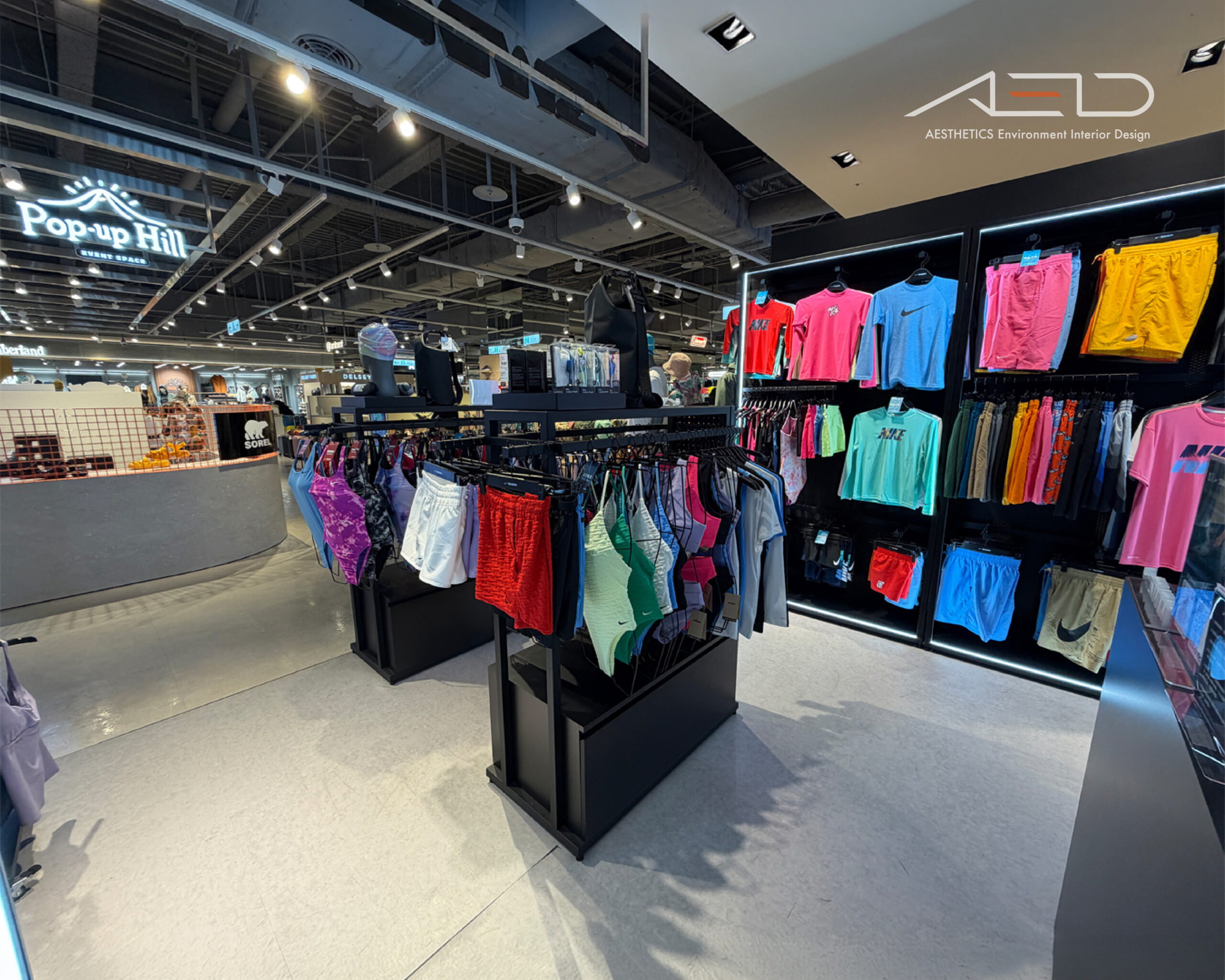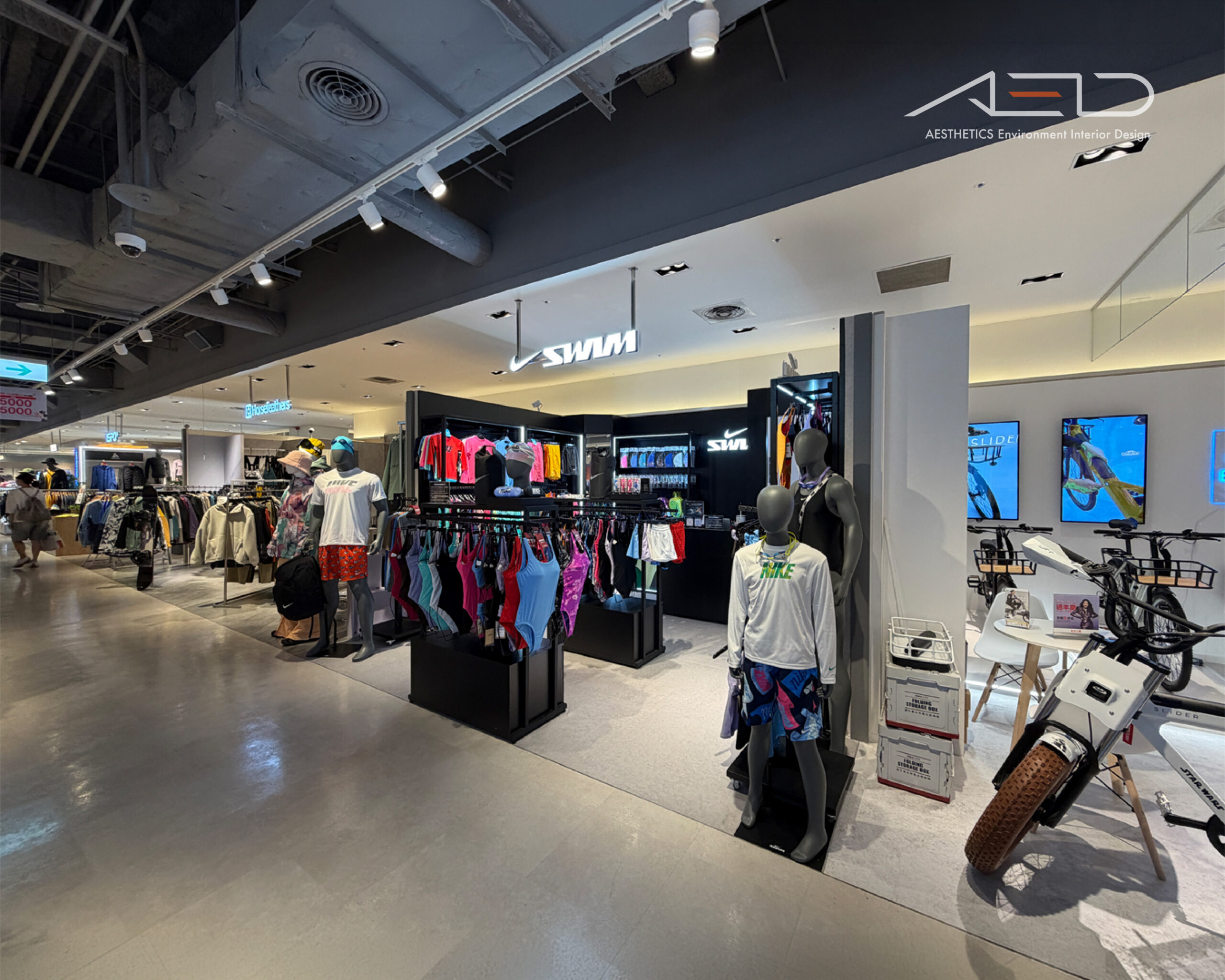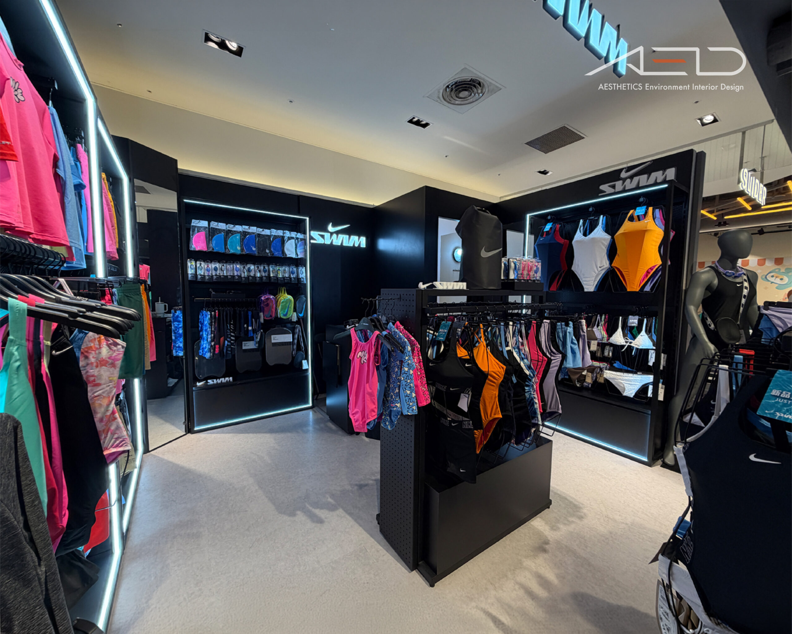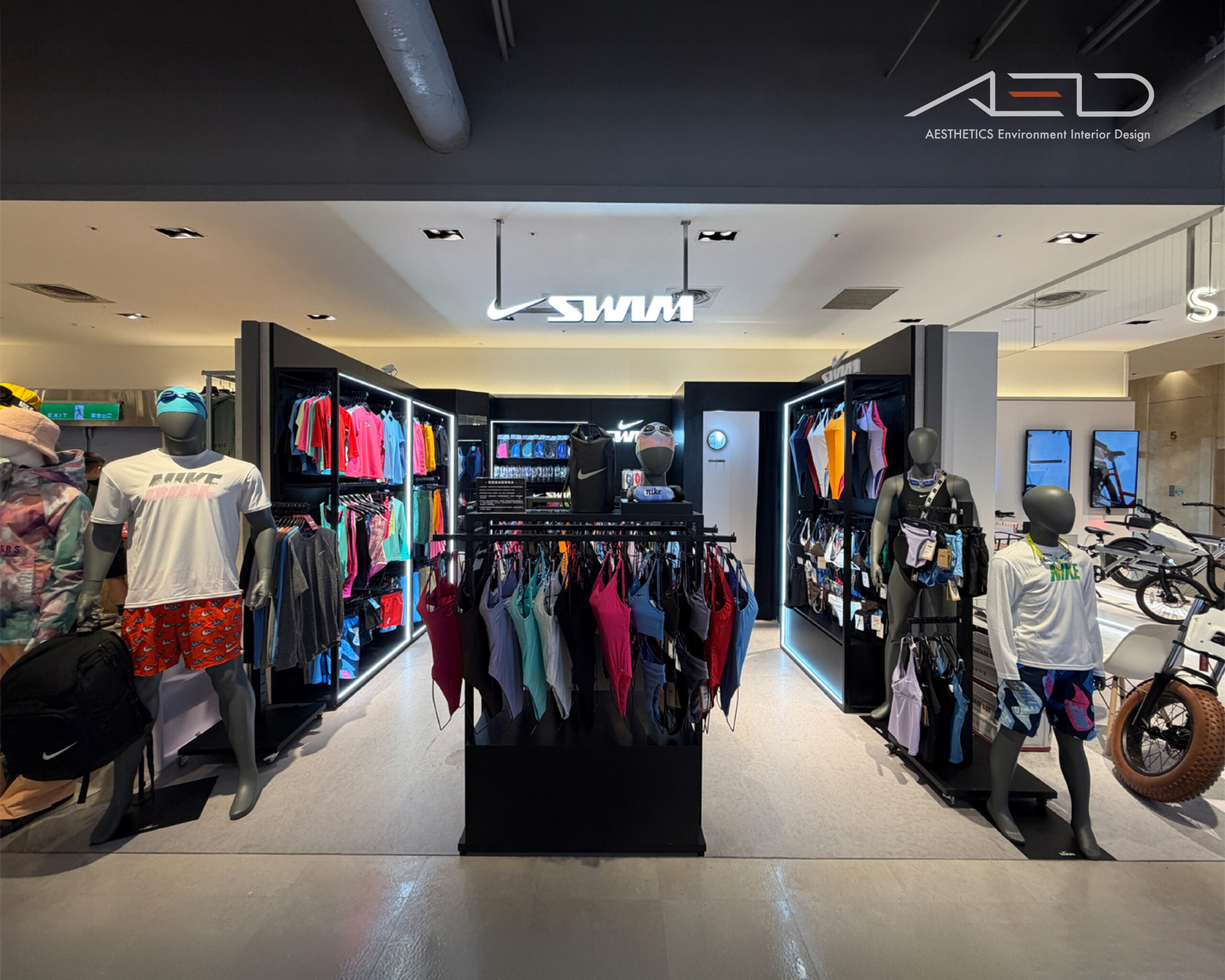 以懸掛式 NIKE SWIM 發光 LOGO 與黑色品牌展示牆建立鮮明的品牌識別,使店鋪在百貨公共動線中形成清晰且具辨識度的運動機能零售界面。