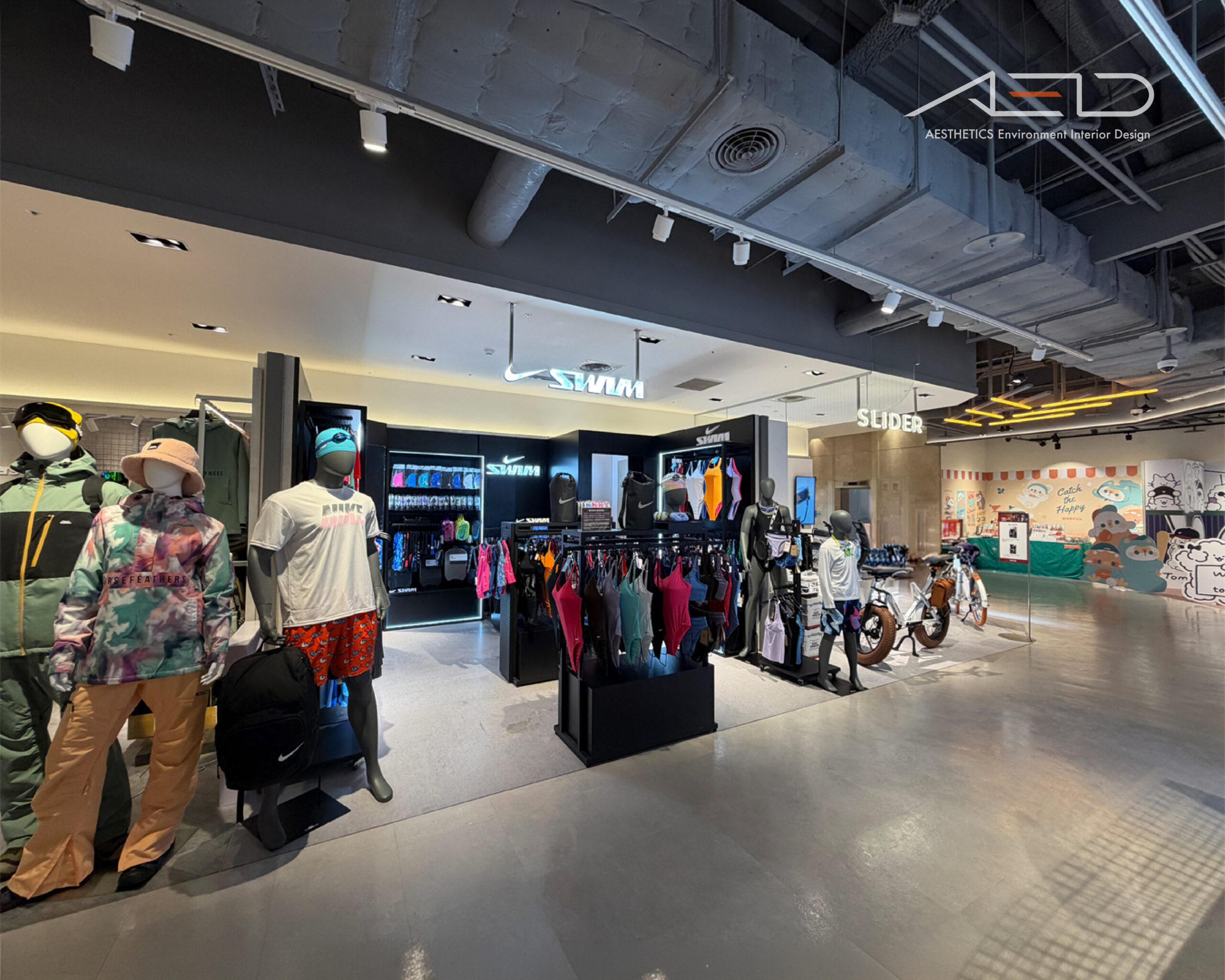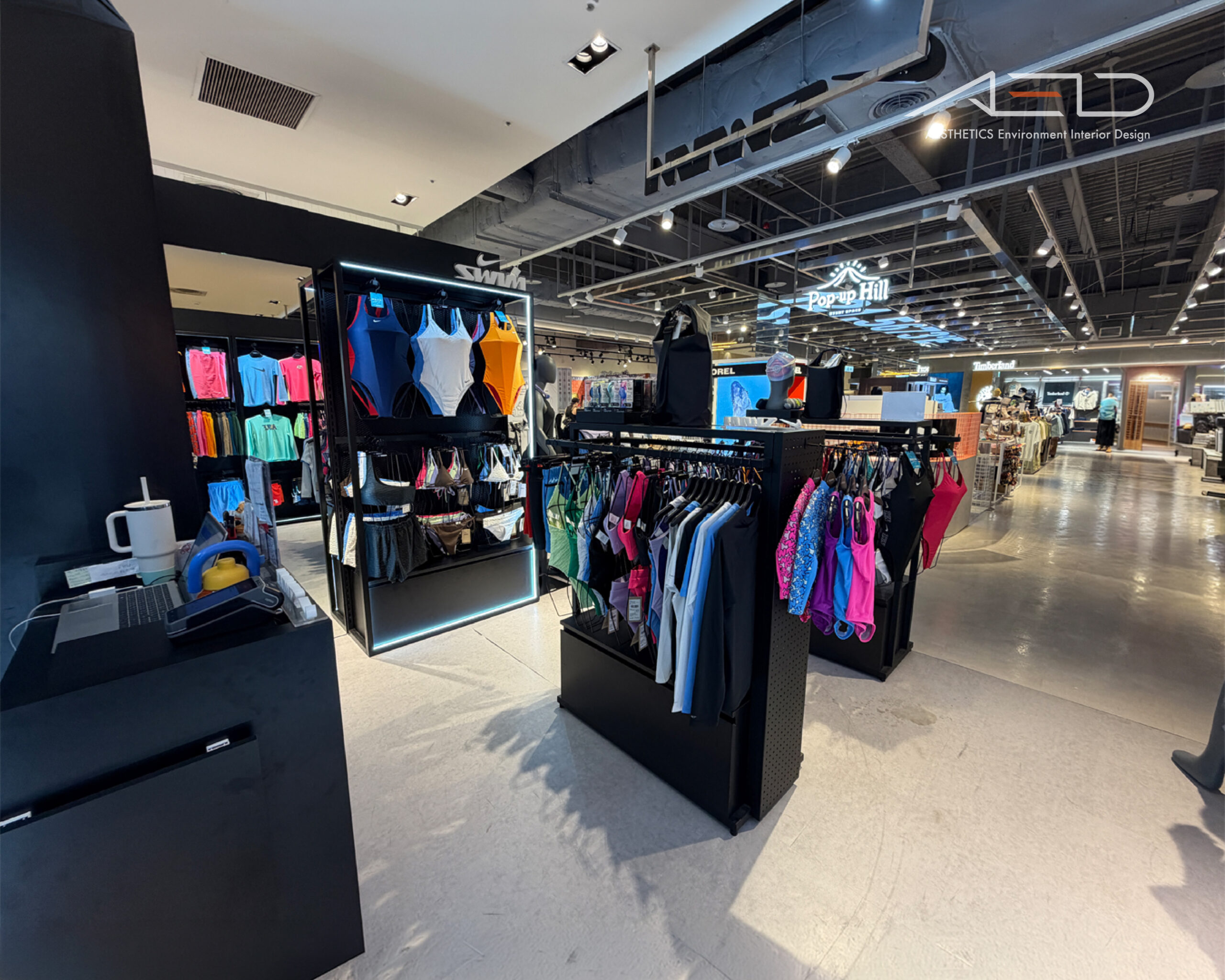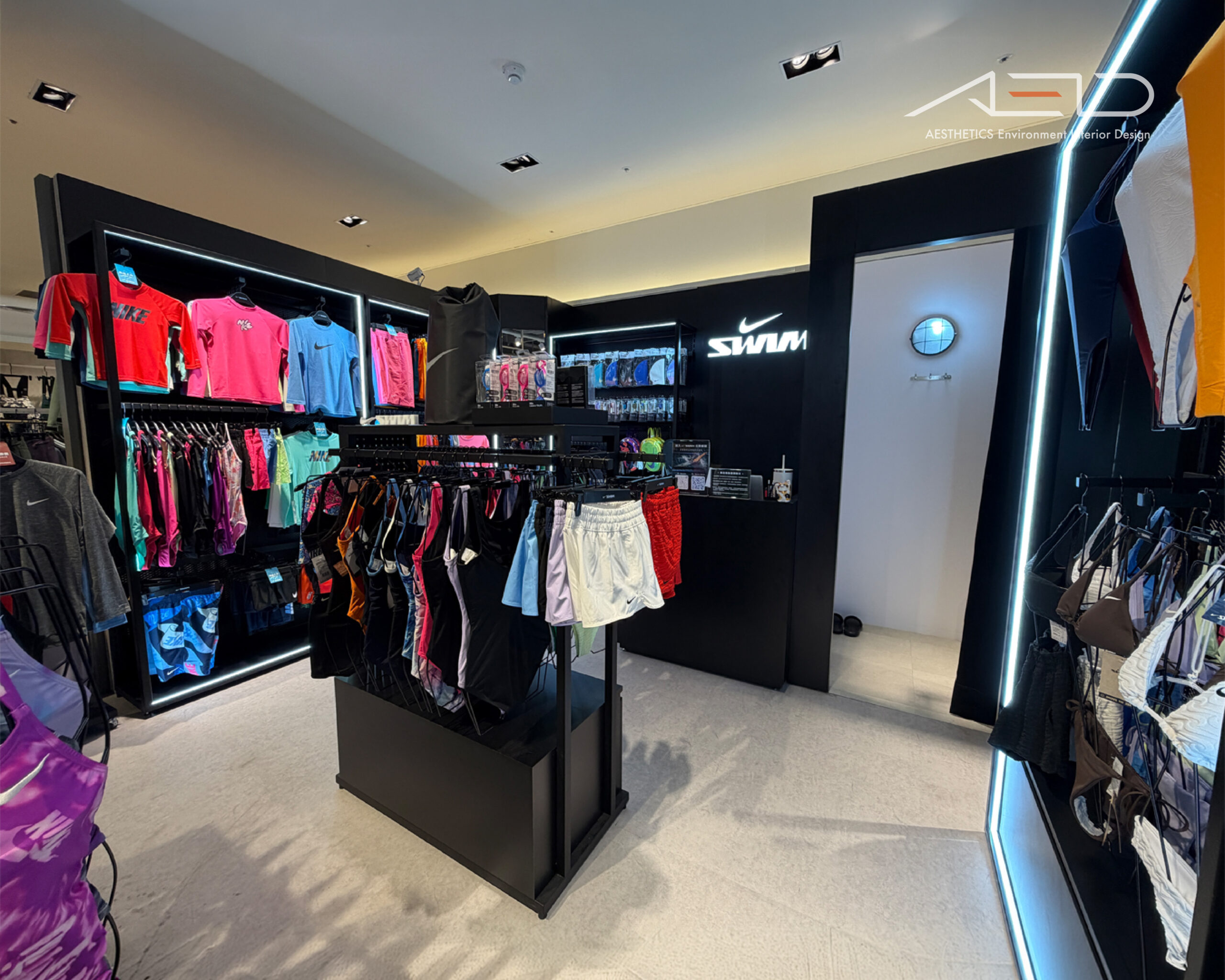 The cashier counter and brand feature wall act as the visual anchor, while black metal fixtures and linear lighting establish a clean and contemporary NIKE SWIM retail environment.