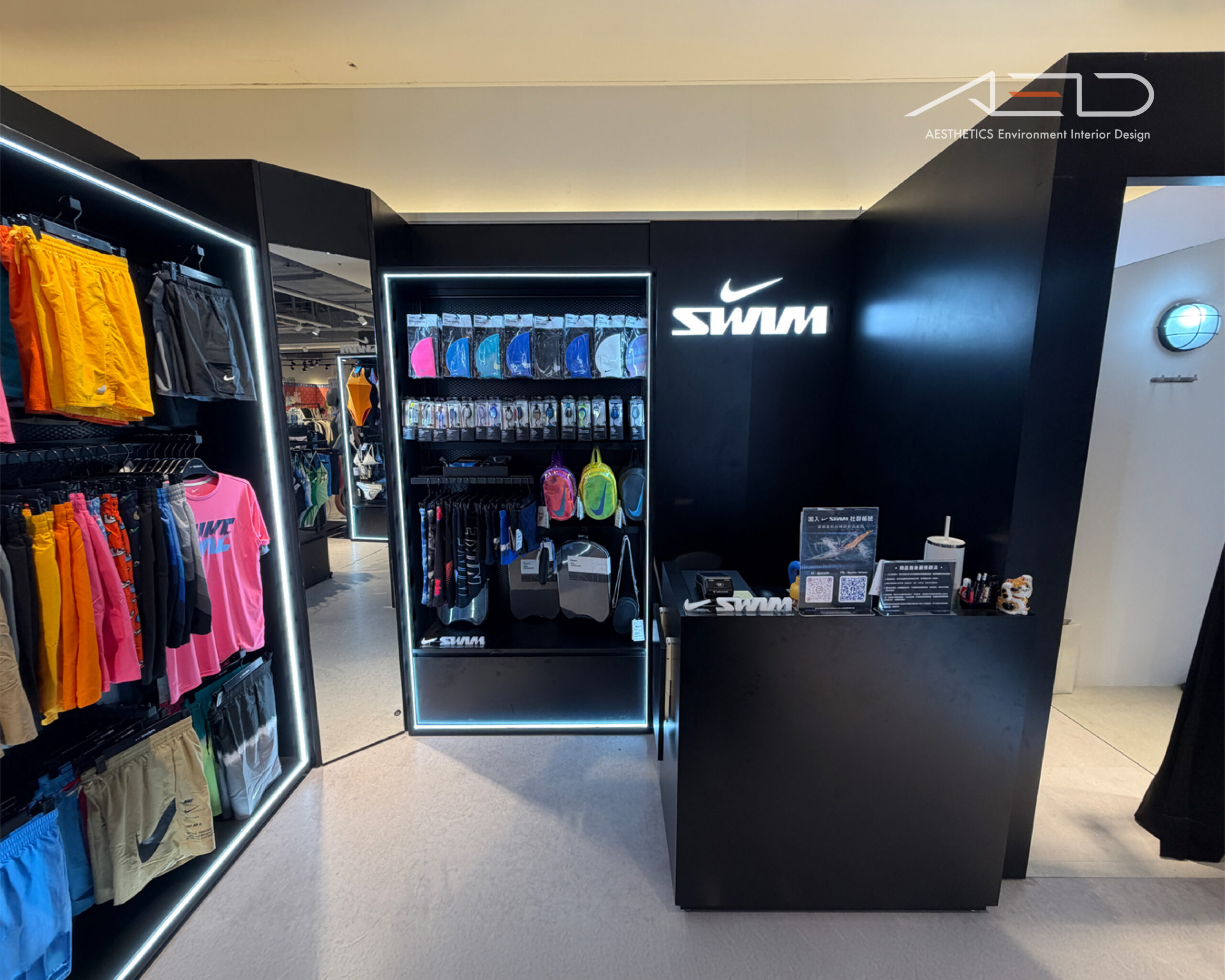 收銀櫃檯結合品牌 LOGO 與黑色形象背牆作為空間視覺焦點;整體透過黑色鐵件展示道具、陳列系統與線性照明設計,營造簡潔俐落且具國際感的 NIKE SWIM 零售空間。