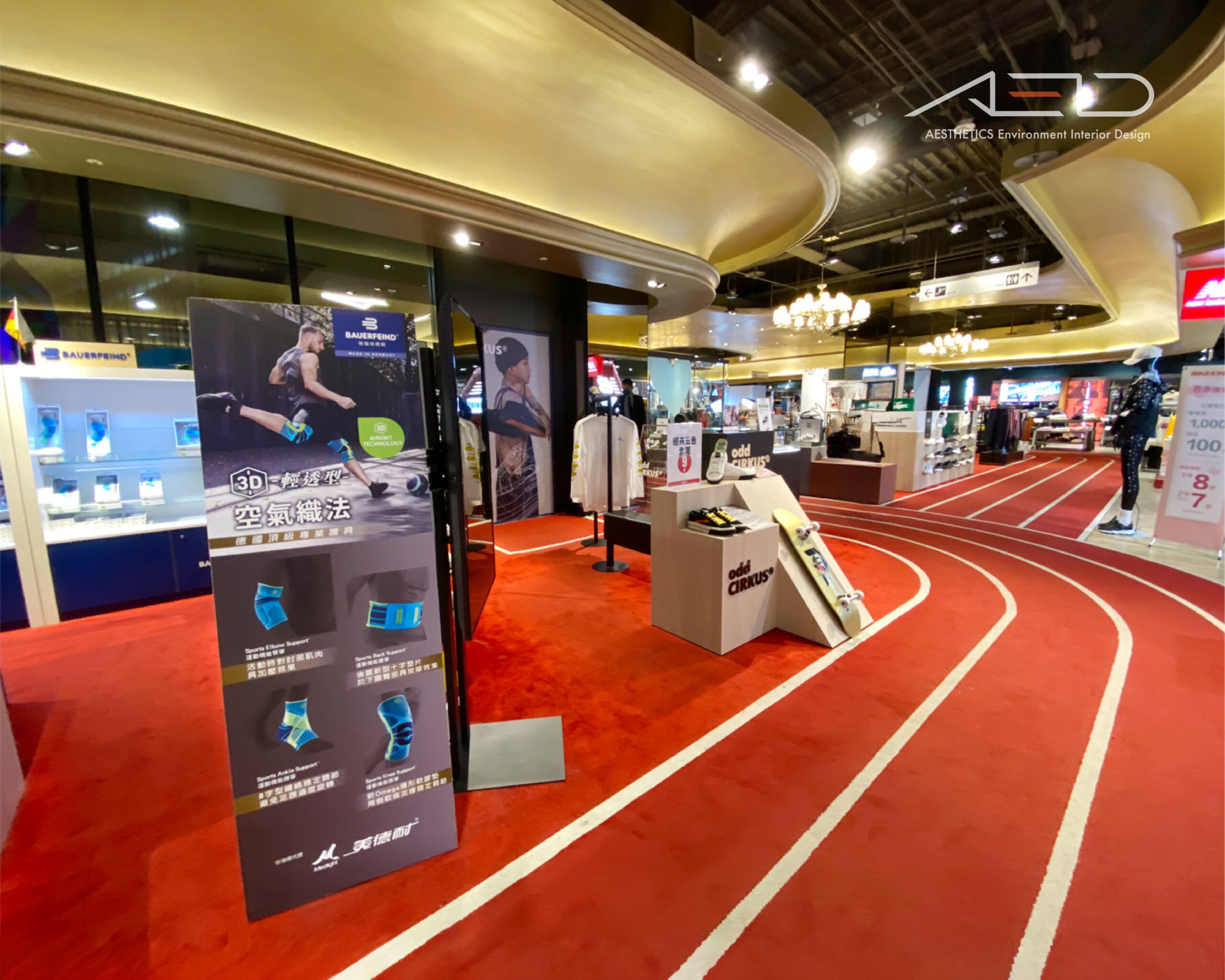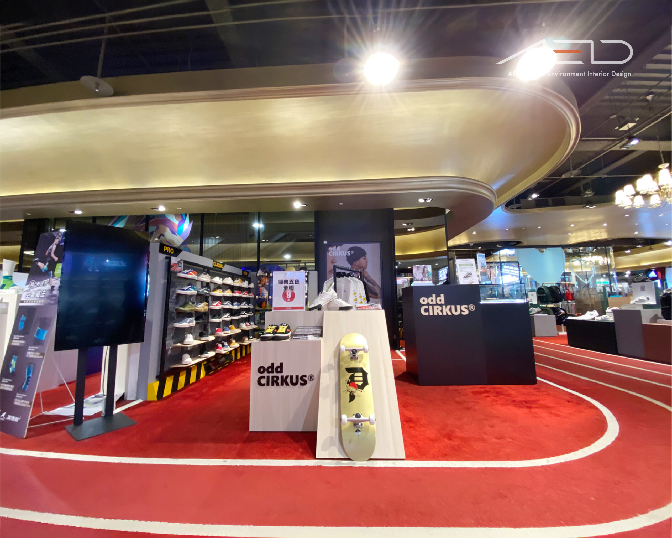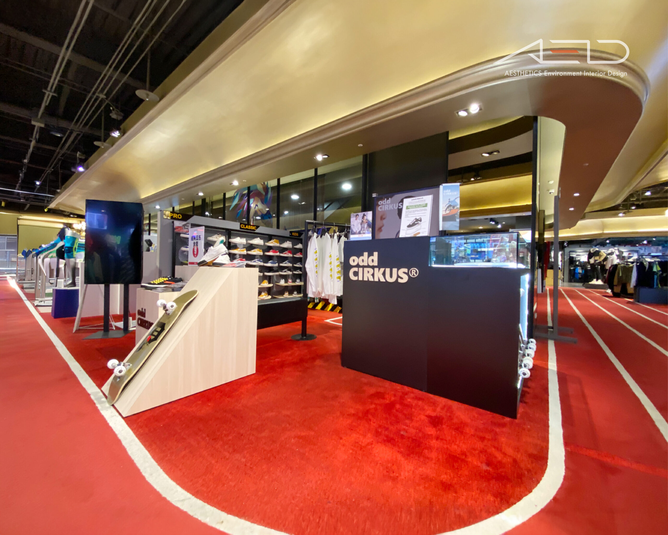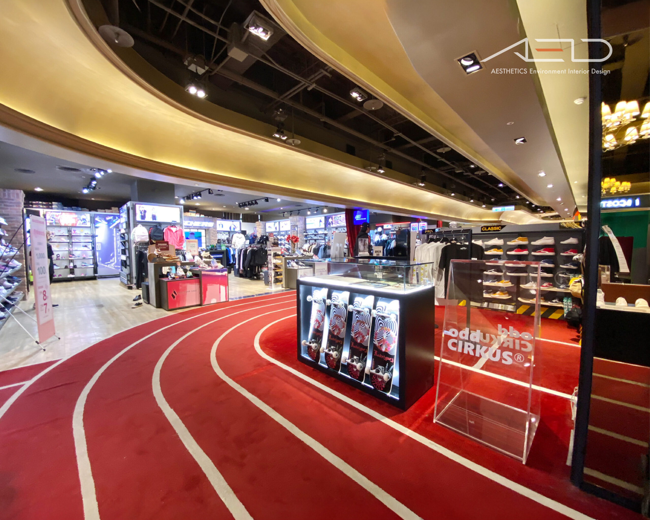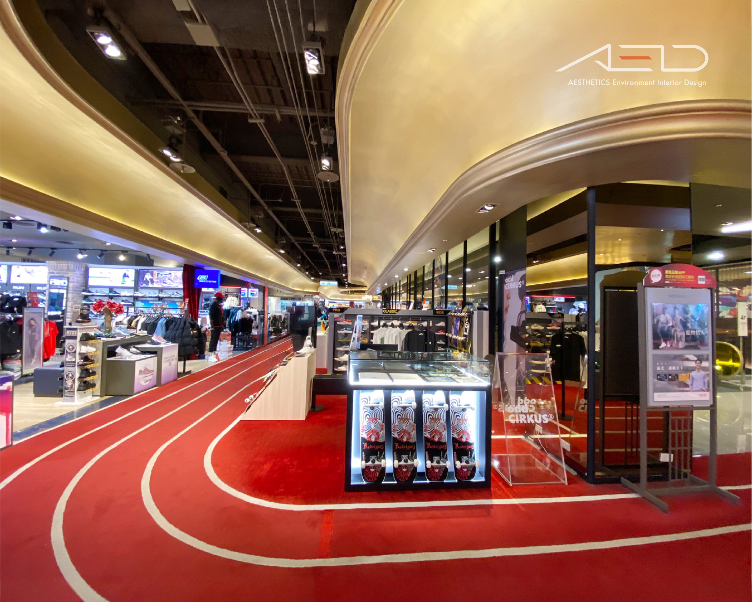 以象徵街頭運動的跑道意象貫穿整體場域,紅色地坪與流動線條構成鮮明的空間動線,引導顧客自然穿梭於品牌展示之間。