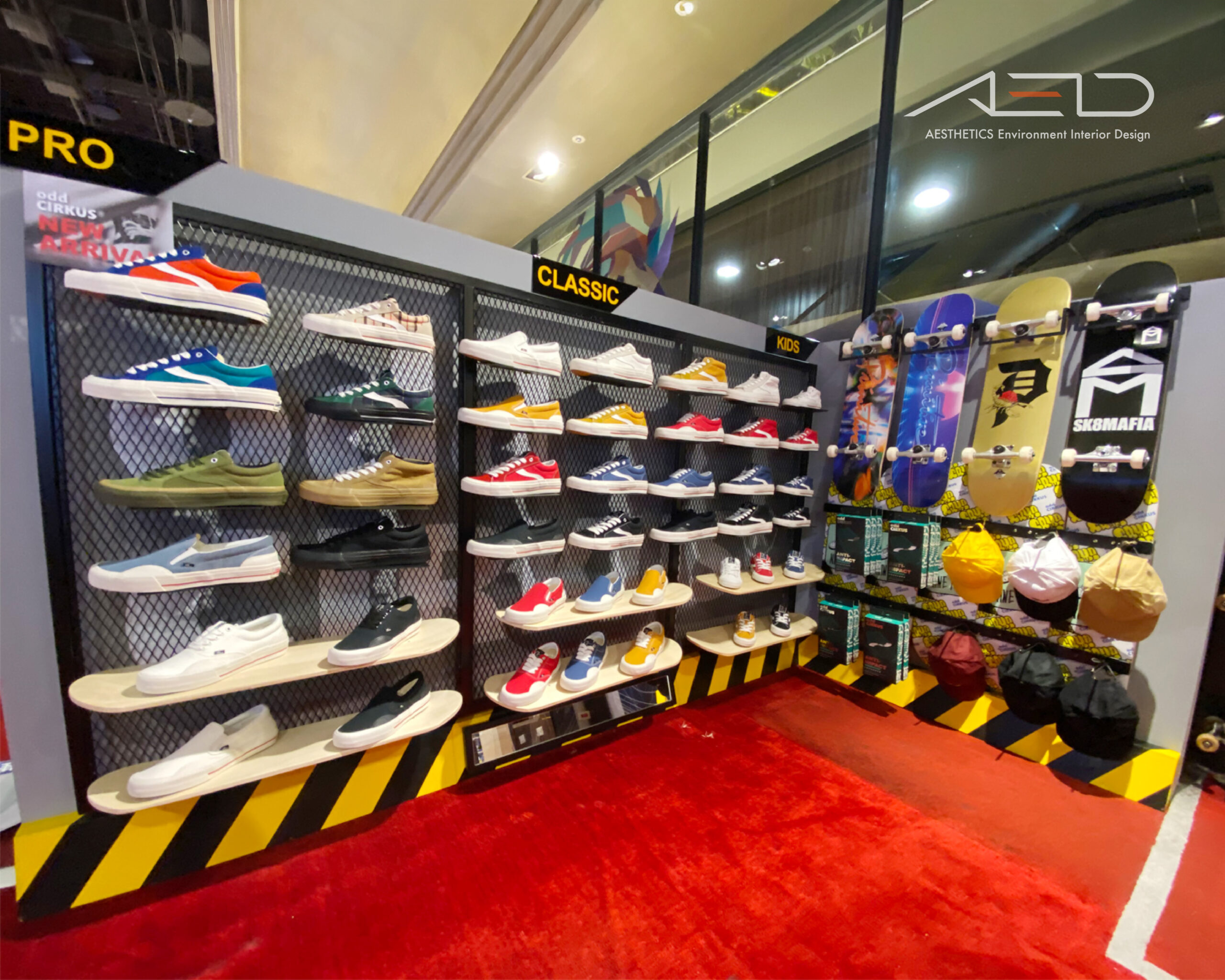 The open retail layout, combined with branded display fixtures, integrates footwear, skateboards, and streetwear within a unified spatial language, shaping a rhythmic retail experience.