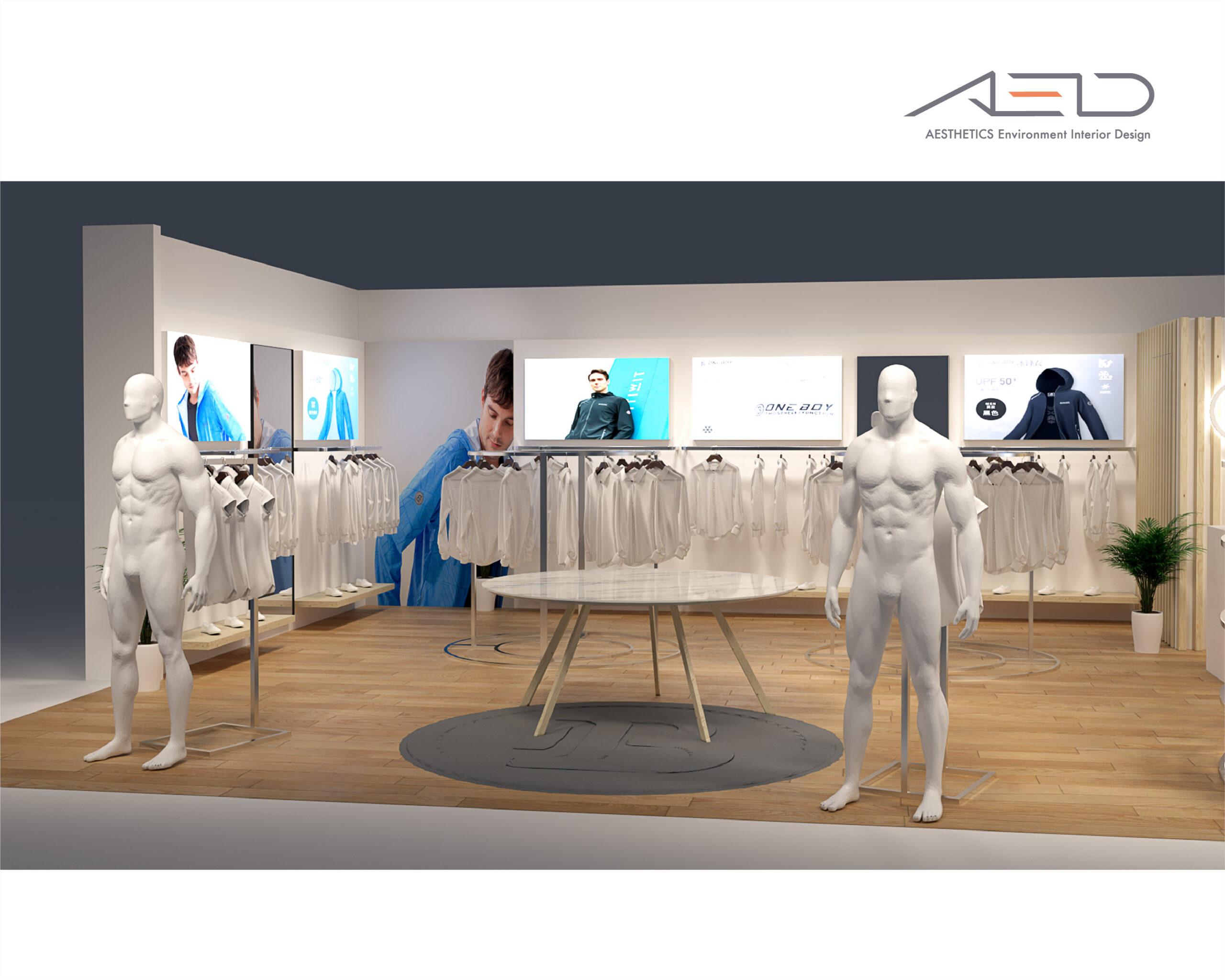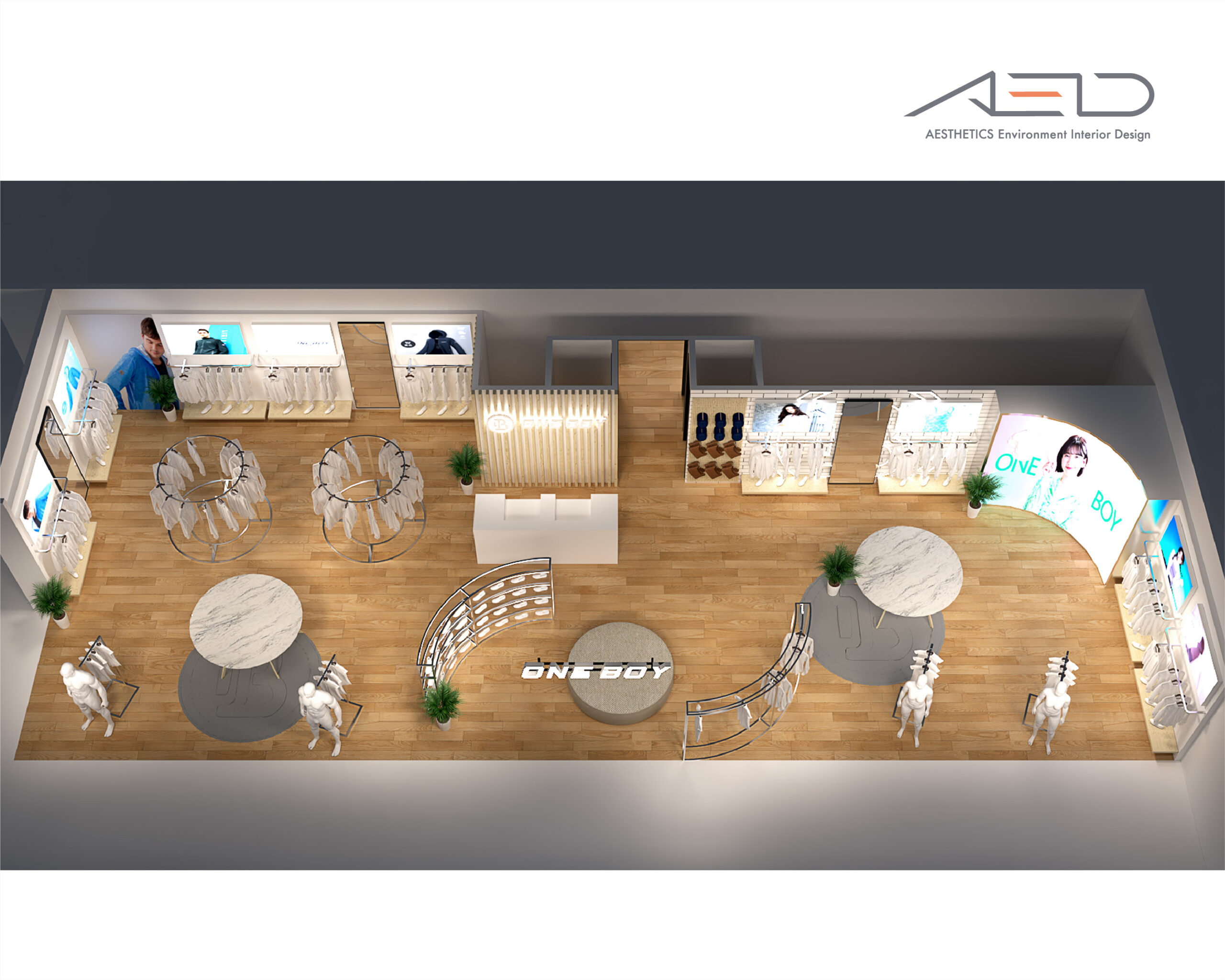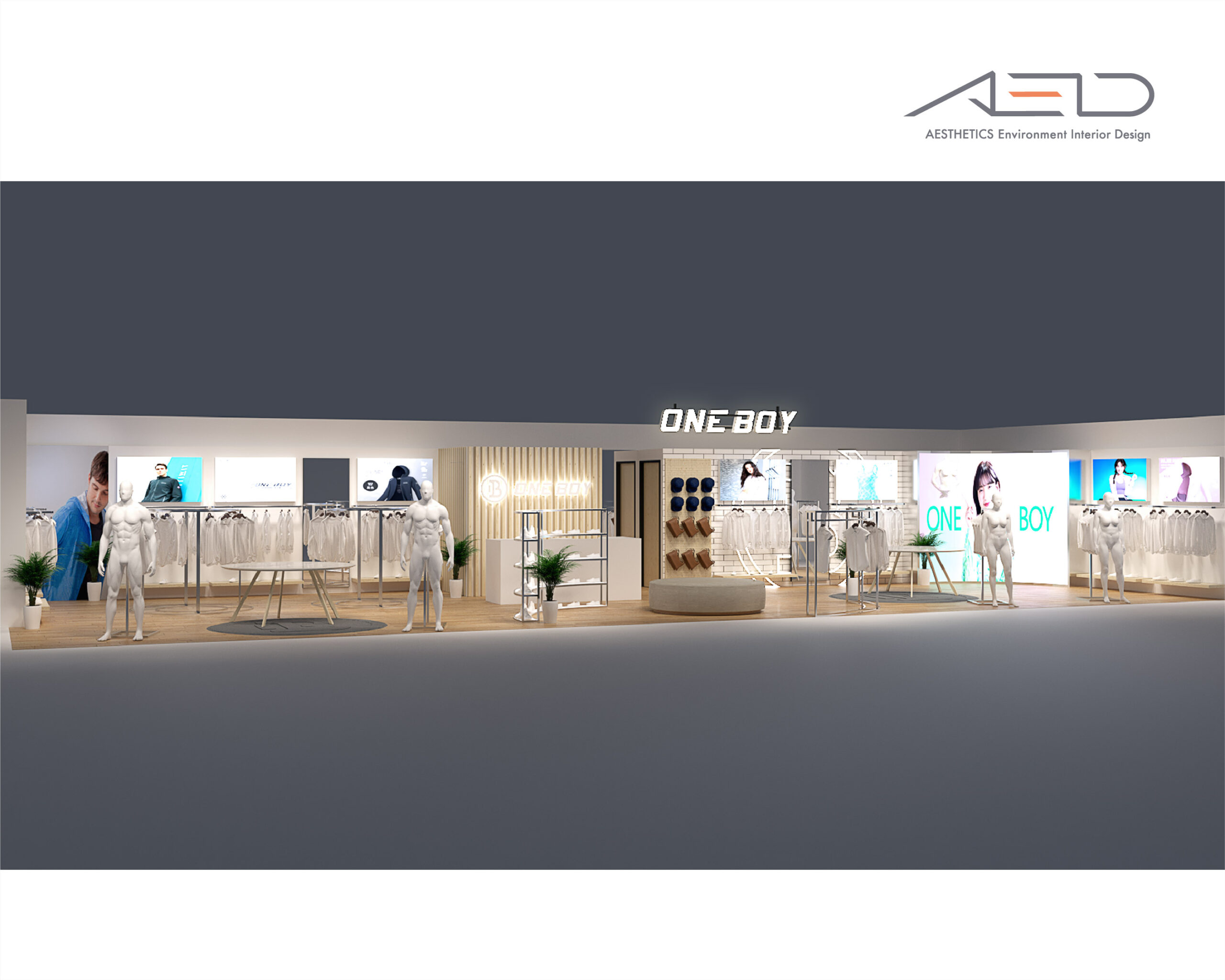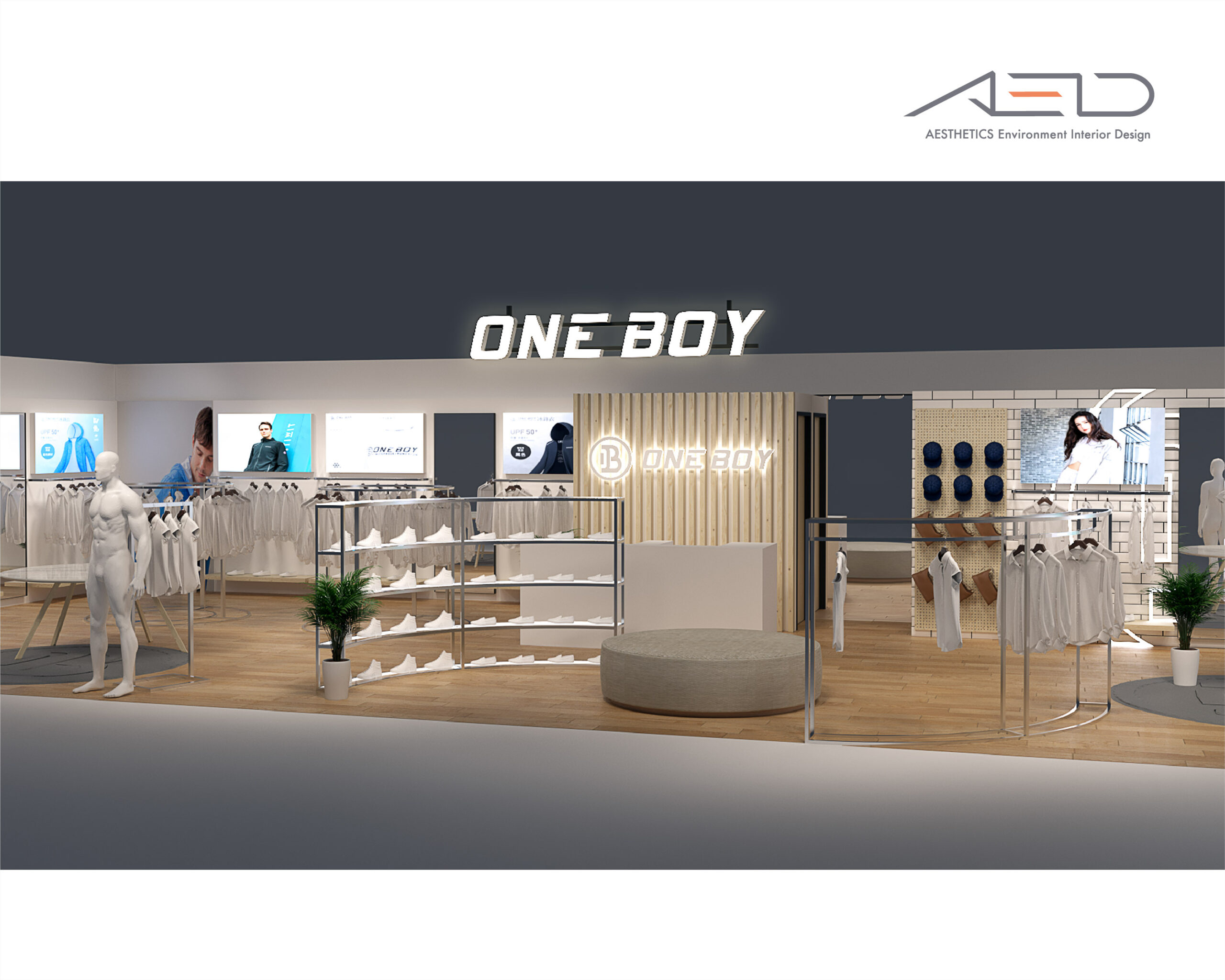 Inside, a central display island and circular merchandising system organize the retail flow, presenting apparel, accessories, and footwear in a clear and rhythmic sequence. Warm timber finishes, refined metal structures, and integrated lighting create a bright and approachable retail environment that reflects ONE BOY’s youthful, functional, and lifestyle-oriented brand identity.