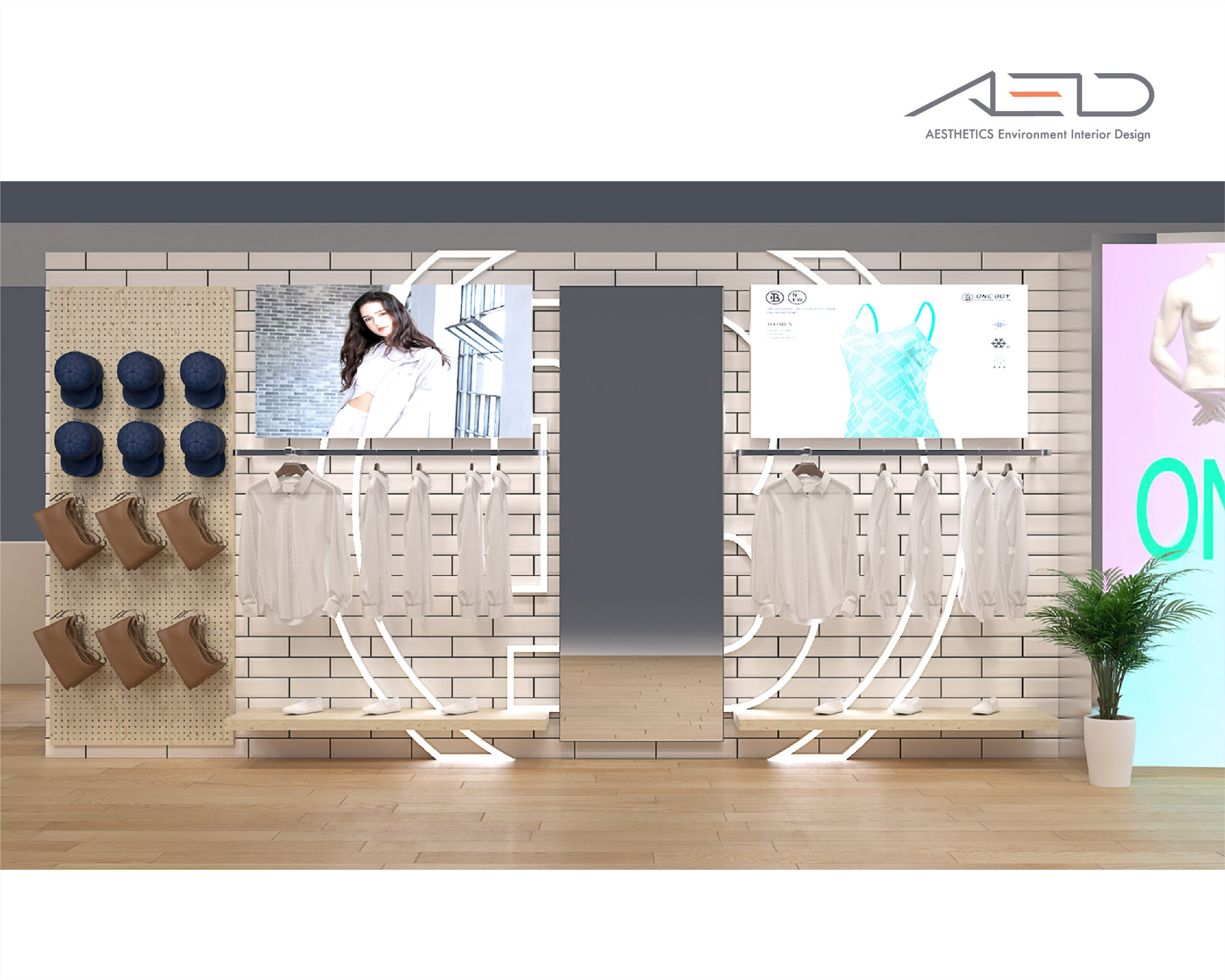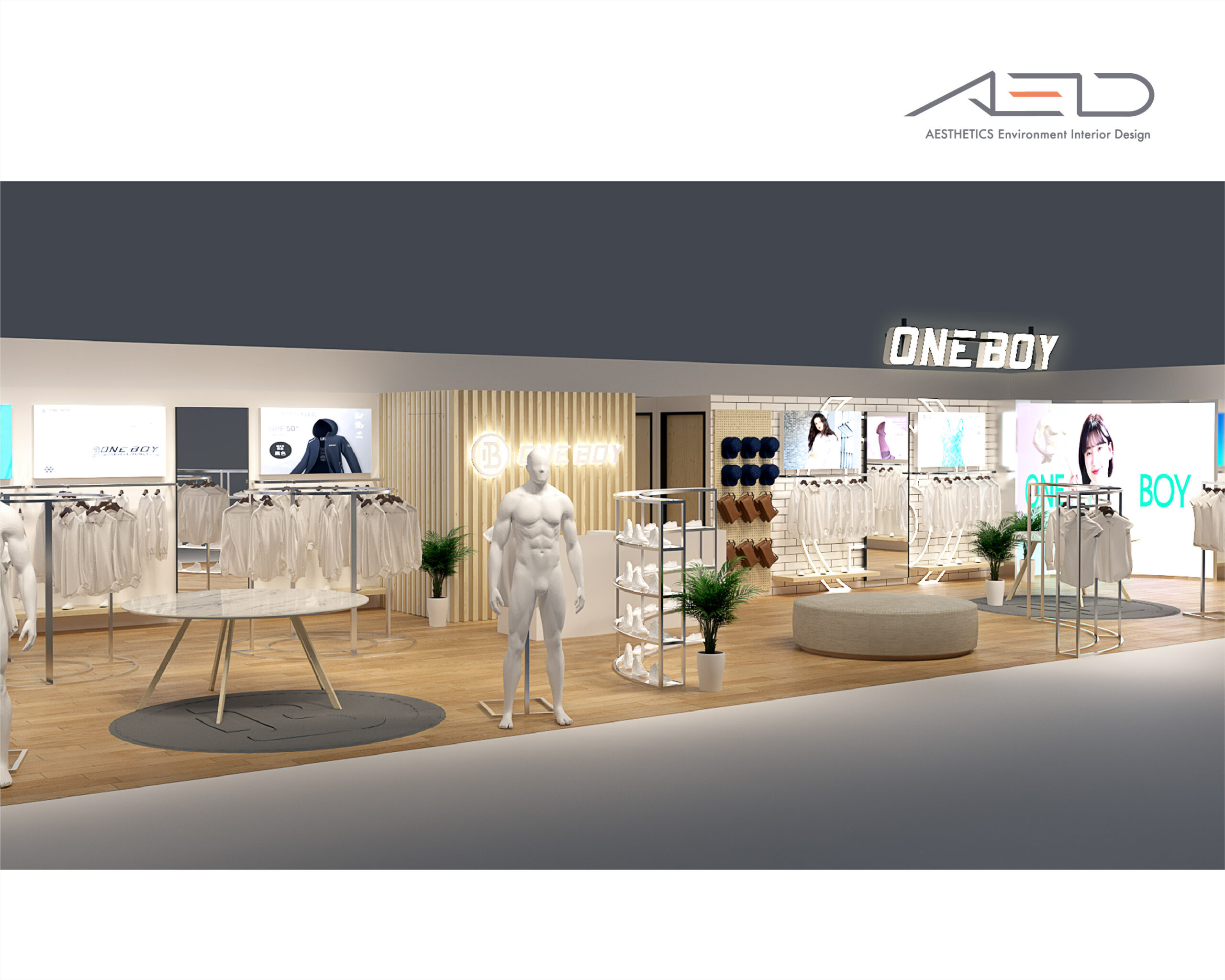 室內透過中央展示中島與環形陳列系統組織商品動線,使服飾、配件與鞋履形成清晰且具有節奏感的展示序列。搭配溫潤木質材質、簡潔金屬結構與整合式燈光設計,營造明亮且具親和力的零售空間,呈現 ONE BOY 年輕、機能與日常生活感的品牌形象。