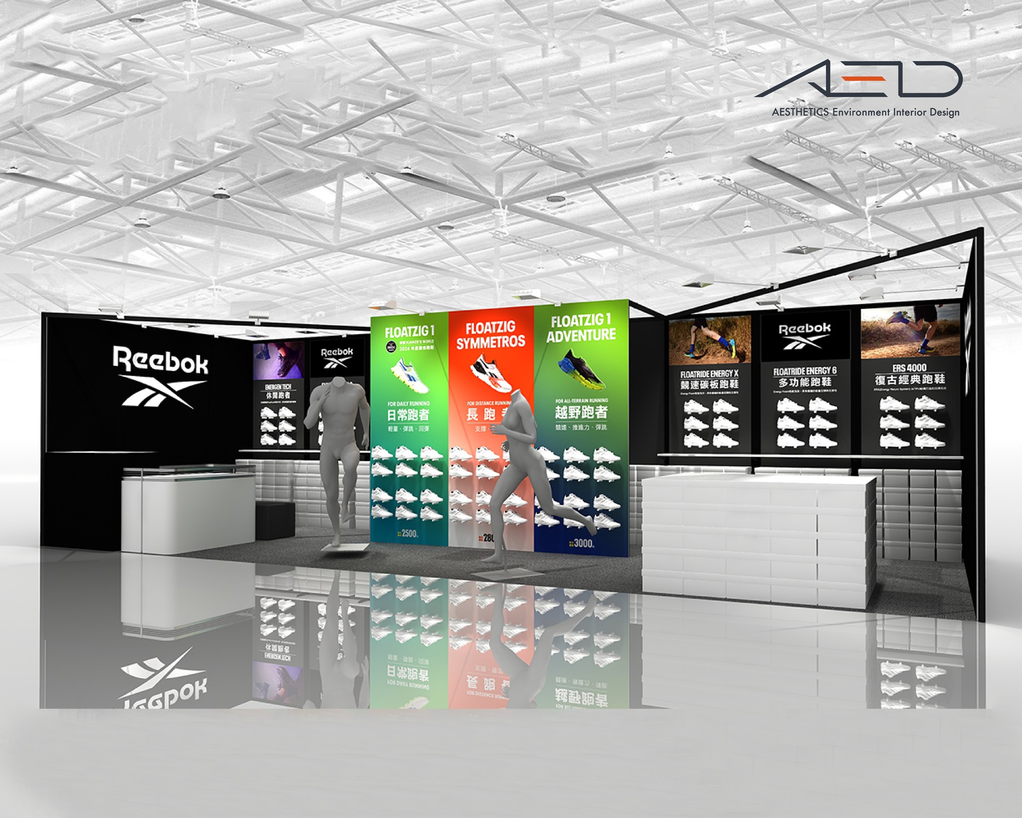以黑色品牌牆體與高對比產品資訊背板為主要視覺,結合跑步姿態模特、垂直產品分類版面與聚焦燈光,使各系列跑鞋形成清晰且具有節奏感的展示序列。