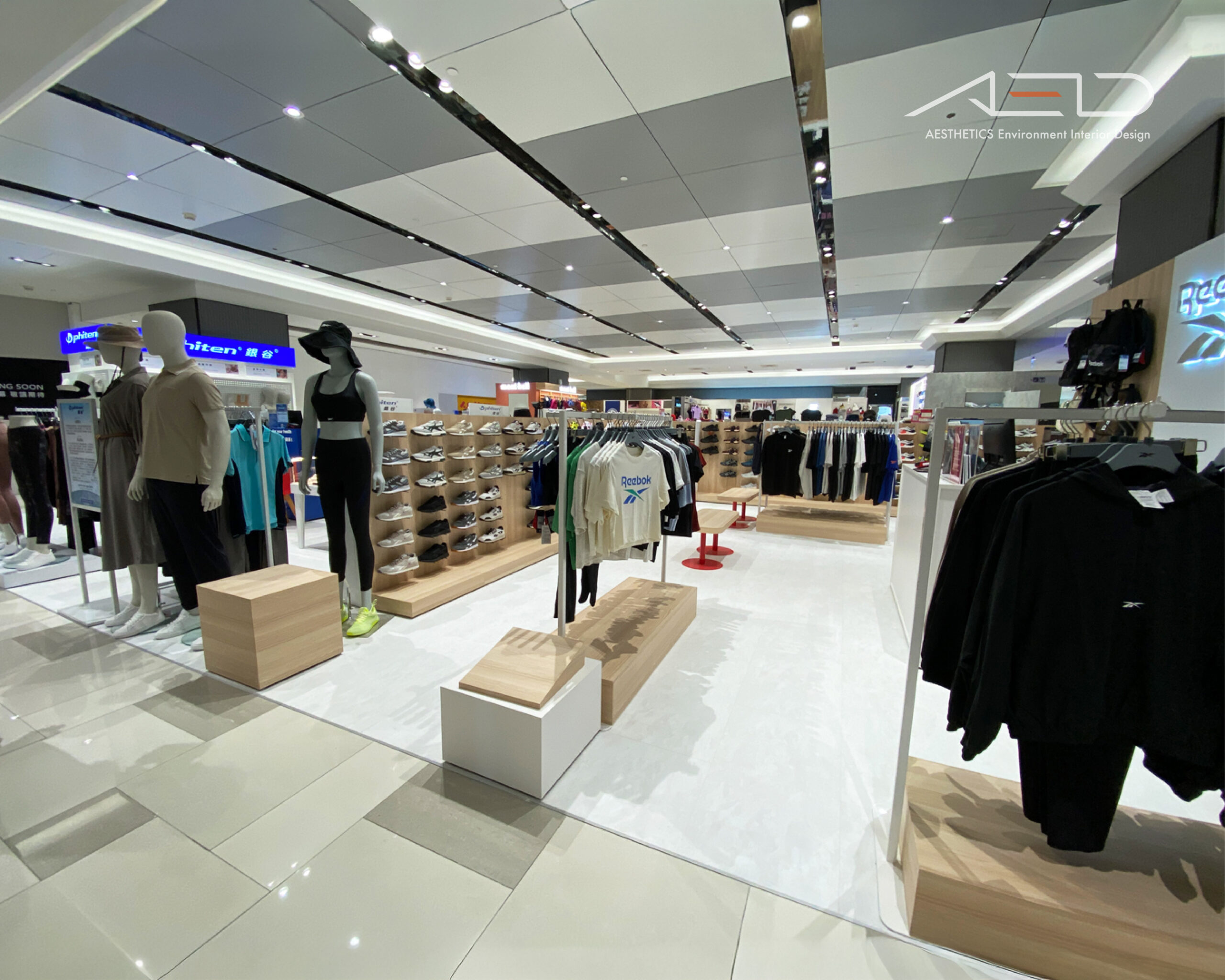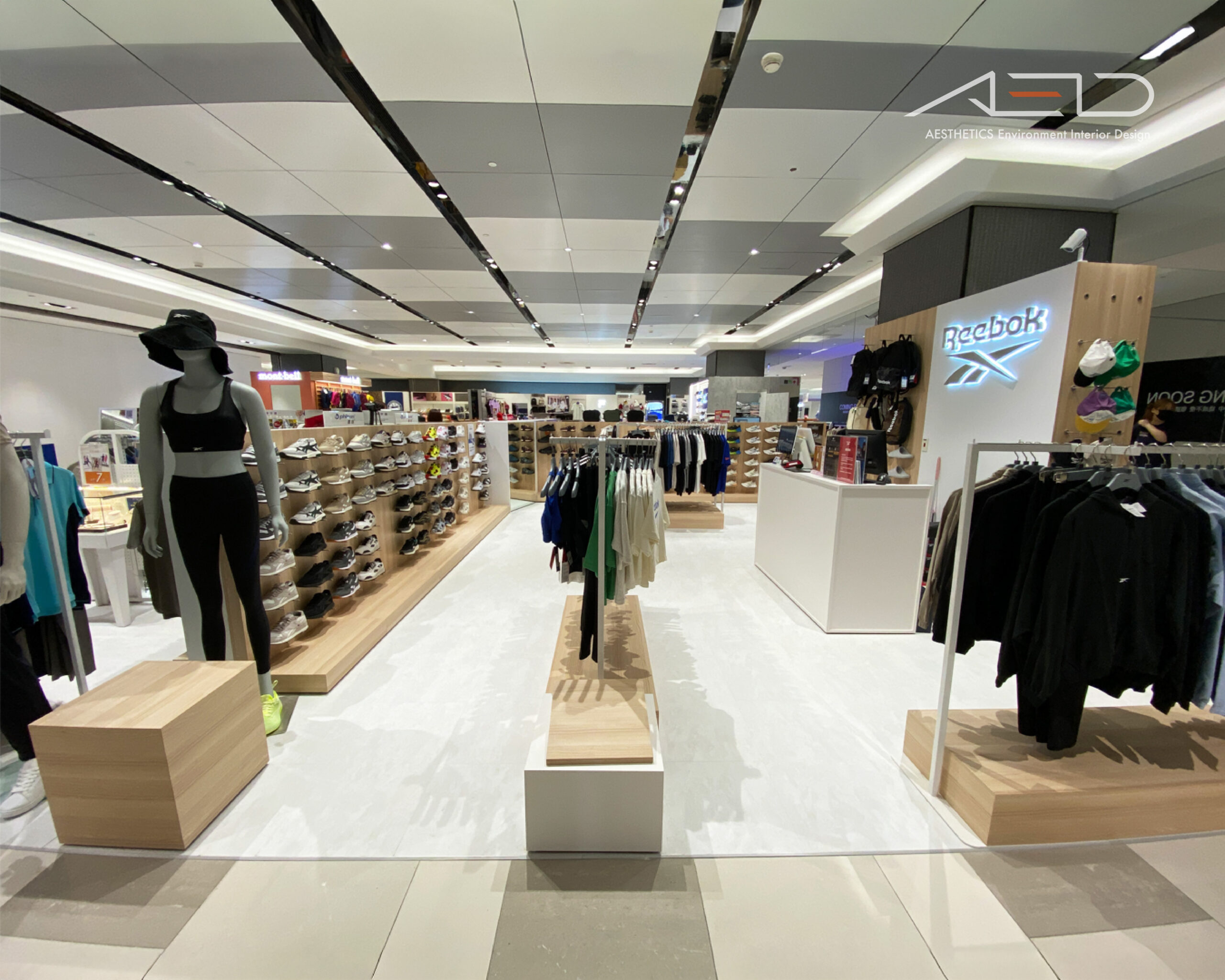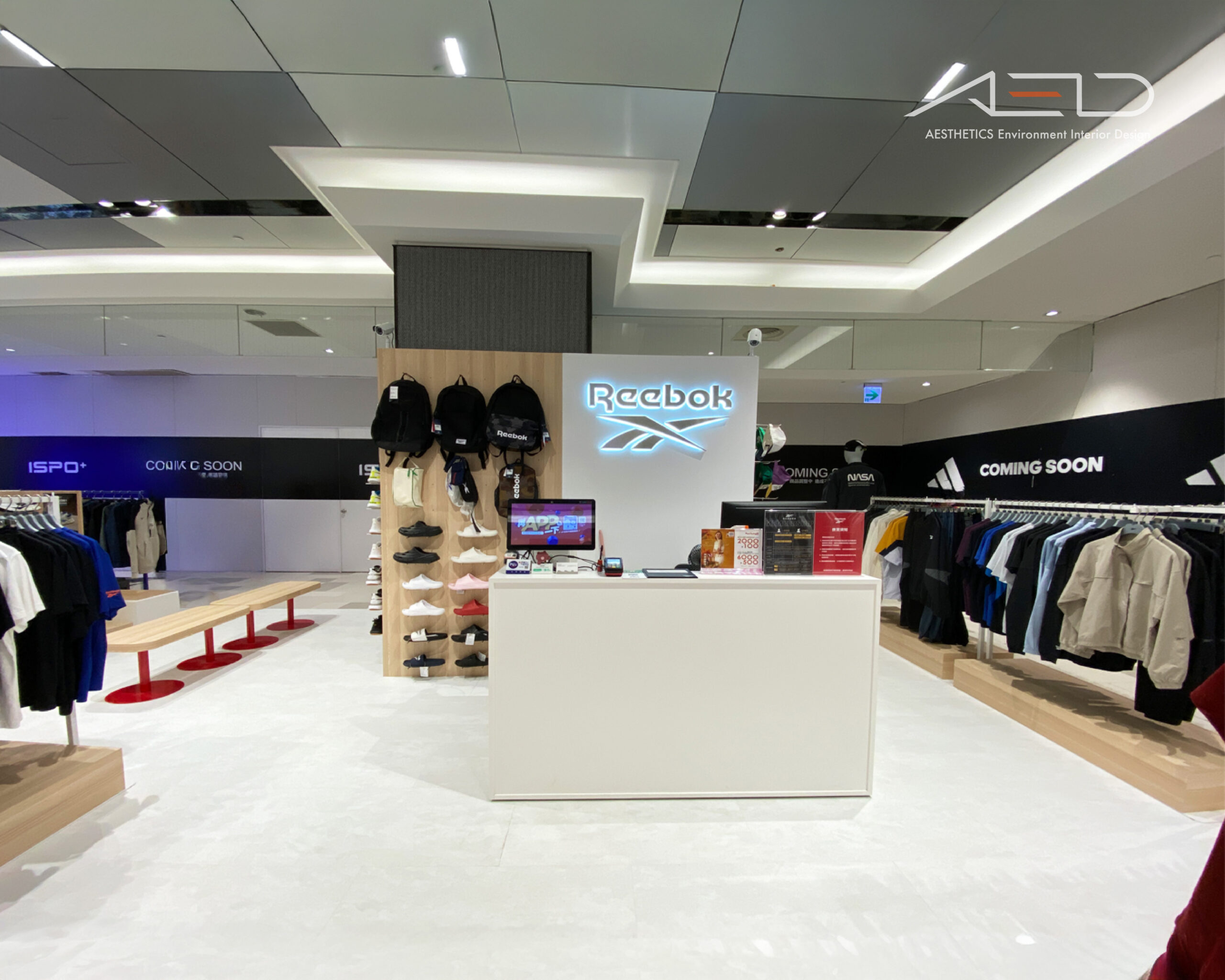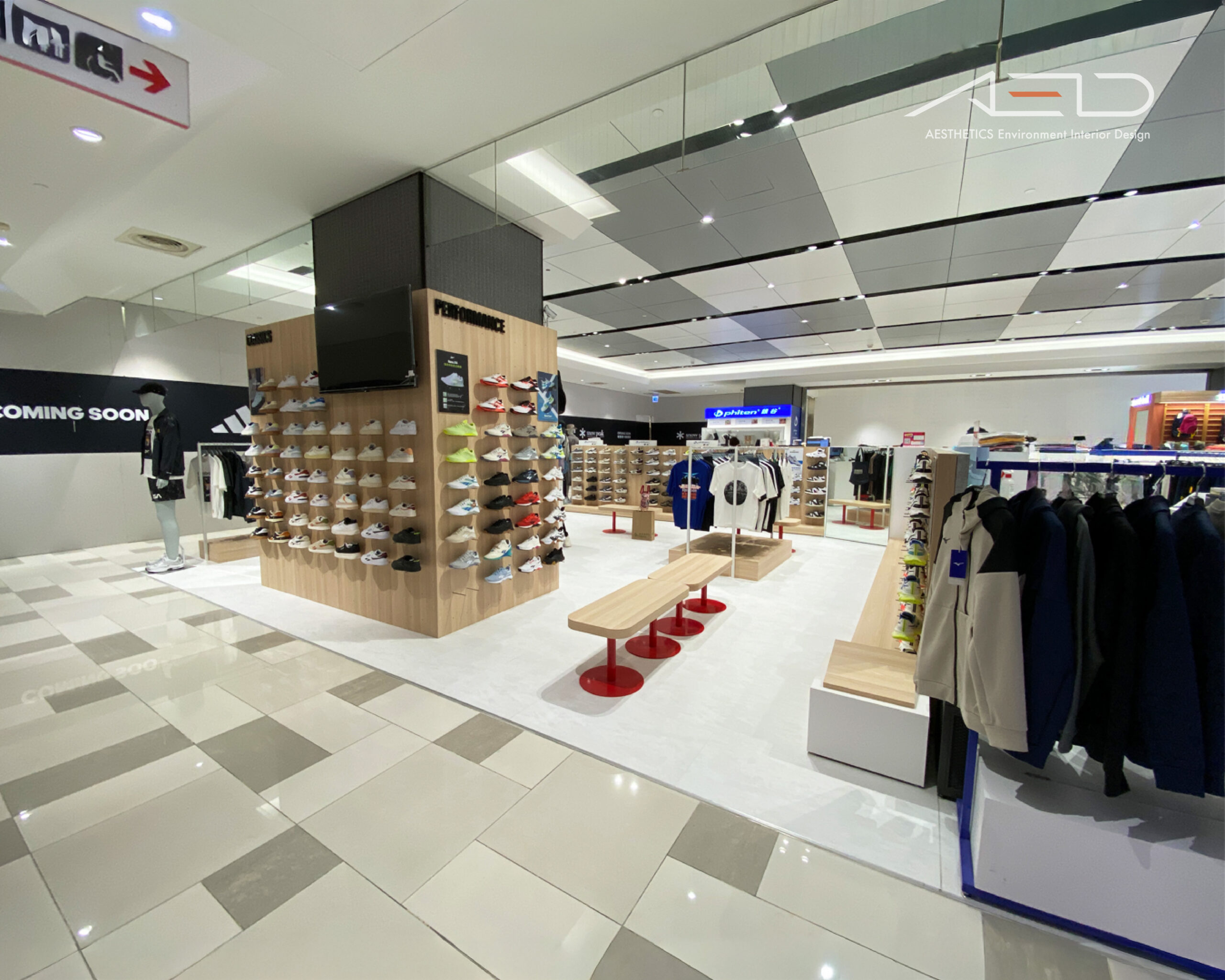 A central brand feature integrates the illuminated logo, accessory displays, and cashier counter, together with wooden benches on metal bases, a restrained material palette, and integrated lighting, the space delivers a bright, clean, and internationally styled sports retail environment.