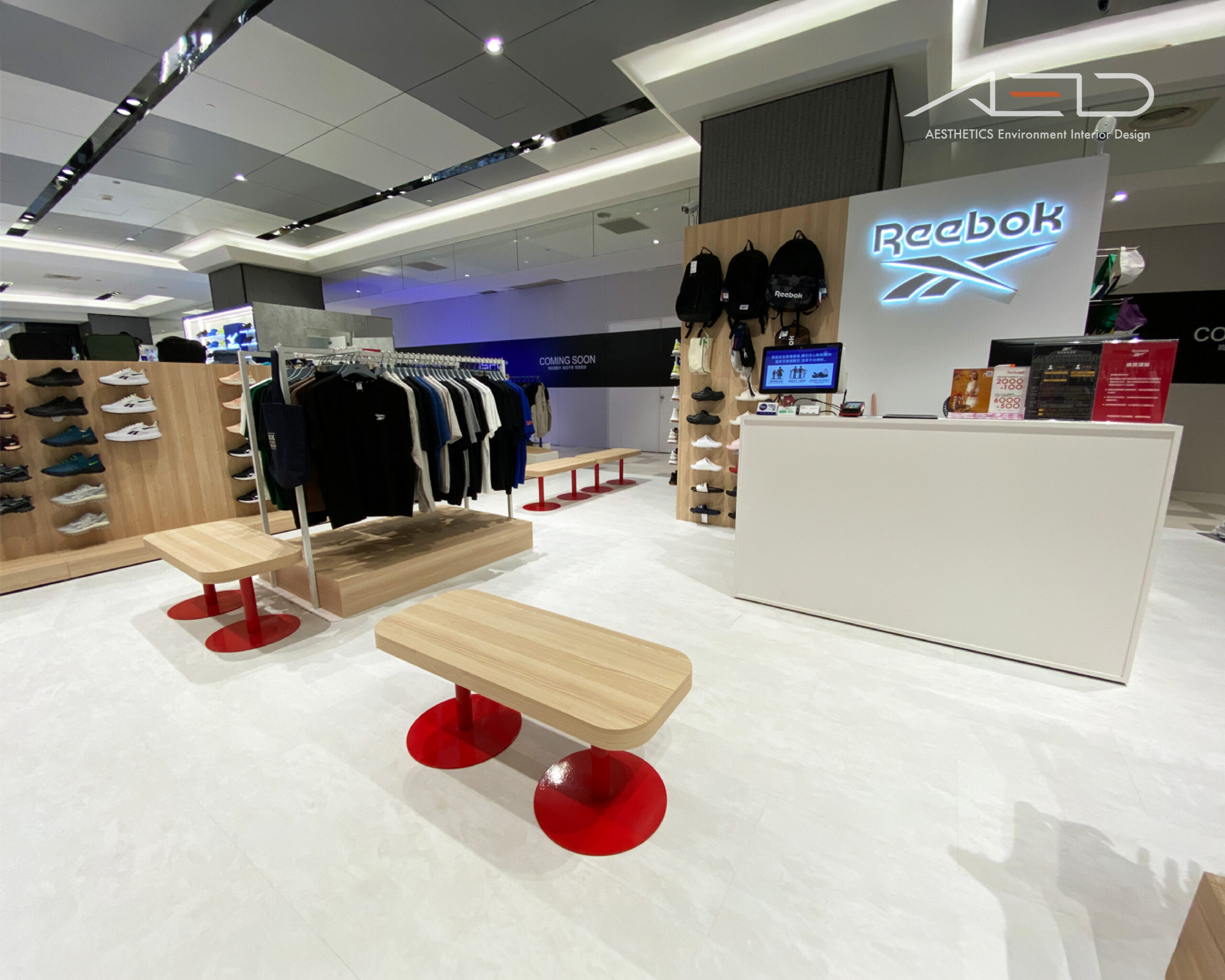 中央品牌展示柱結合發光 LOGO、配件展示架與收銀櫃檯,搭配木質座椅與金屬底座休憩平台,透過簡潔材質語彙與整合照明系統,營造明亮、俐落且具有國際感的運動零售空間。