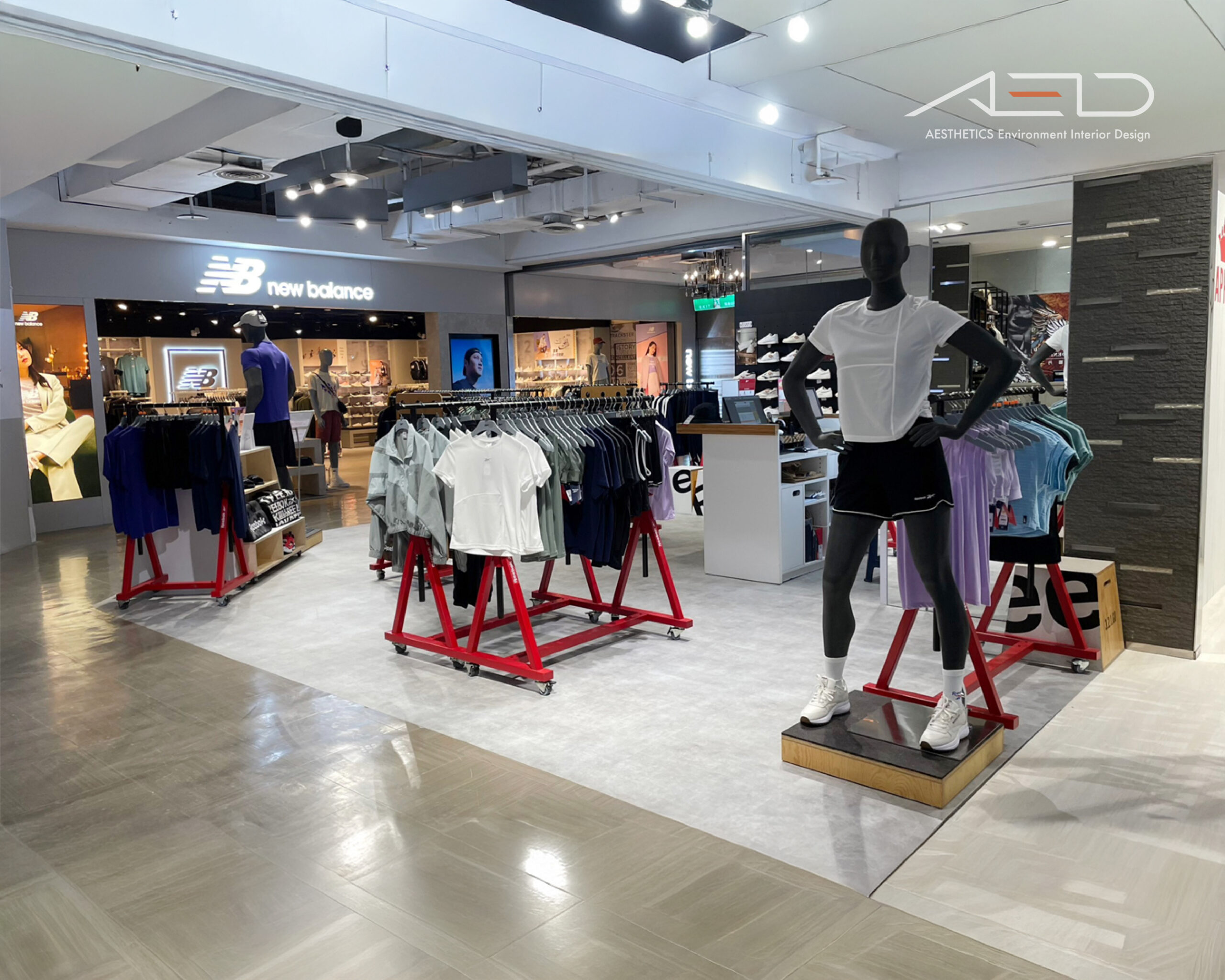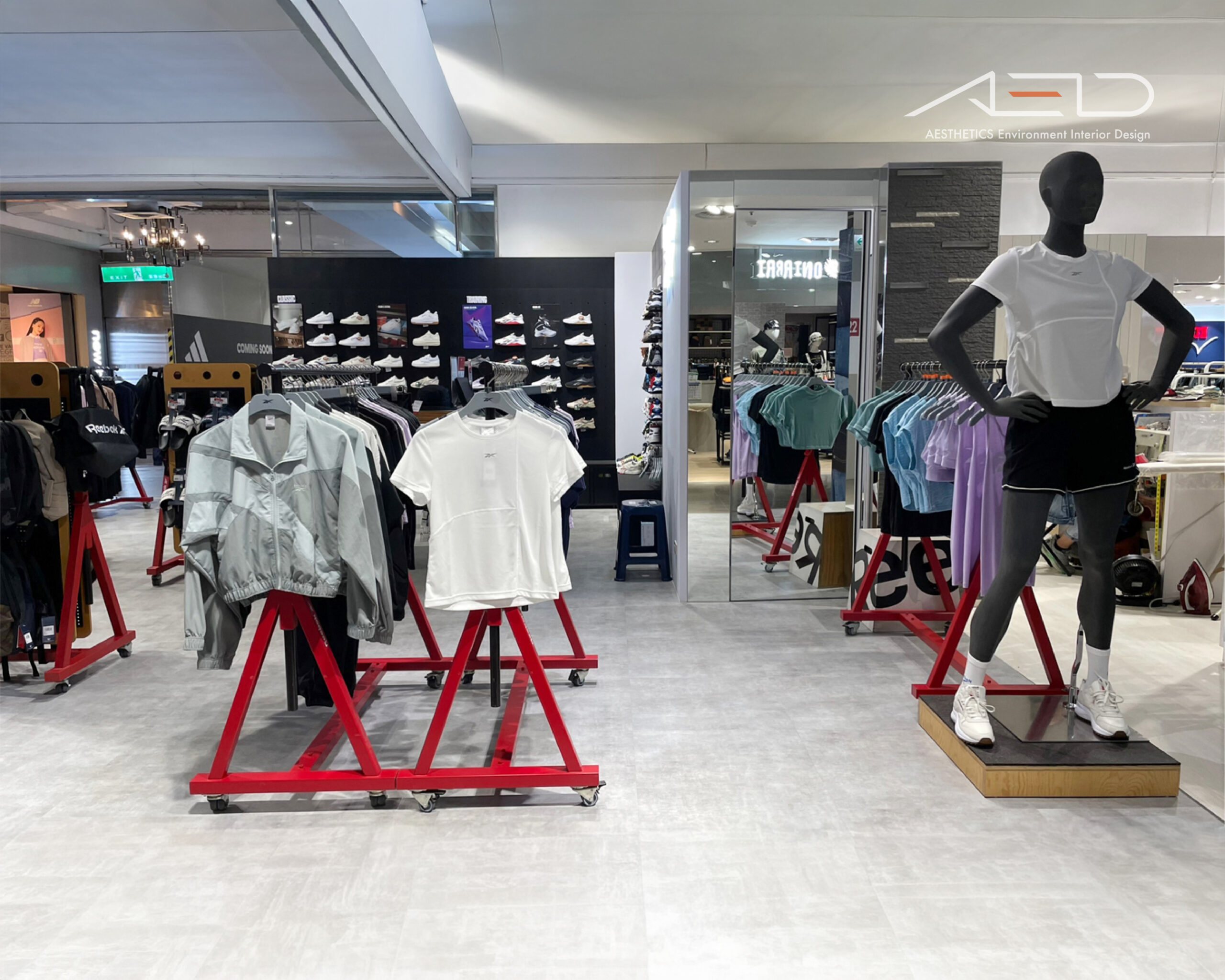Red metal display racks and mobile hanging systems organize the merchandising layout, mannequins, branded display tables, and accessory fixtures create a layered and rhythmic product presentation, while low platforms and branded display elements highlight featured products and new arrivals.