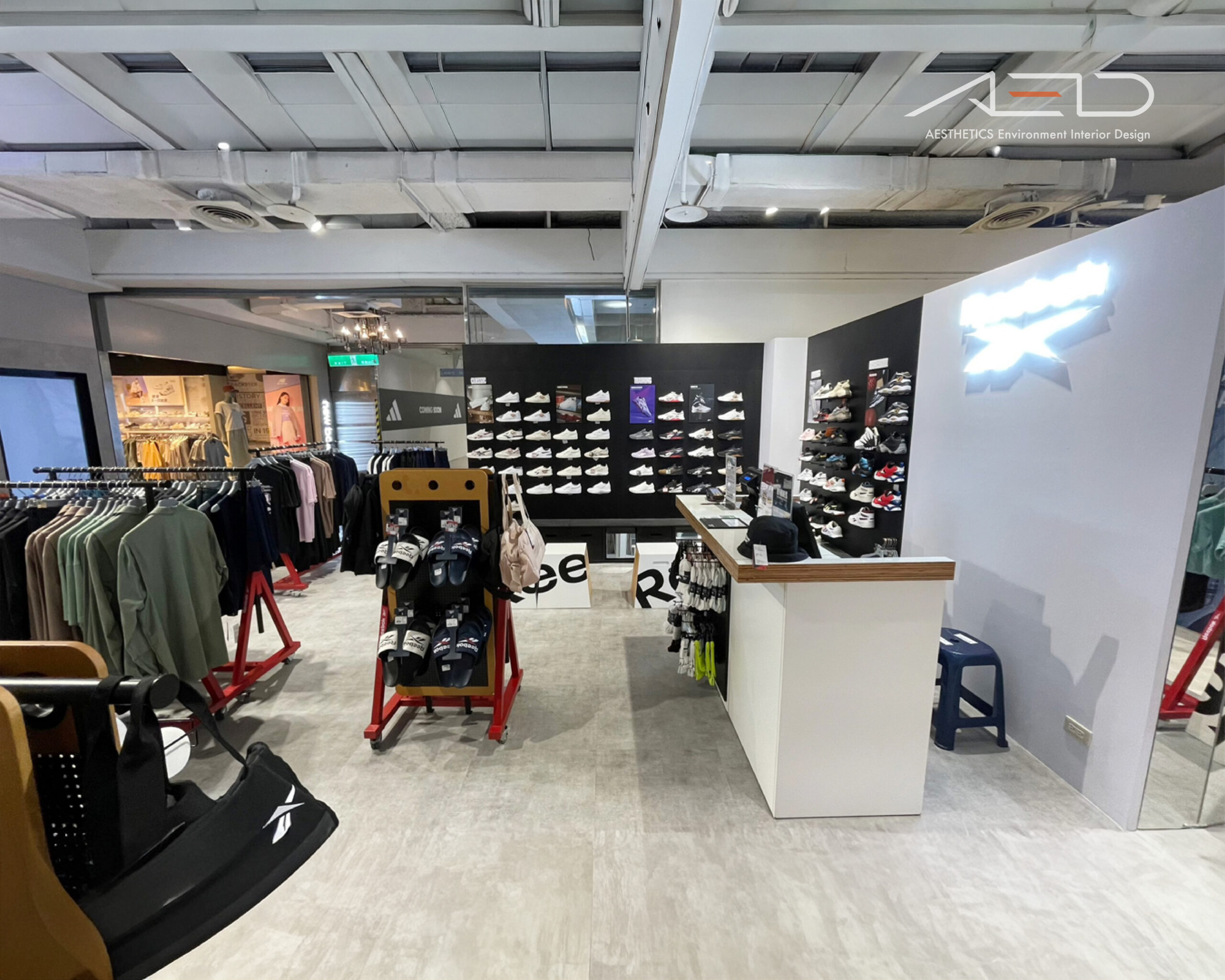 壁面整合黑色鞋牆展示系統與品牌形象燈箱,建立完整且清晰的產品展示背景;整體透過金屬陳列道具、簡潔材質語彙與軌道照明系統,營造俐落、開放且充滿運動能量的品牌零售空間。